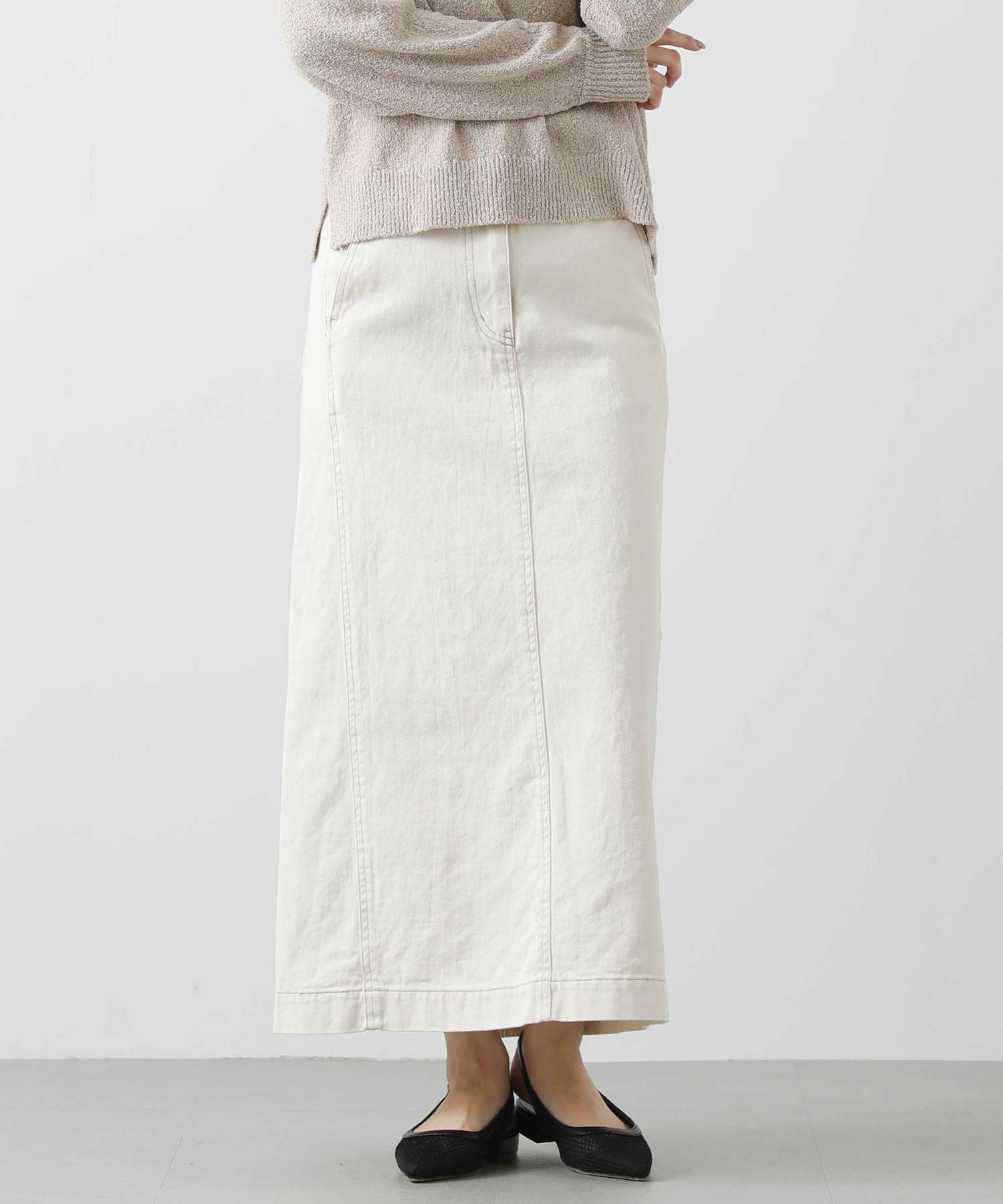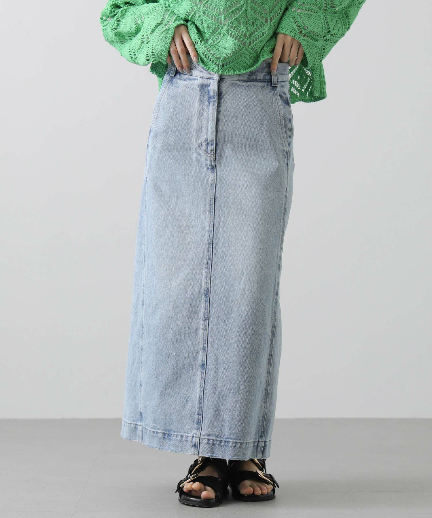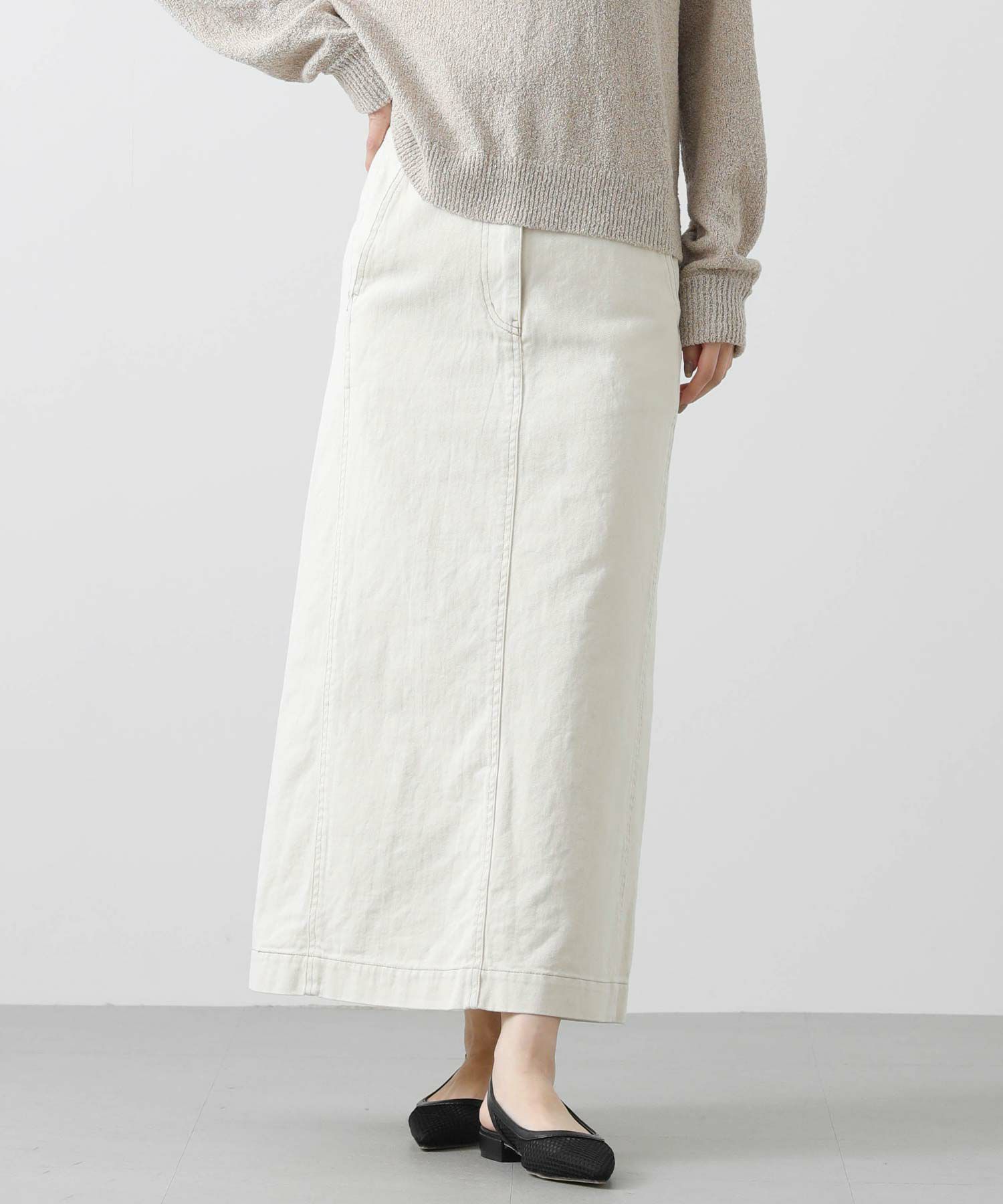 シャープなシルエットながら、程よいAラインで女性らしさをプラス。バックには深めのスリット入りで、足さばきも良く着用頂けます。着回し力抜群なデニムスカートはロングシーズン楽しめるアイテムなので、一枚あると重宝すること間違いなし。