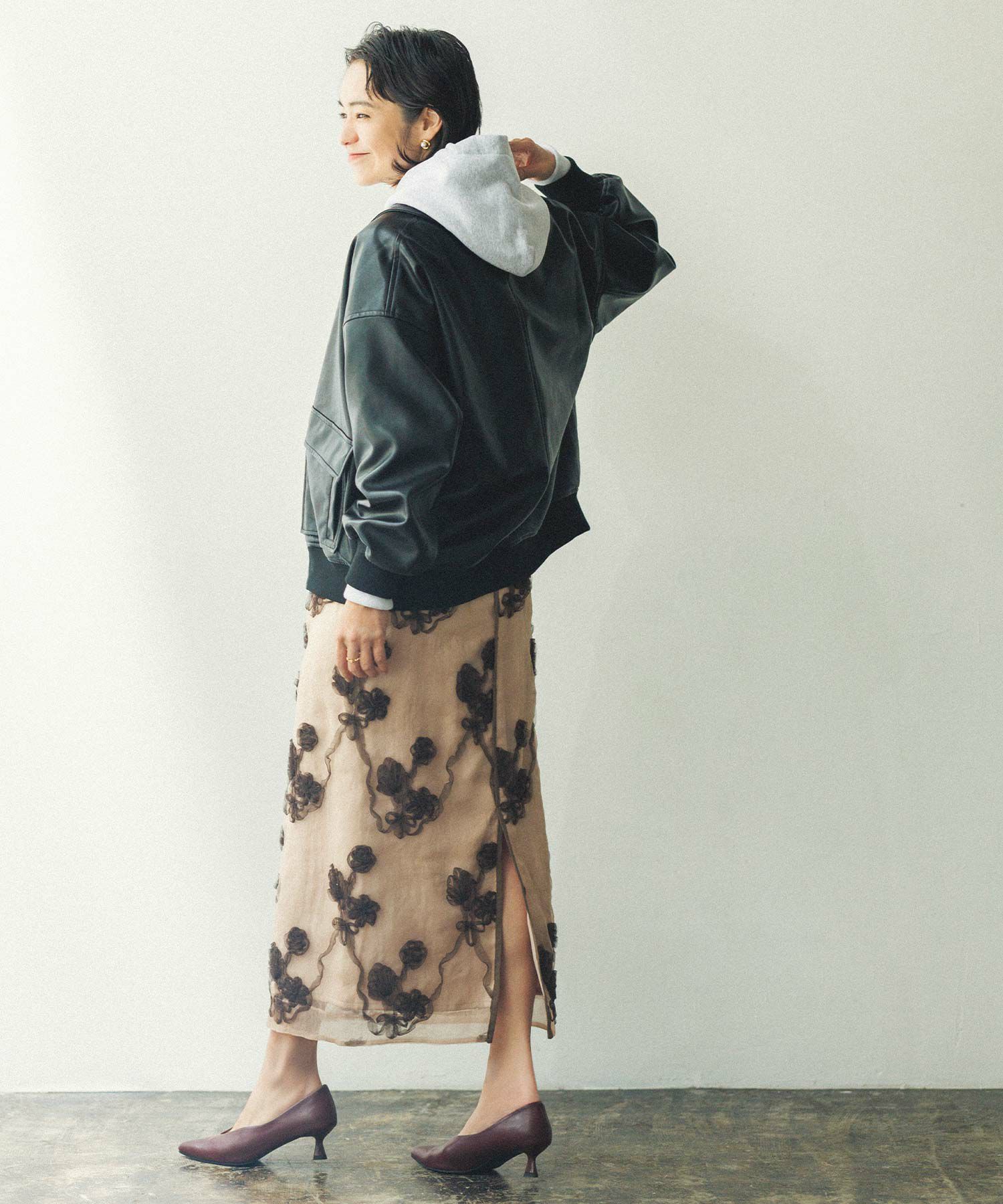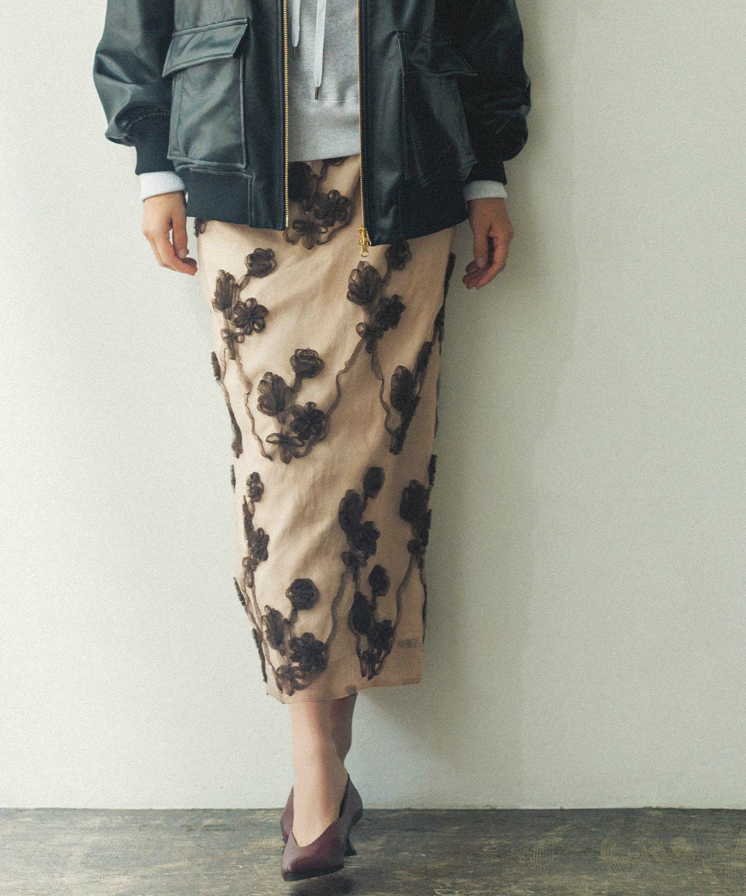 印象的なブーケモチーフの刺繍が、華やかで特別感のあるスカート。