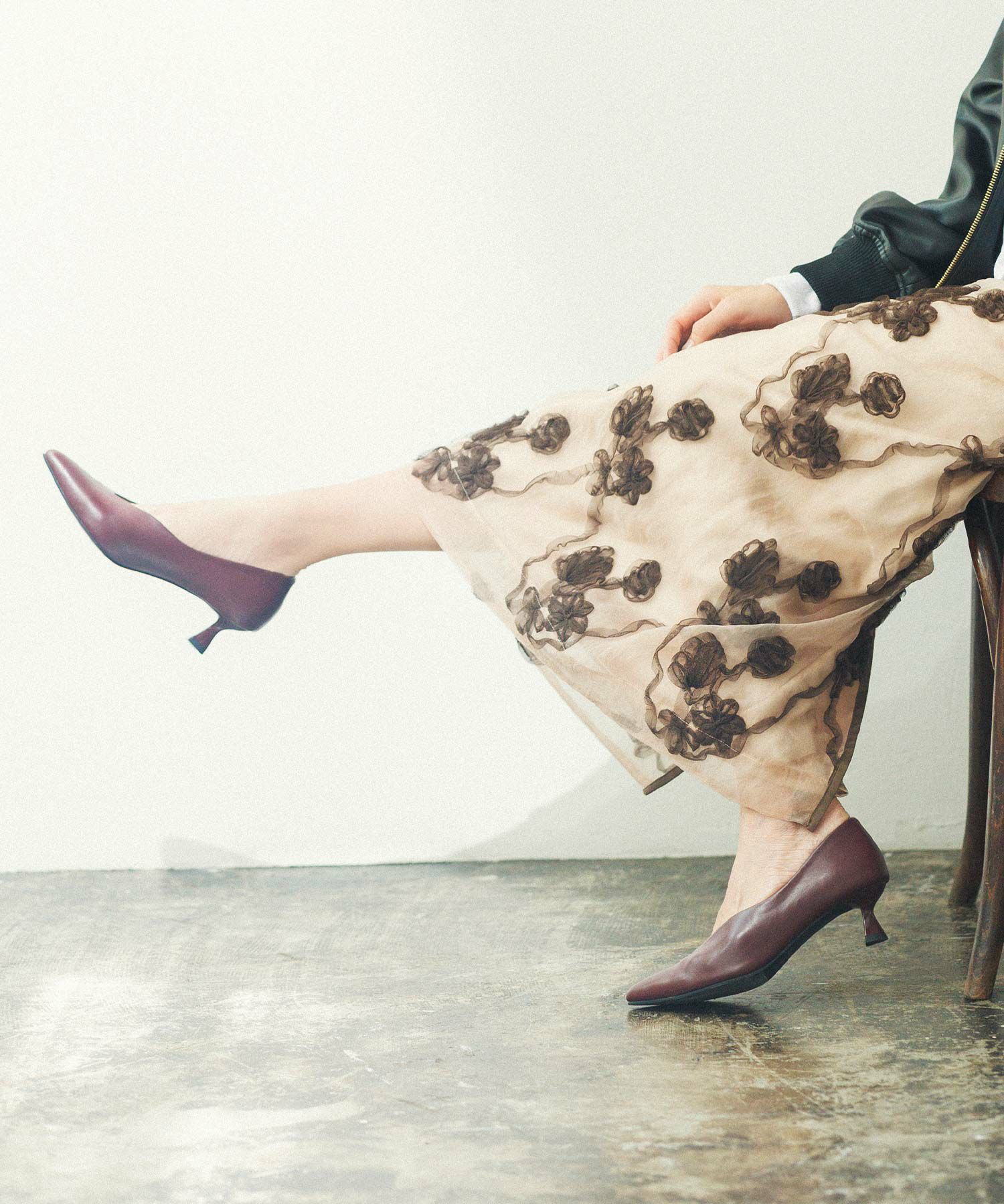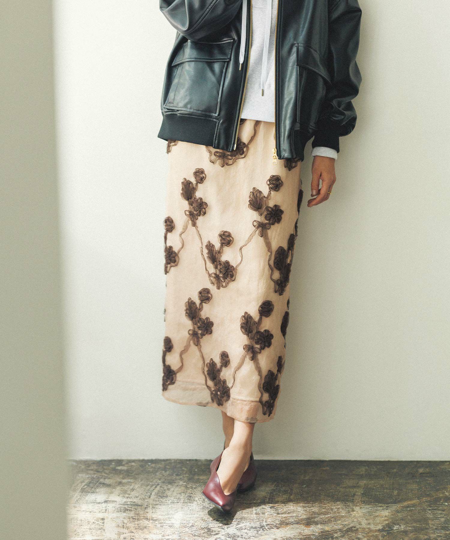 オーガンジーにチュールで刺繍を施した立体感のある素材が、スタイリングにアクセントをつけてくれます。ウエストはグログランテープを使用して、インスタイルも決まるデザインになっています。