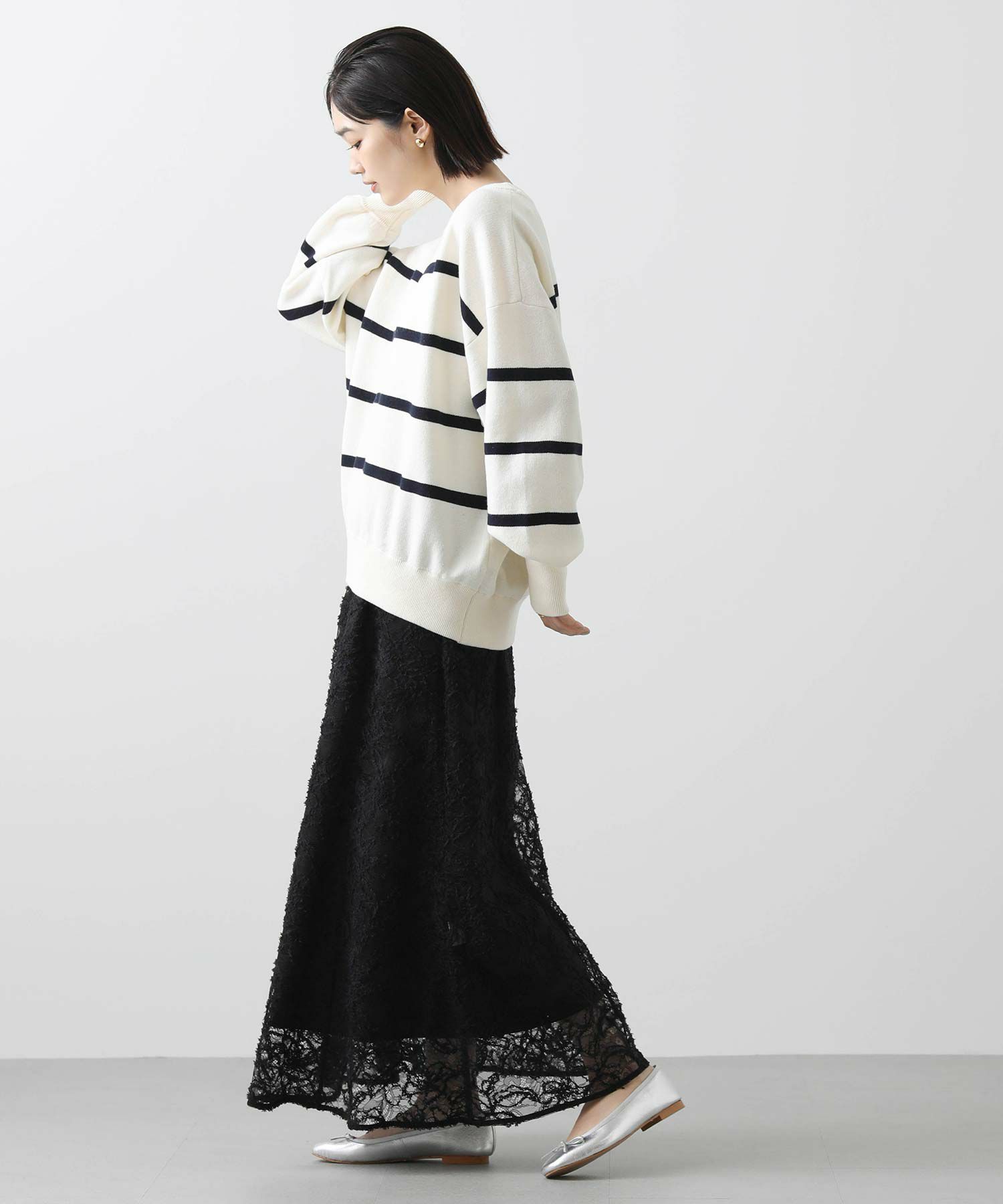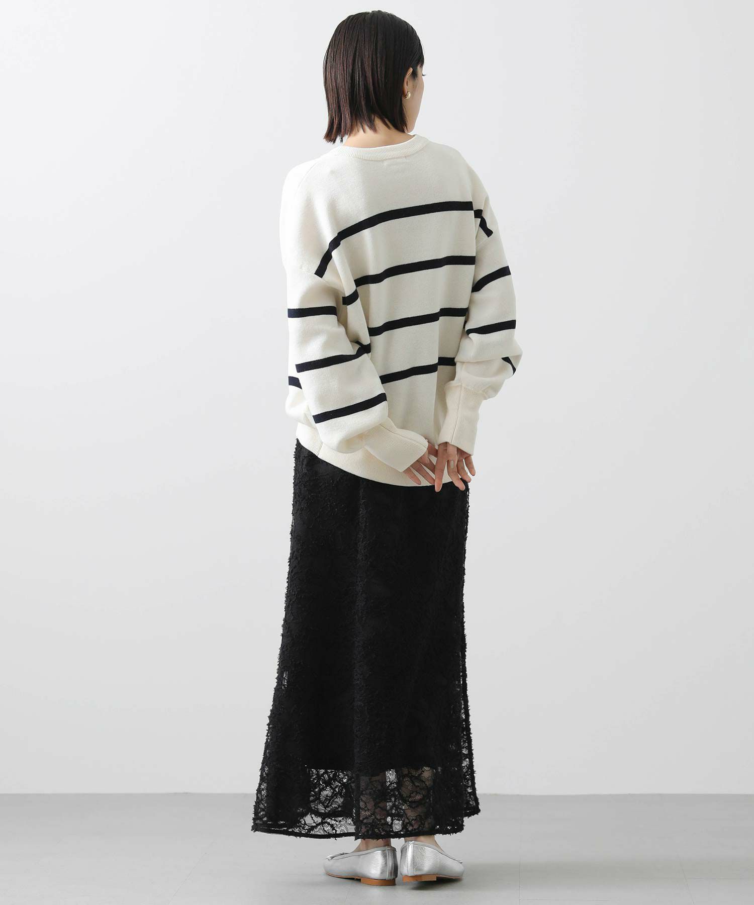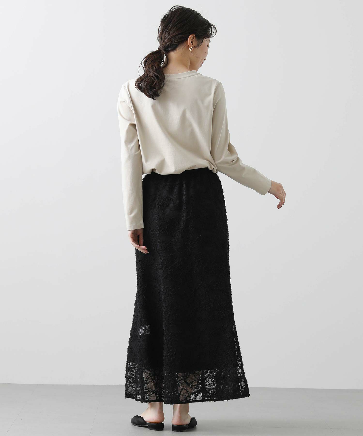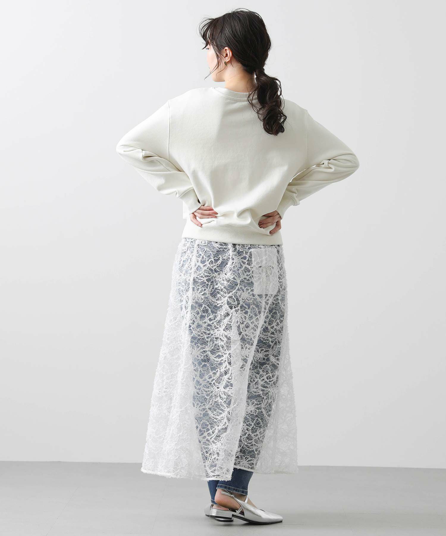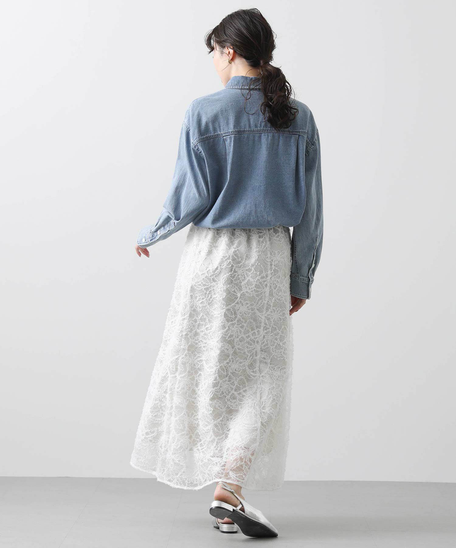 シルエットは程よいマーメイドラインで、女性らしい一着です。レーススカートと、裏地が別々になっているので、レーススカートをデニムやスラックスに重ねて、今年らしいレイヤードスタイルをお楽しみいただけます。