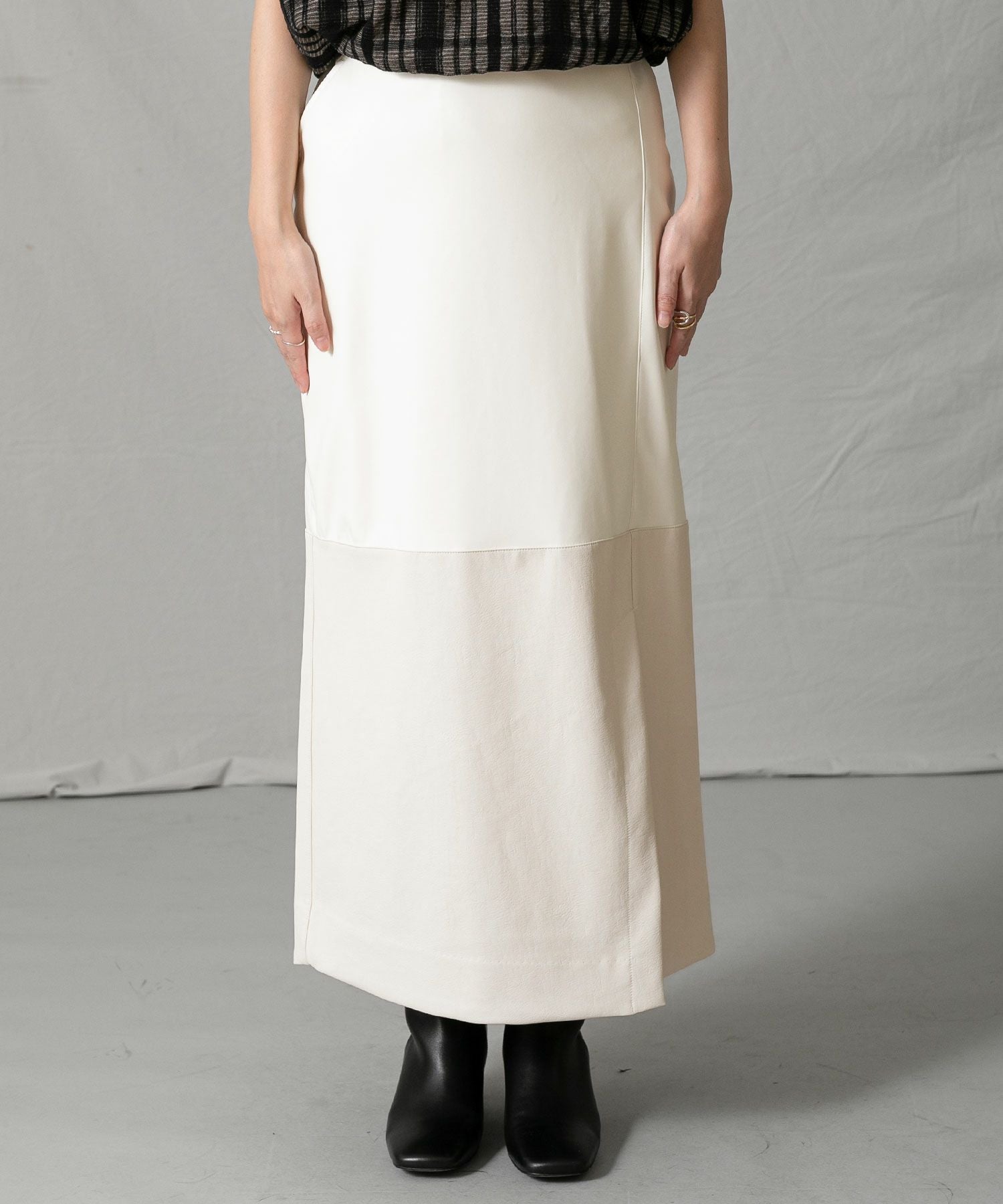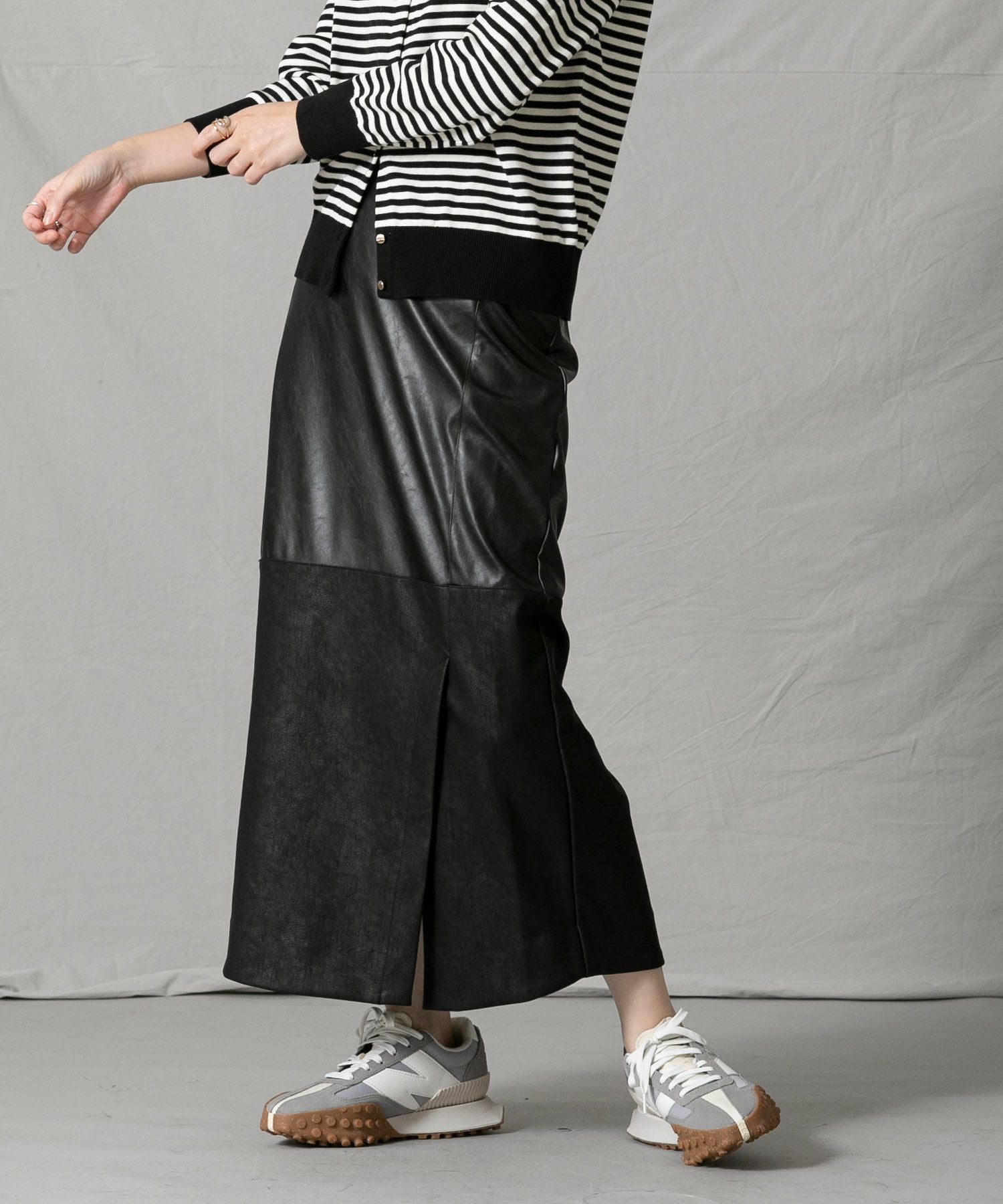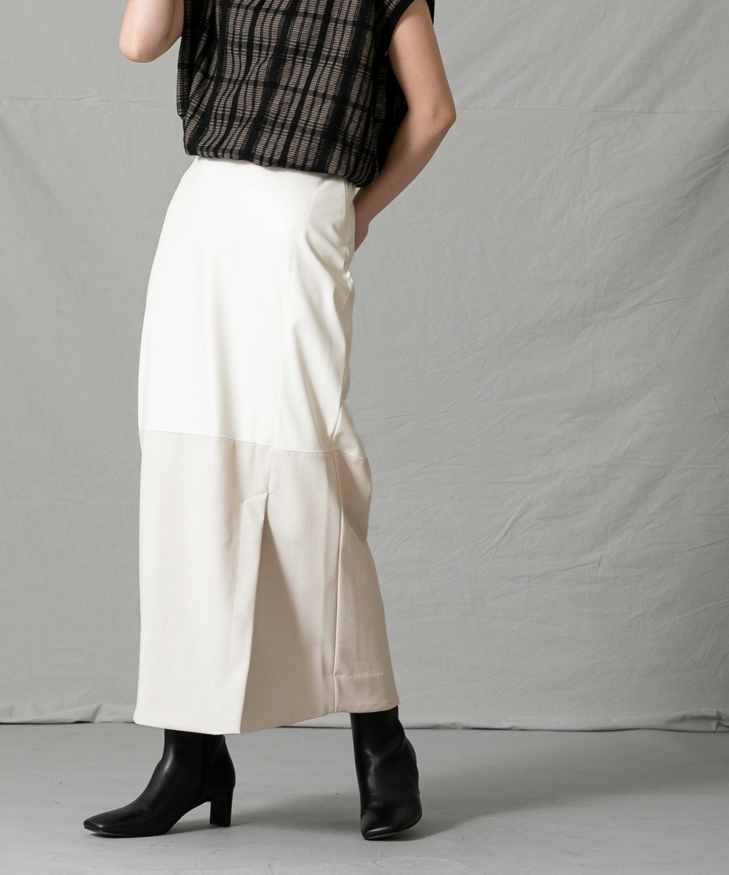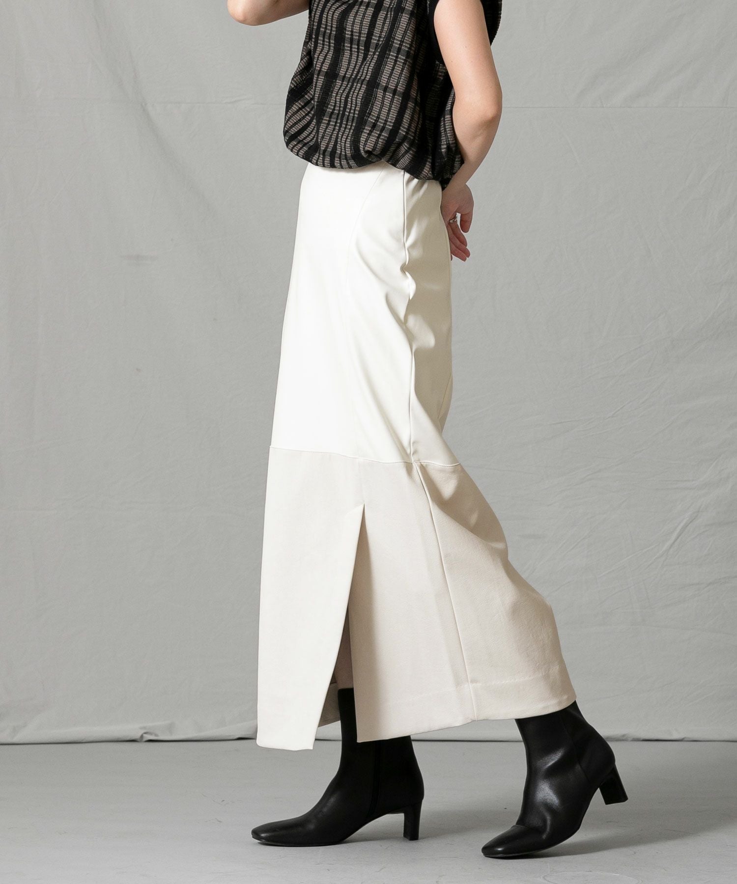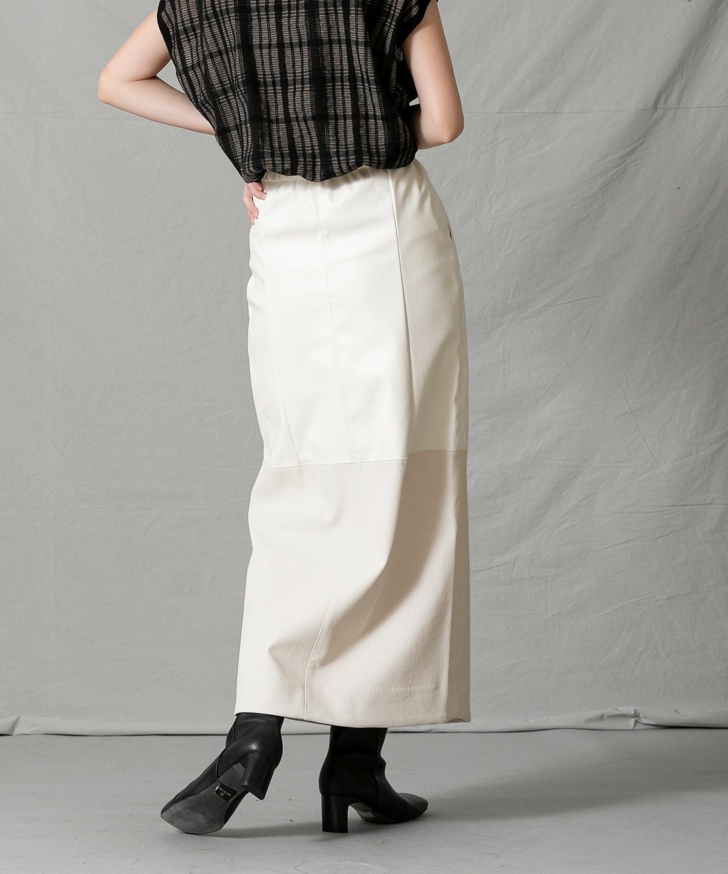 「Torrazzo Donna」から、 二種類のエコレザーを使ったモードな印象のタイトスカートをセレクト。