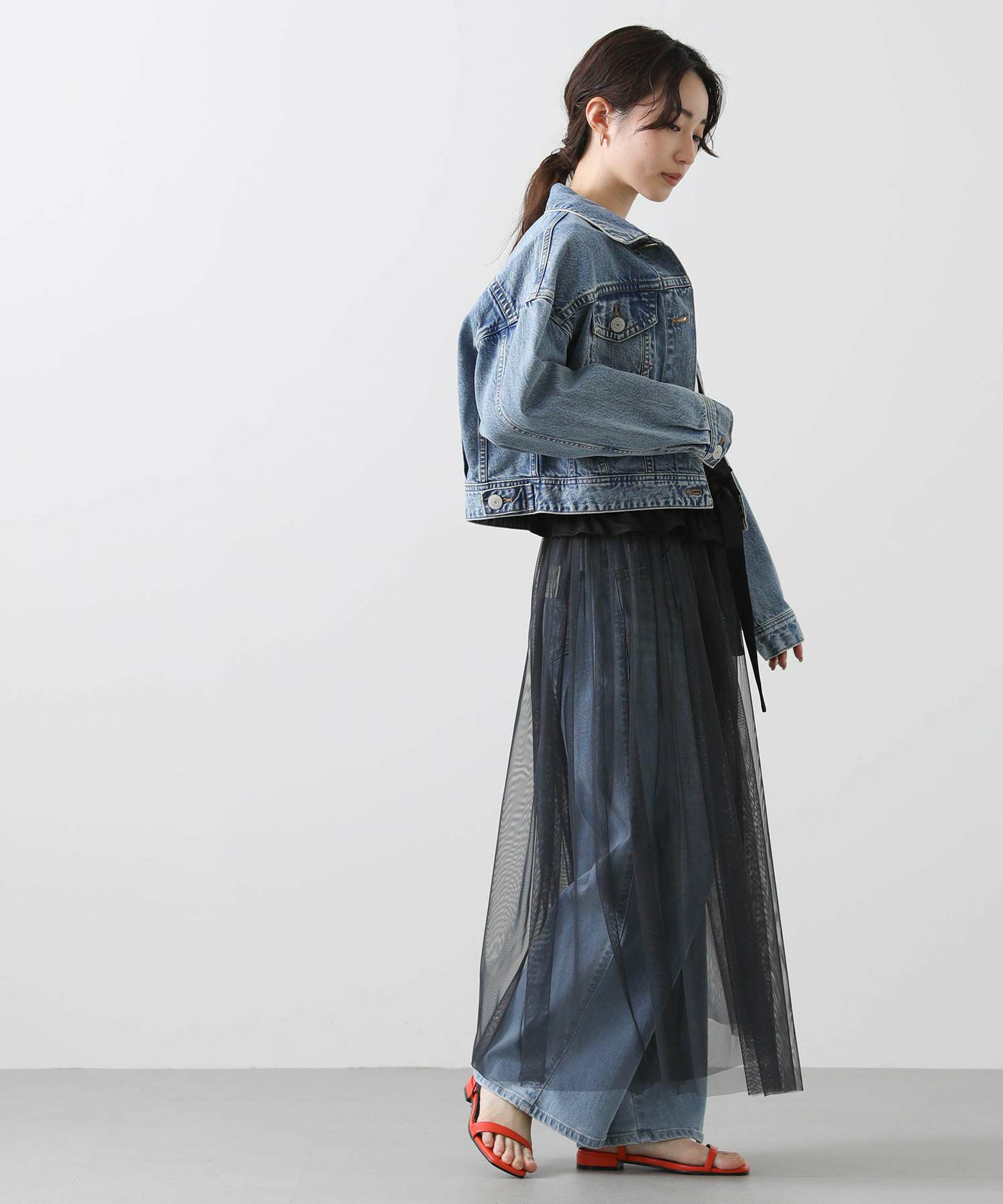 ウエスト部分にデザインされたペプラムベルトがスタイルを引き締め、女性らしいシルエットを強調します。軽やかなチュール素材がスカートに動きとボリュームを与え、エレガントな雰囲気を演出。ペチコートなしでデニムなどに合わせたレイヤードコーディネートもおすすめです。