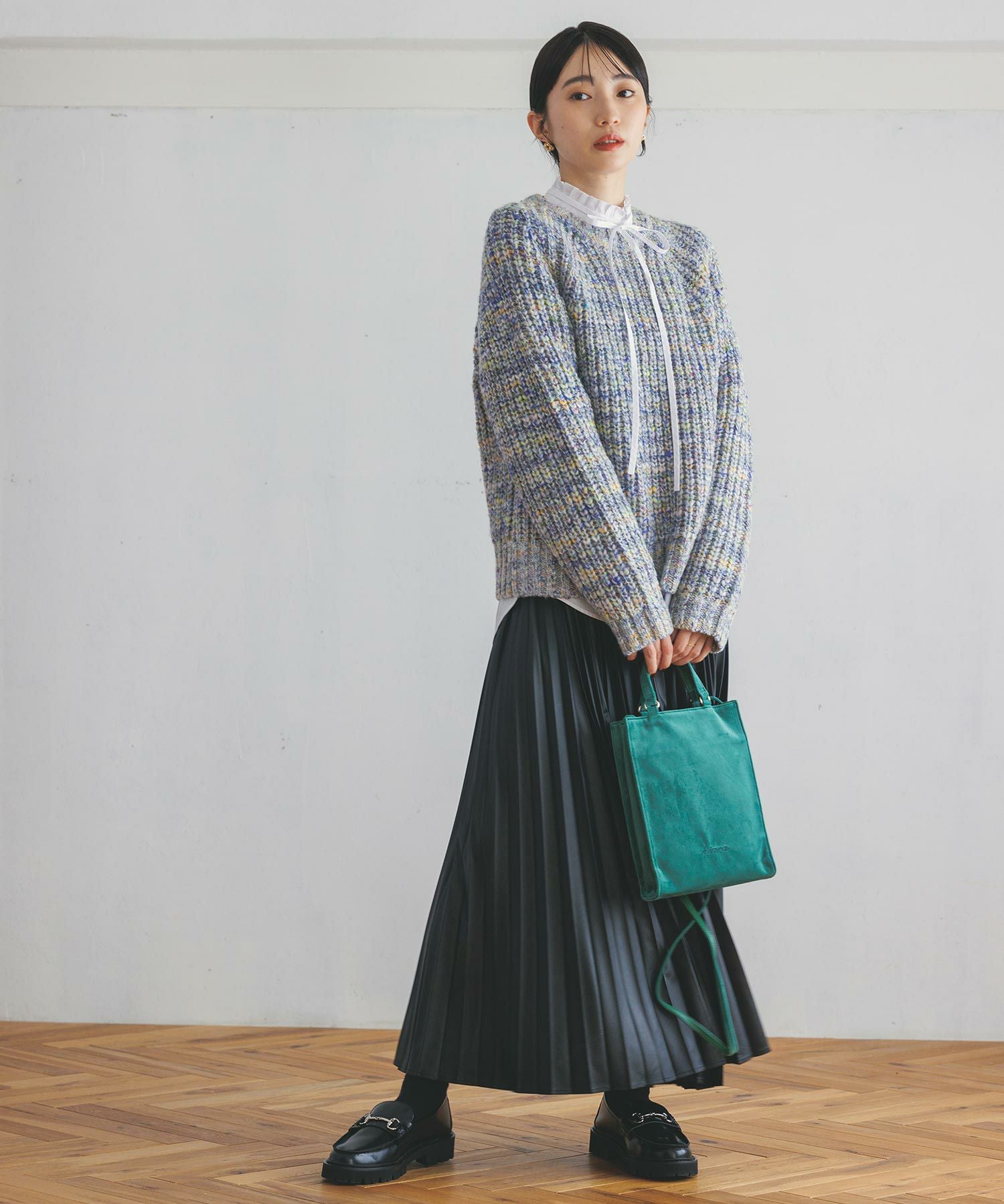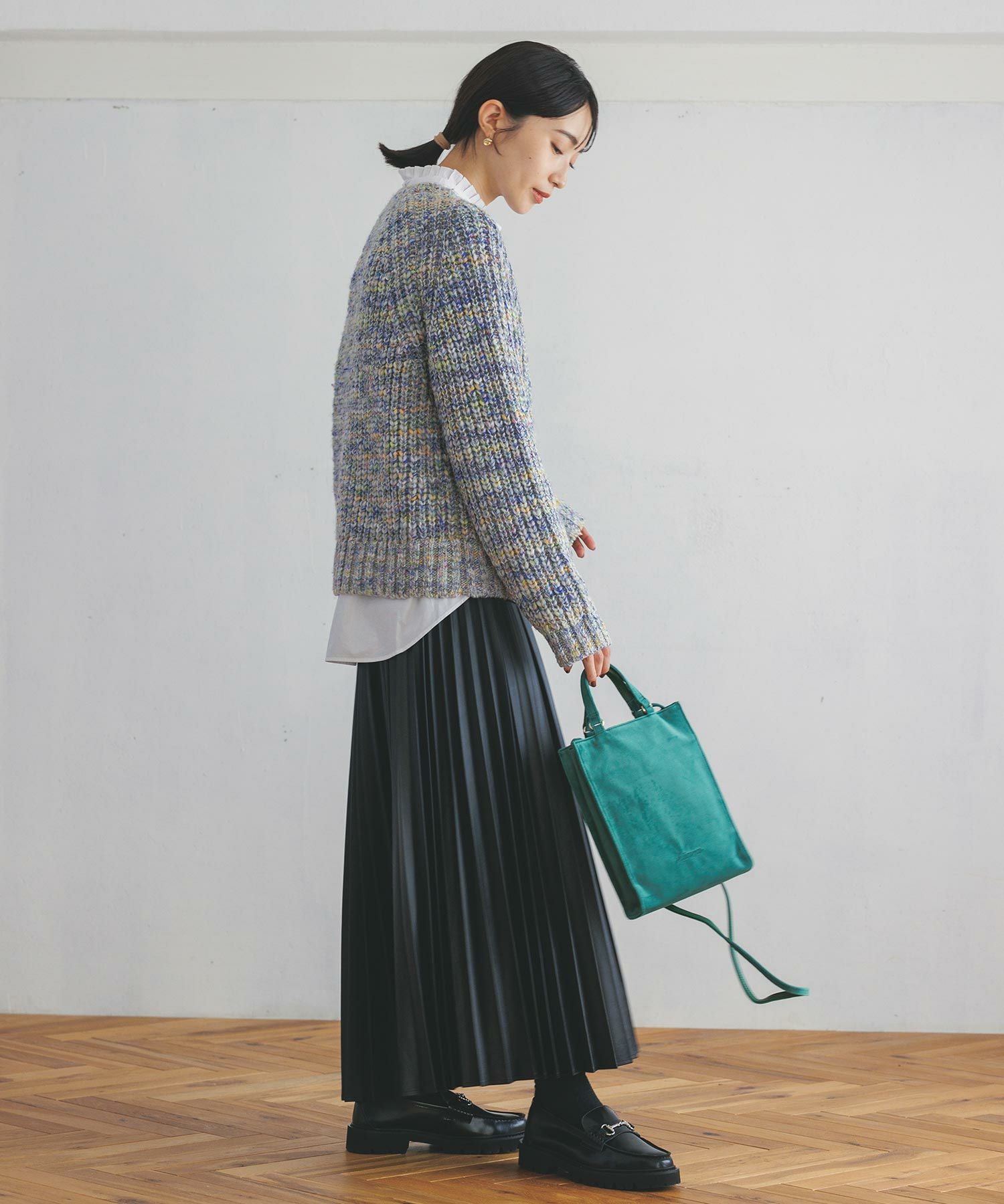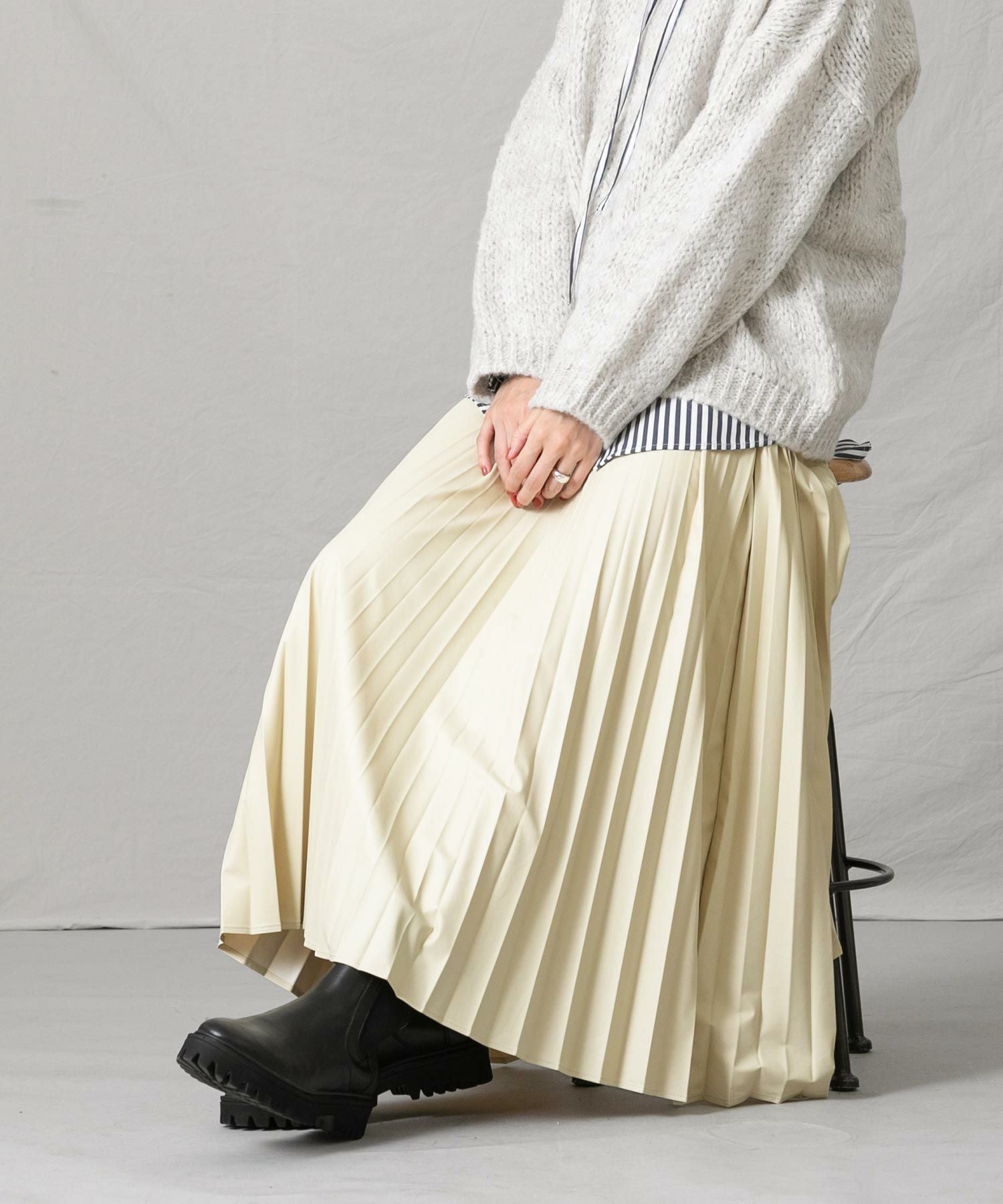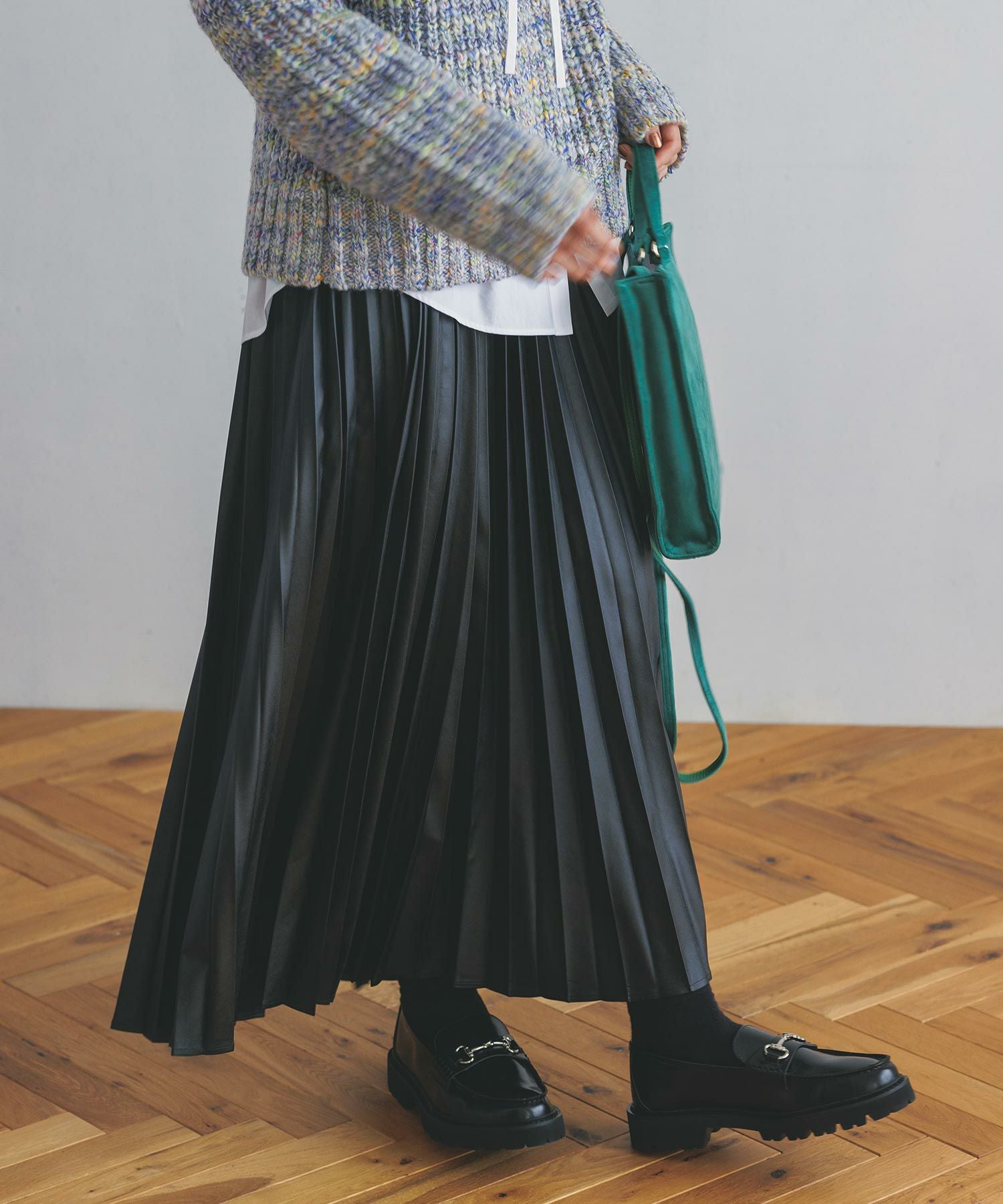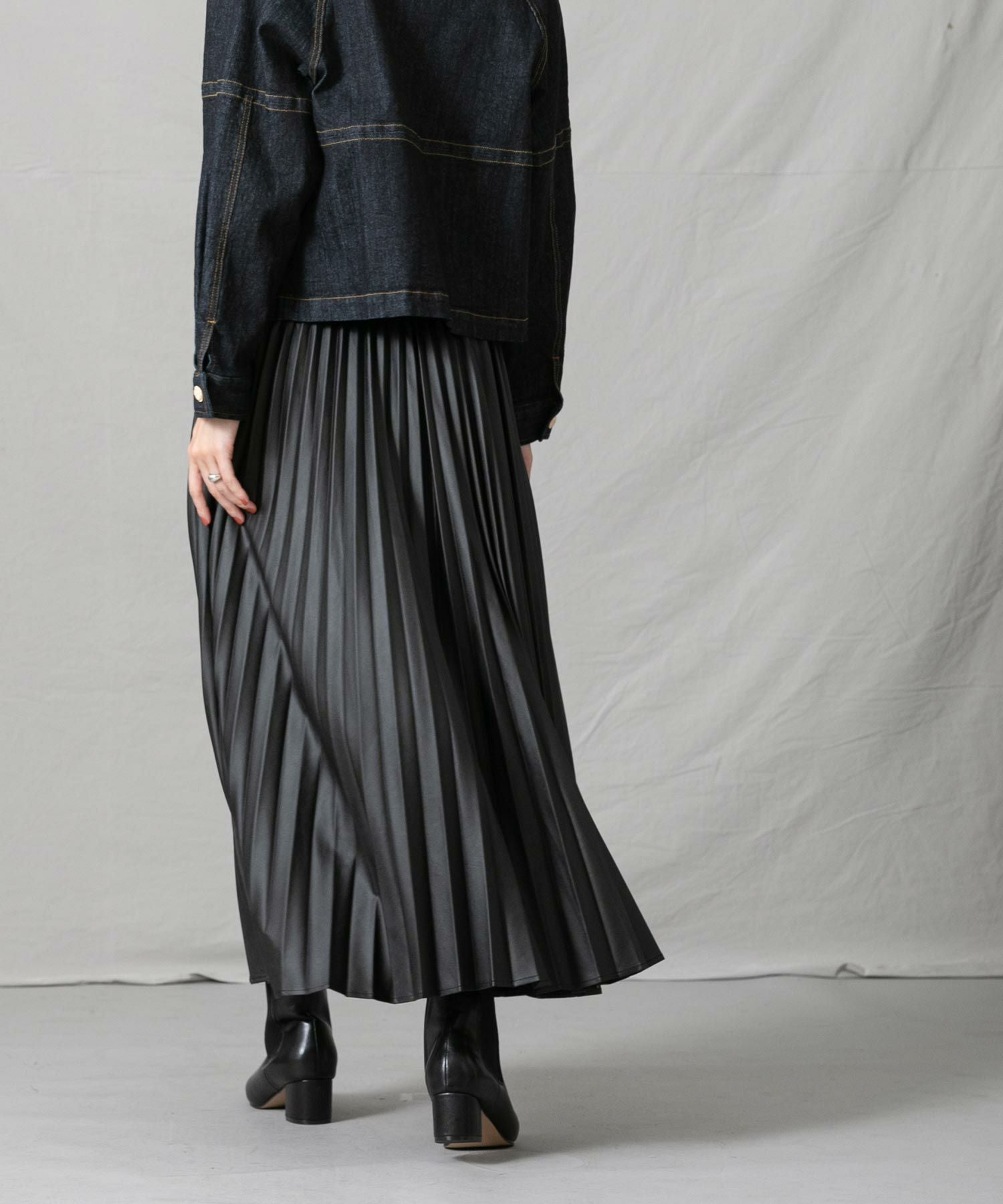 甘さを抑えた大人な仕上がりのエコレザープリーツスカートをセレクトしました。