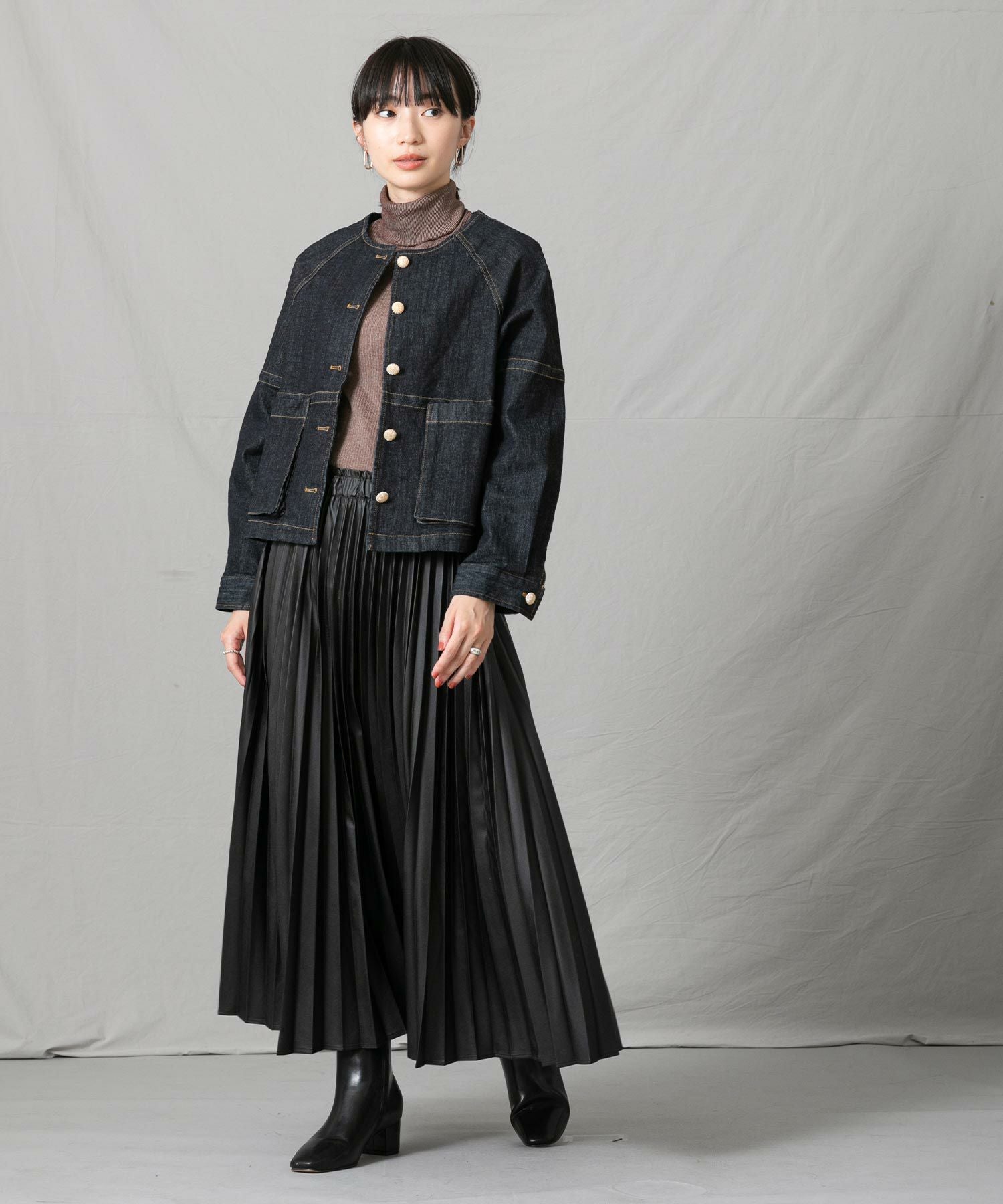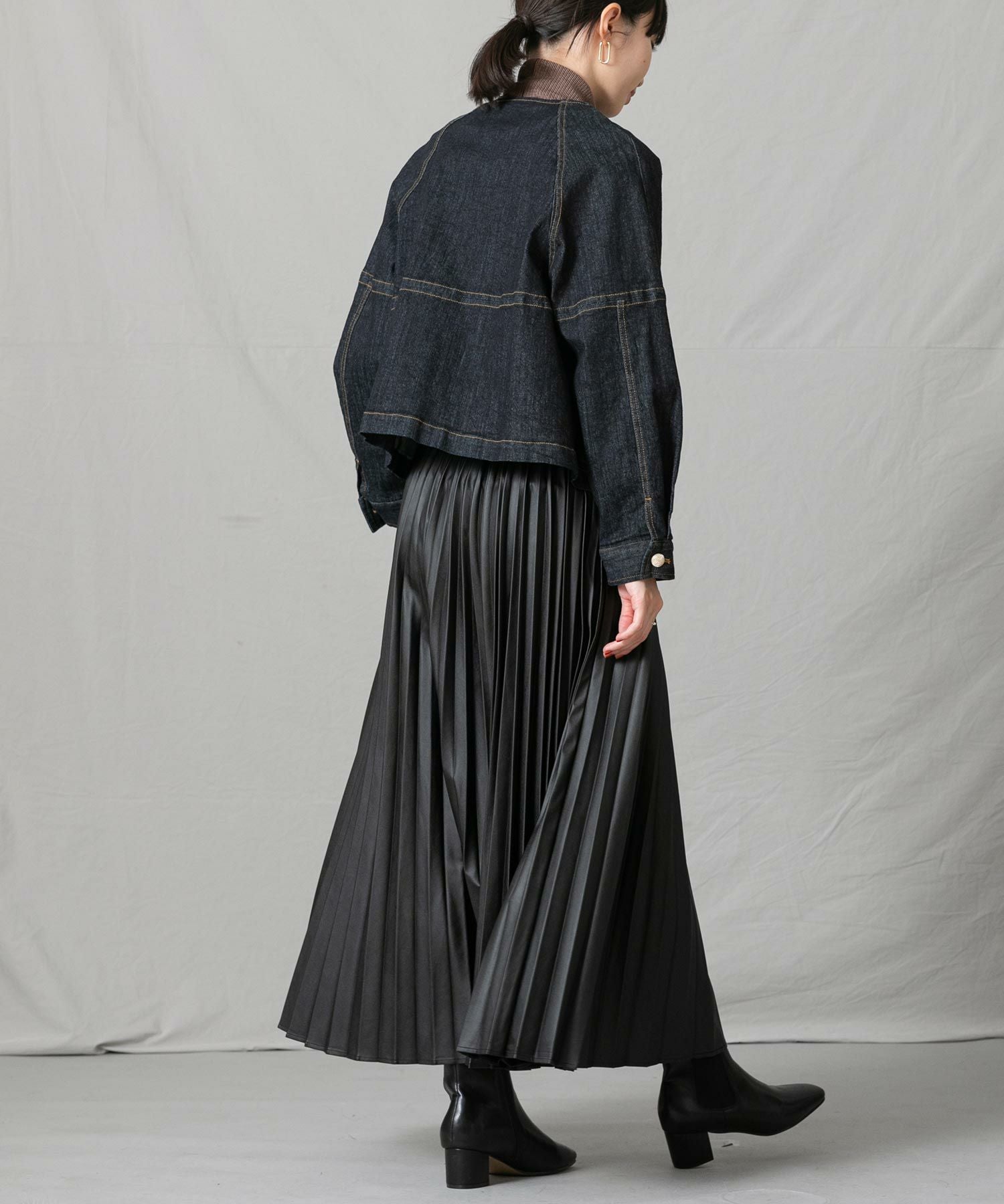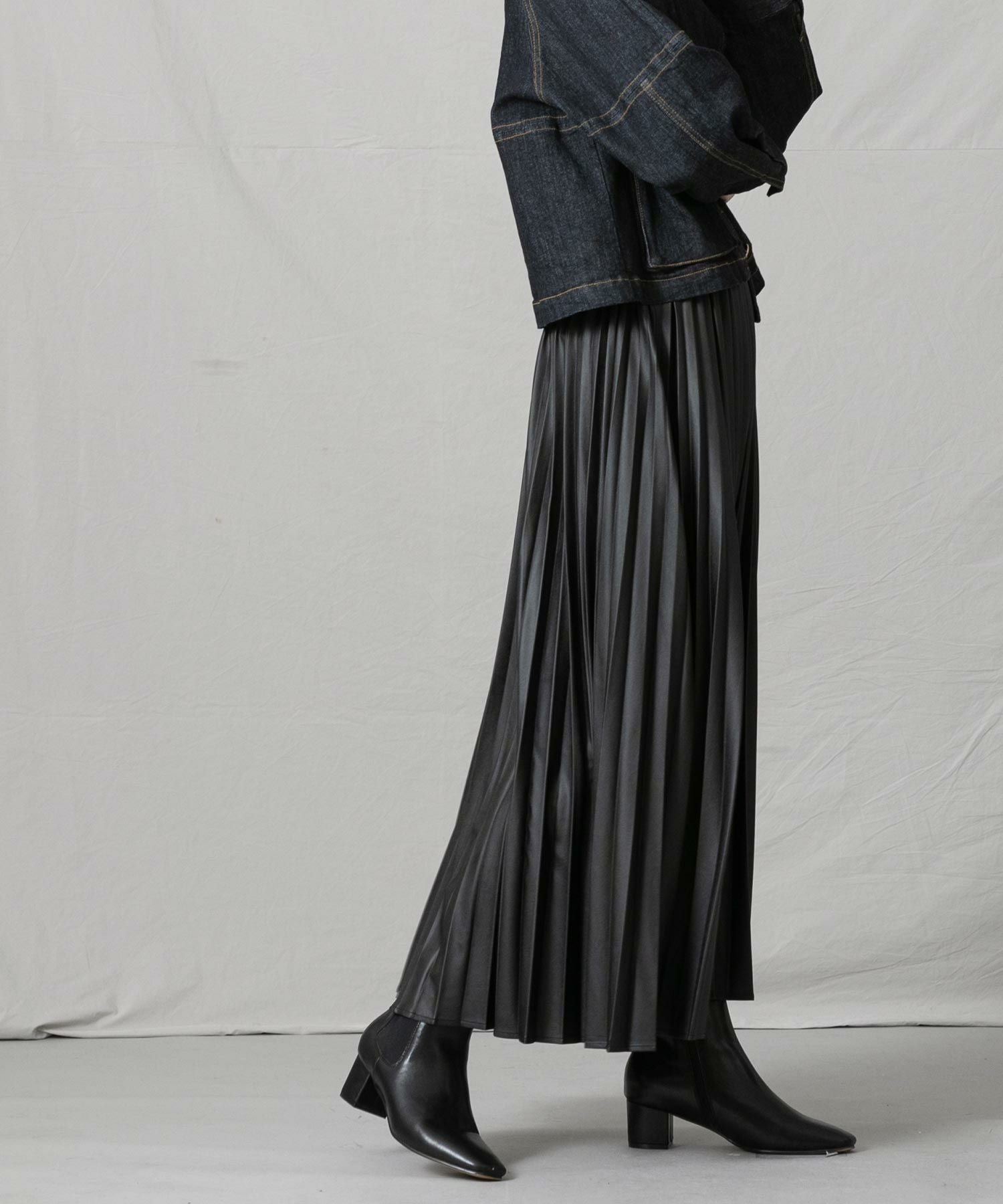 程良い重さで広がり過ぎず、腰回りもスッキリ見えするのでショート丈トップスからゆったりトップスまで幅広くスタイリングしやすい一枚。エコレザーのクールな表情は、ざっくりニットなど素材の質感差のあるトップスと相性が良いので、冬まで活躍すること間違いなし◎