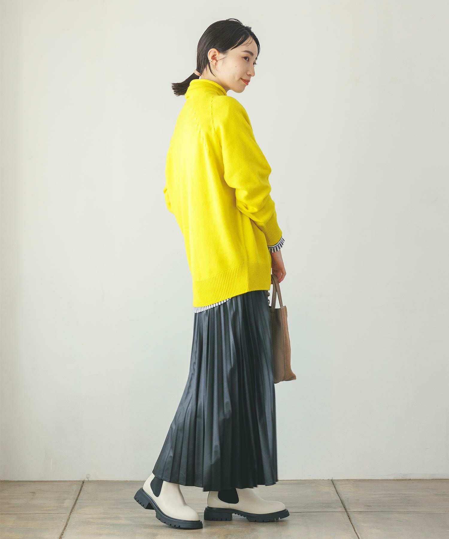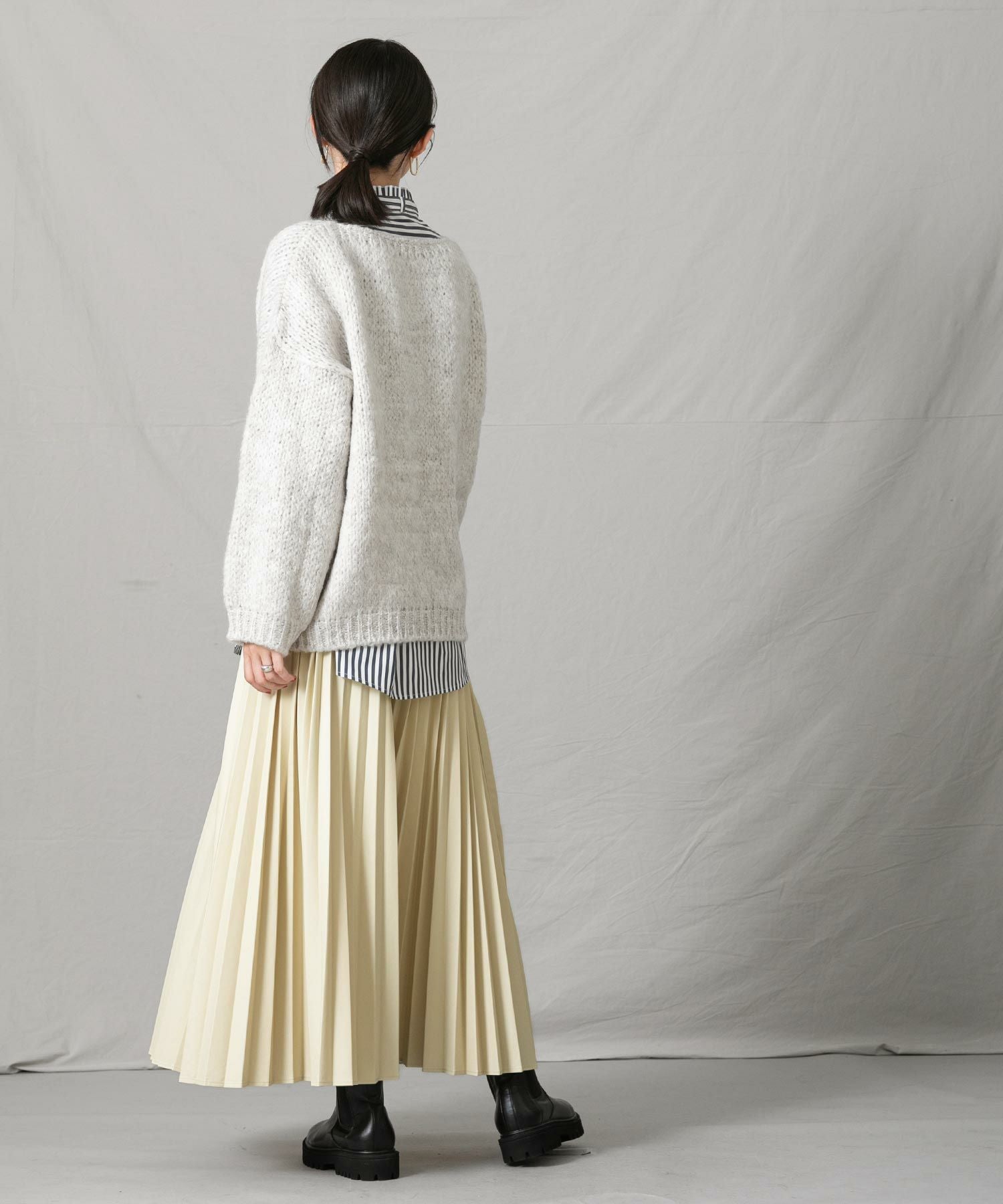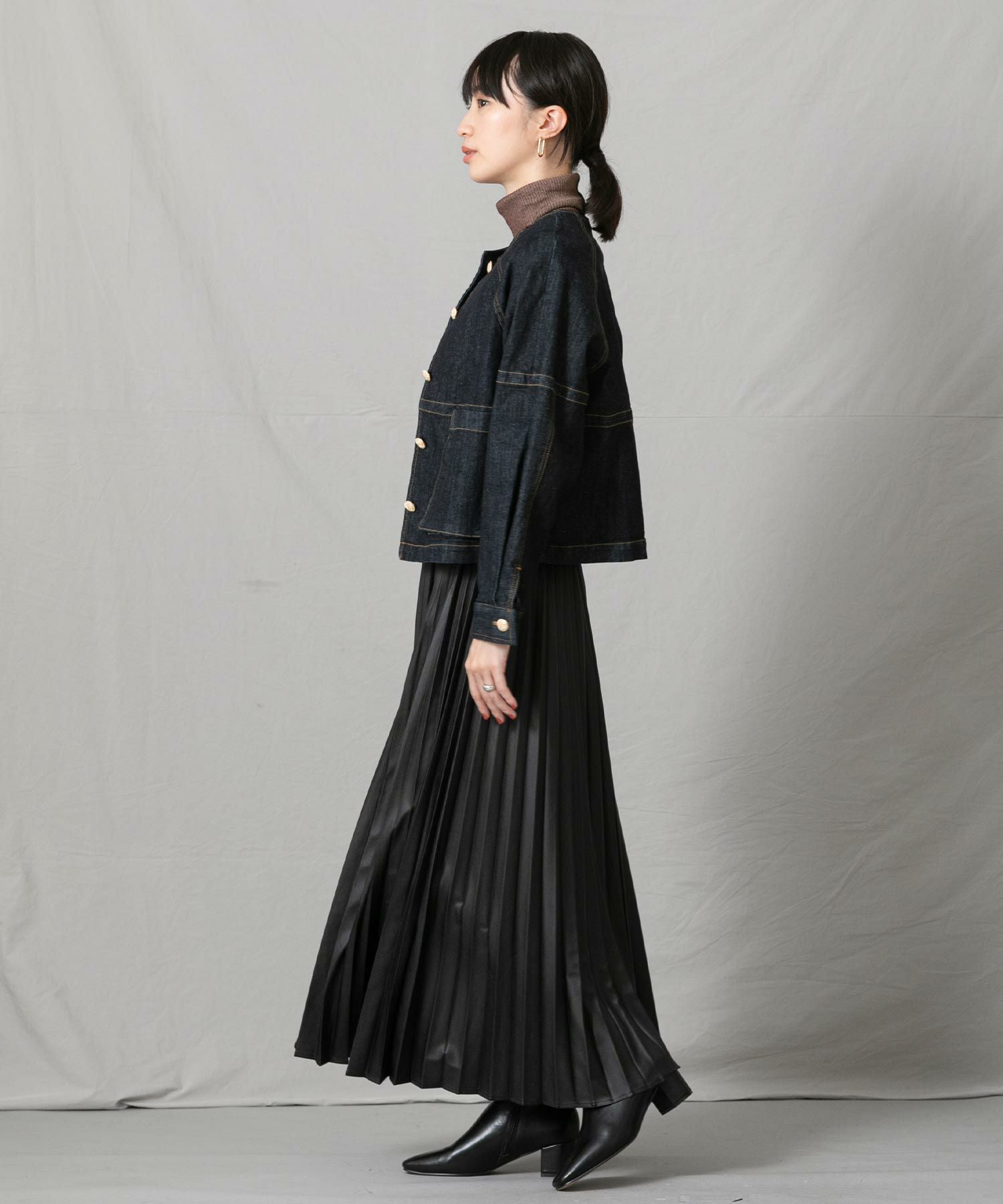 程良い重さで広がり過ぎず、腰回りもスッキリ見えするのでショート丈トップスからゆったりトップスまで幅広くスタイリングしやすい一枚。エコレザーのクールな表情は、ざっくりニットなど素材の質感差のあるトップスと相性が良いので、冬まで活躍すること間違いなし◎