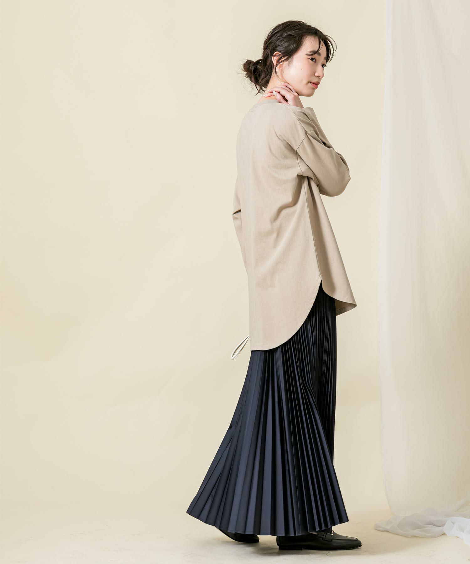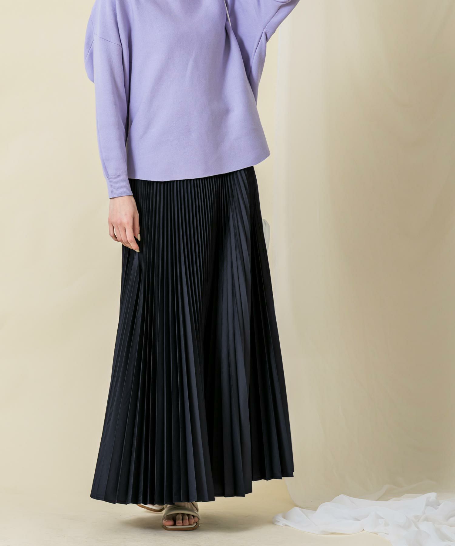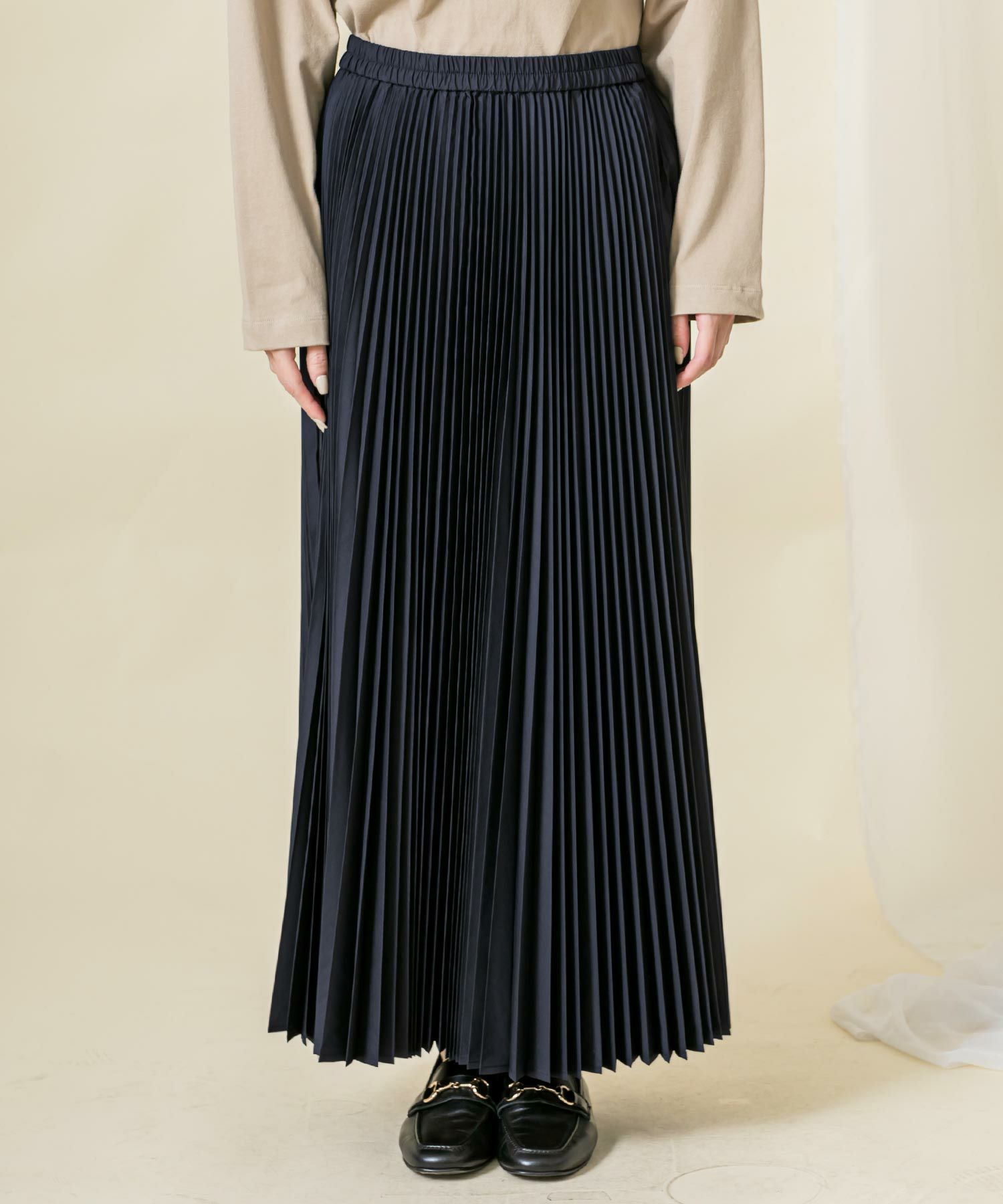 マキシ丈が今年らしい印象で、カジュアルからキレイ目まで幅広いスタイルに合わせやすく、動くたび綺麗にプリーツが広がるのでコーディネートを組むのが楽しくなる一着です。一着で存在感を放ってくれる主役級のアイテムで、ストレスフリーなウエストゴム仕様も嬉しいポイント。