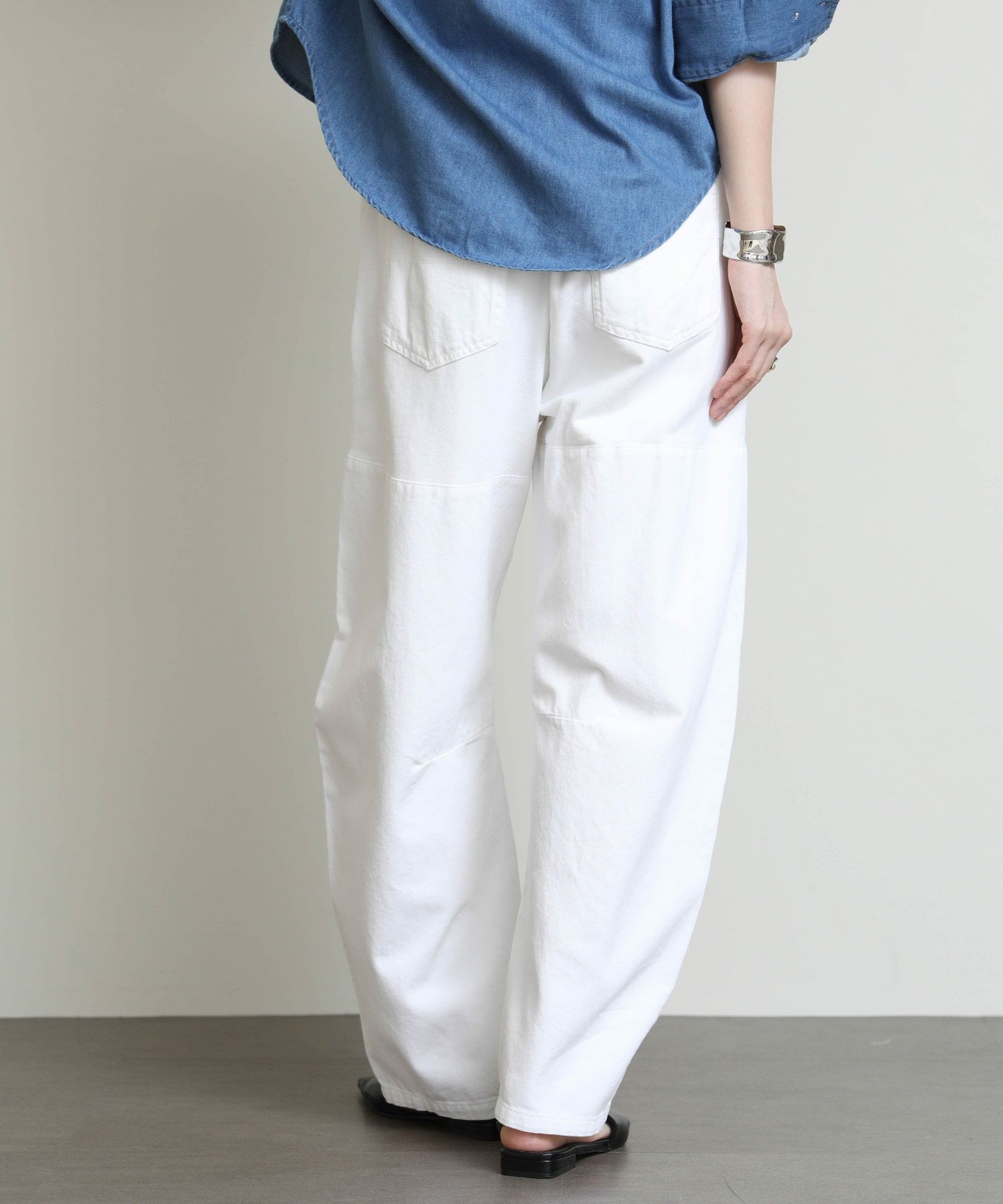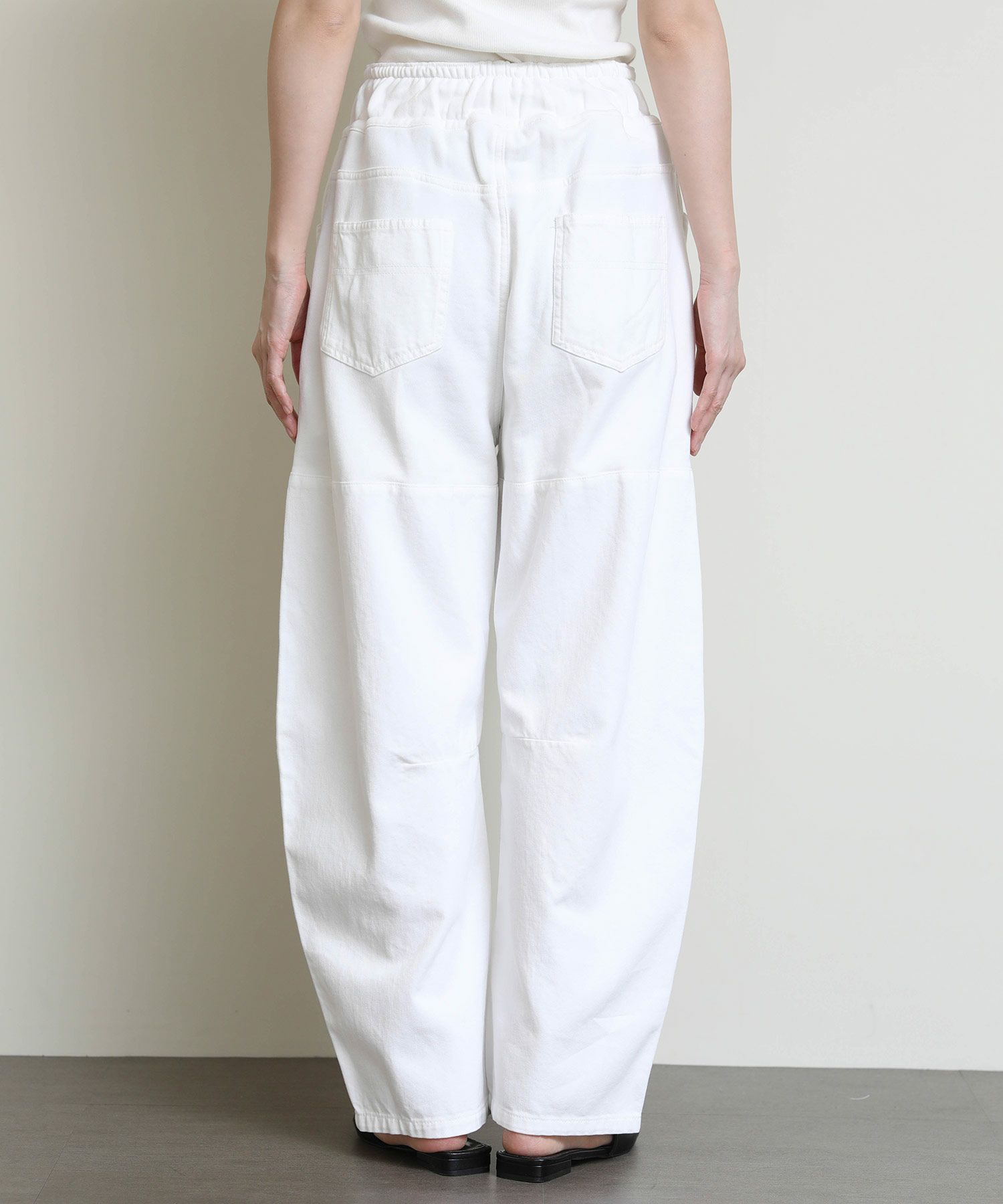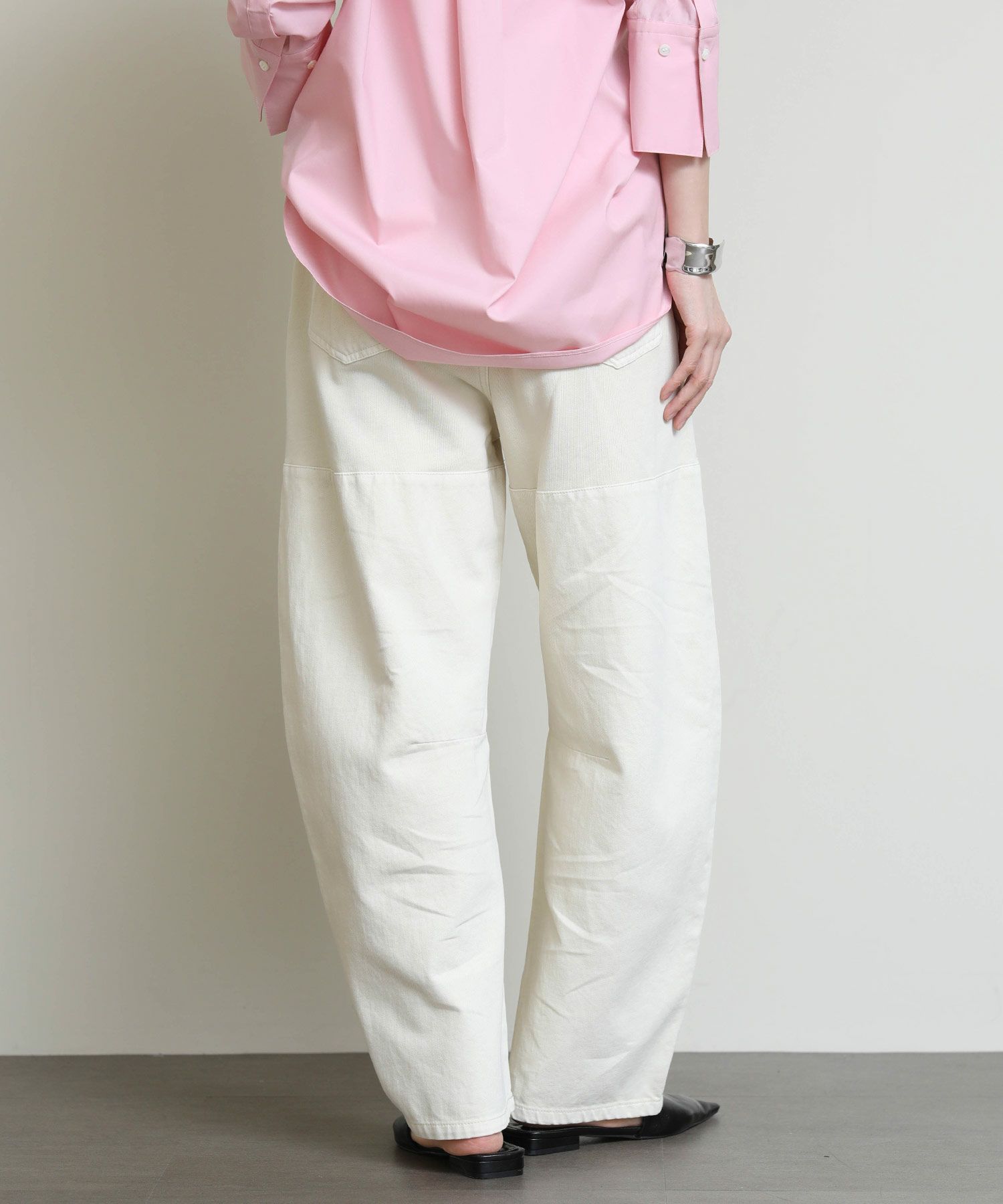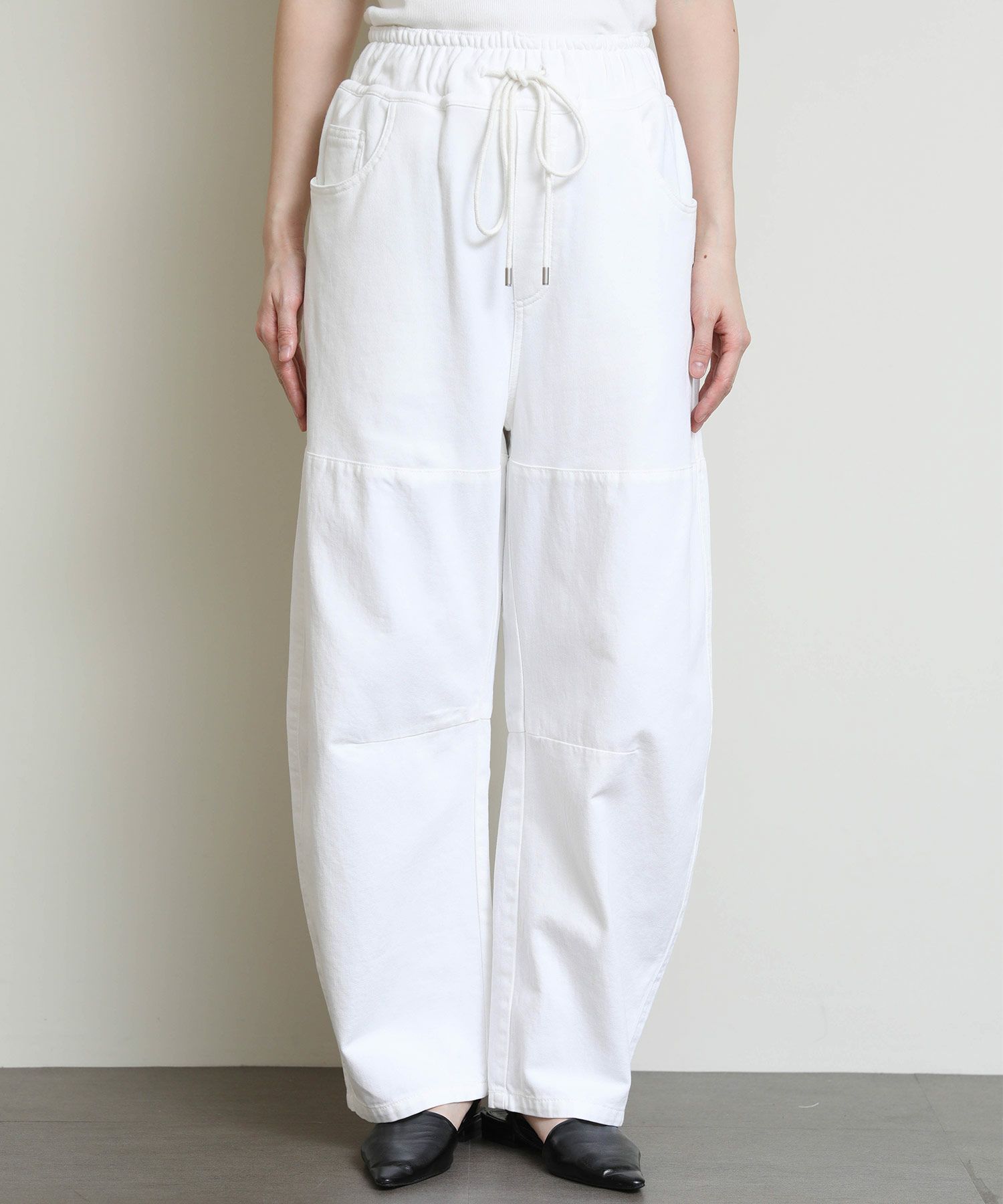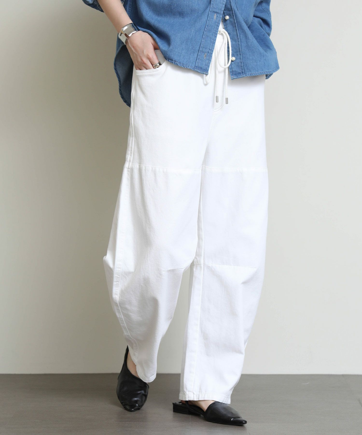 カーブ掛かった丸みのあるシルエットで脚長効果も◎ウエスト周りはゴム仕様でストレスなく着ることができ、紐で調節可能なため、ラフに着こなしていただけます。