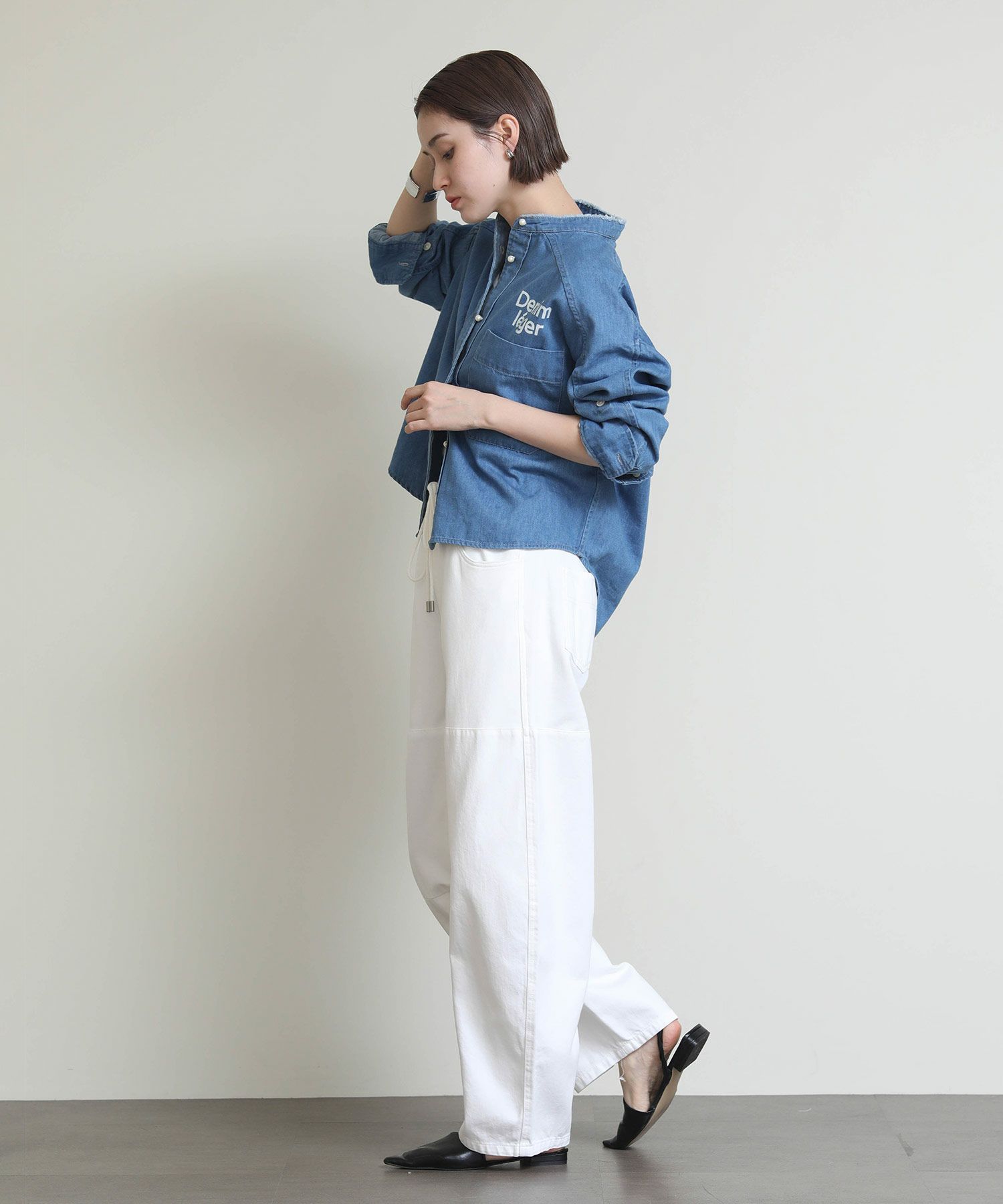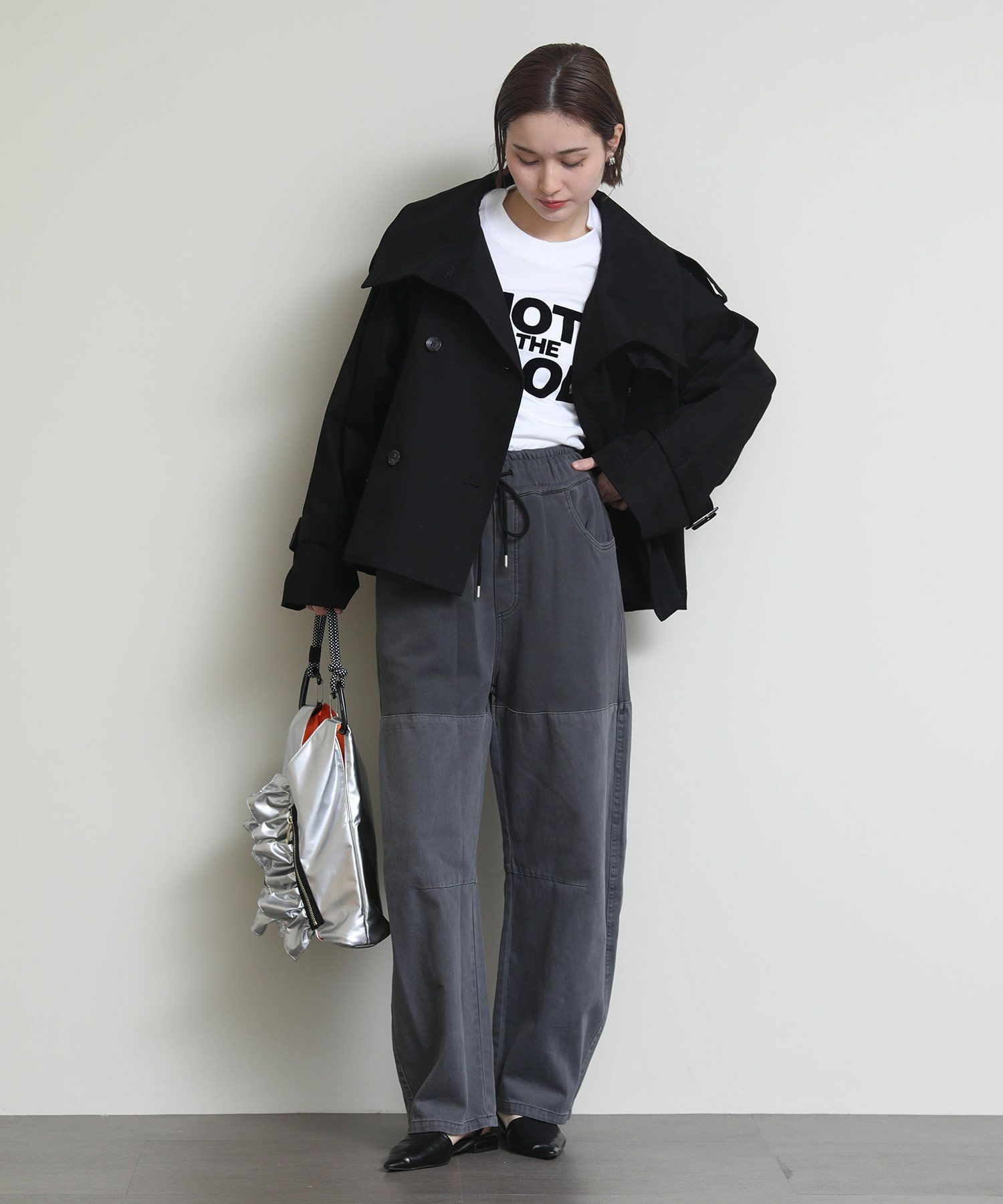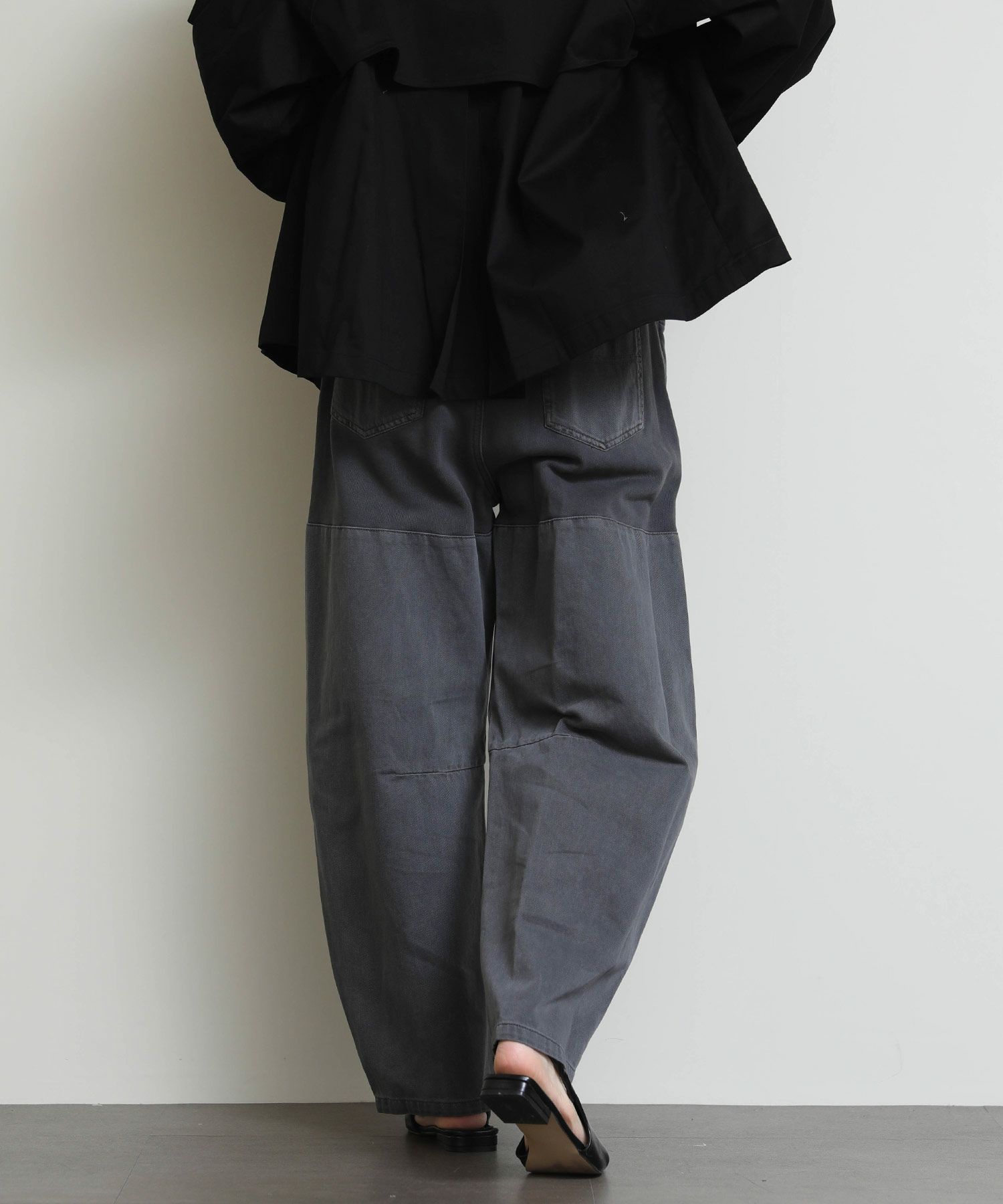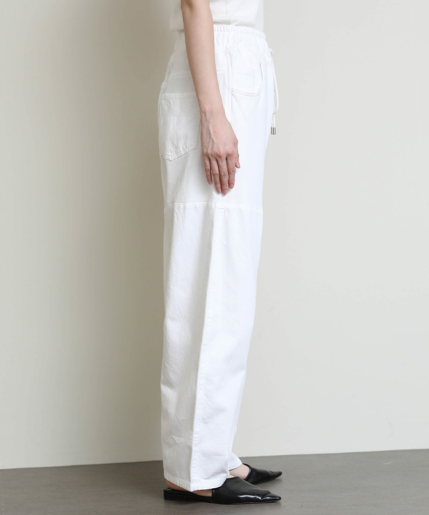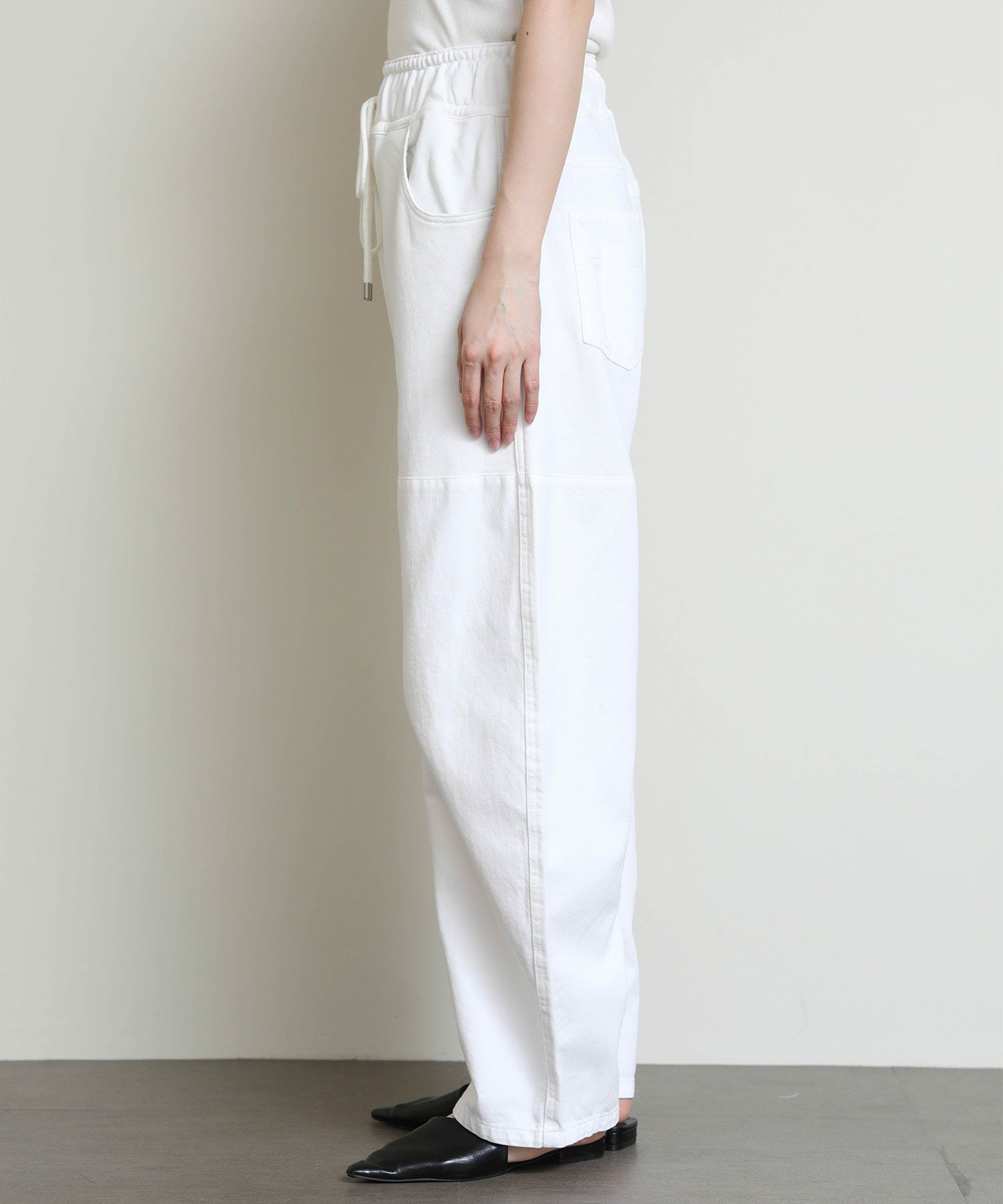 カーブ掛かった丸みのあるシルエットで脚長効果も◎ウエスト周りはゴム仕様でストレスなく着ることができ、紐で調節可能なため、ラフに着こなしていただけます。