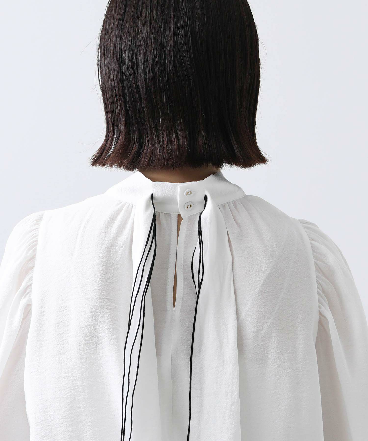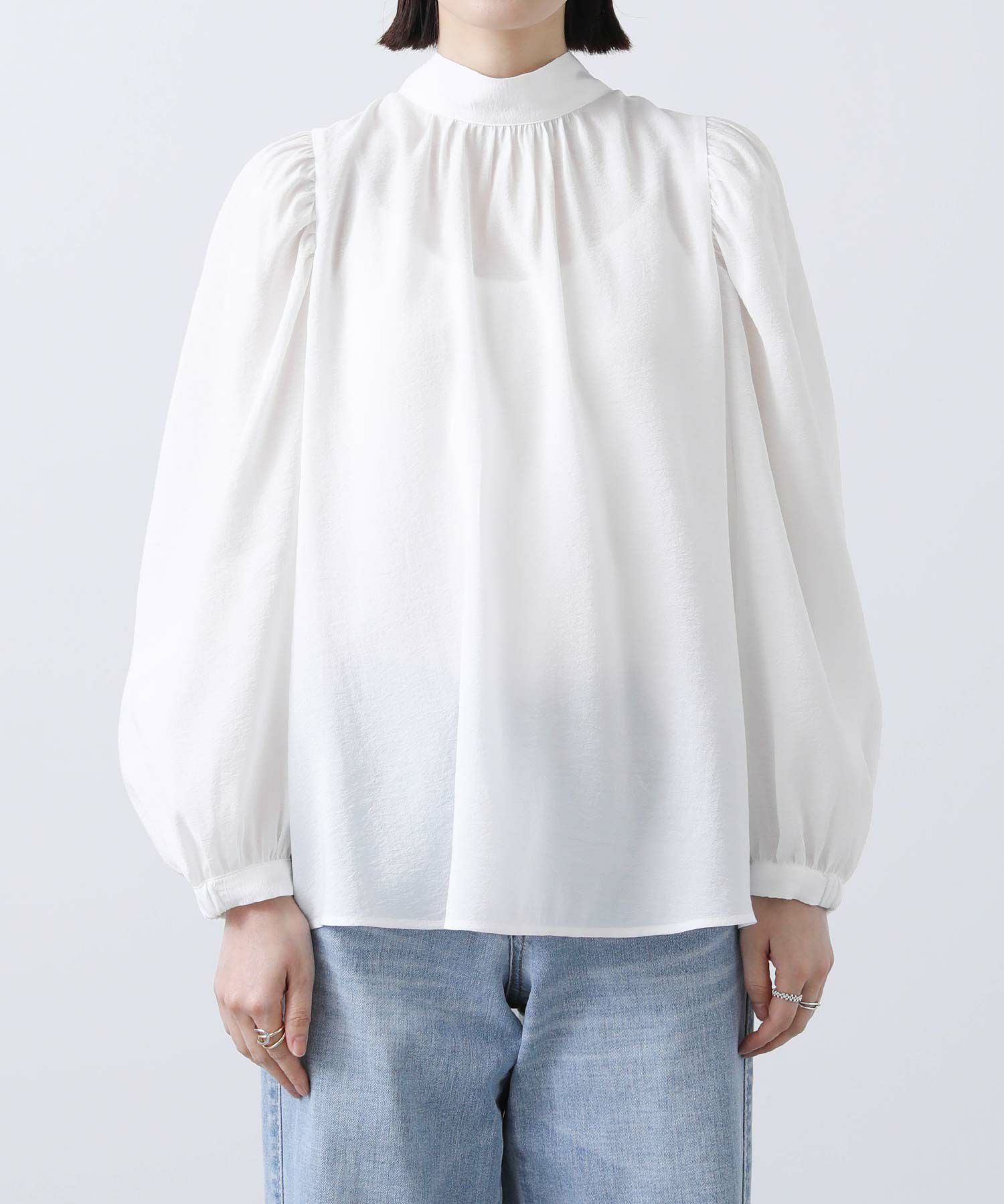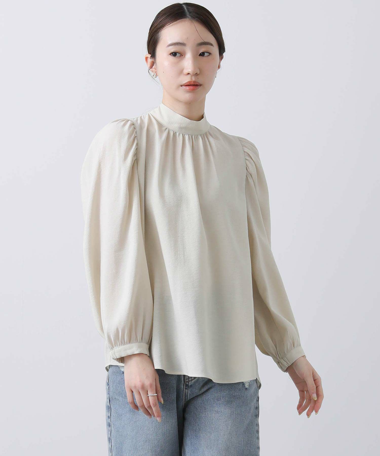 肩幅をコンパクトにデザインし、ギャザ-でたっぷりと分量をだしたパフスリーブがフェミニンさをプラスし大人かわいい装いに。
