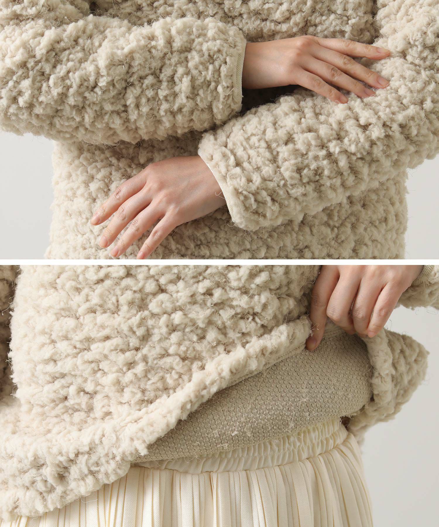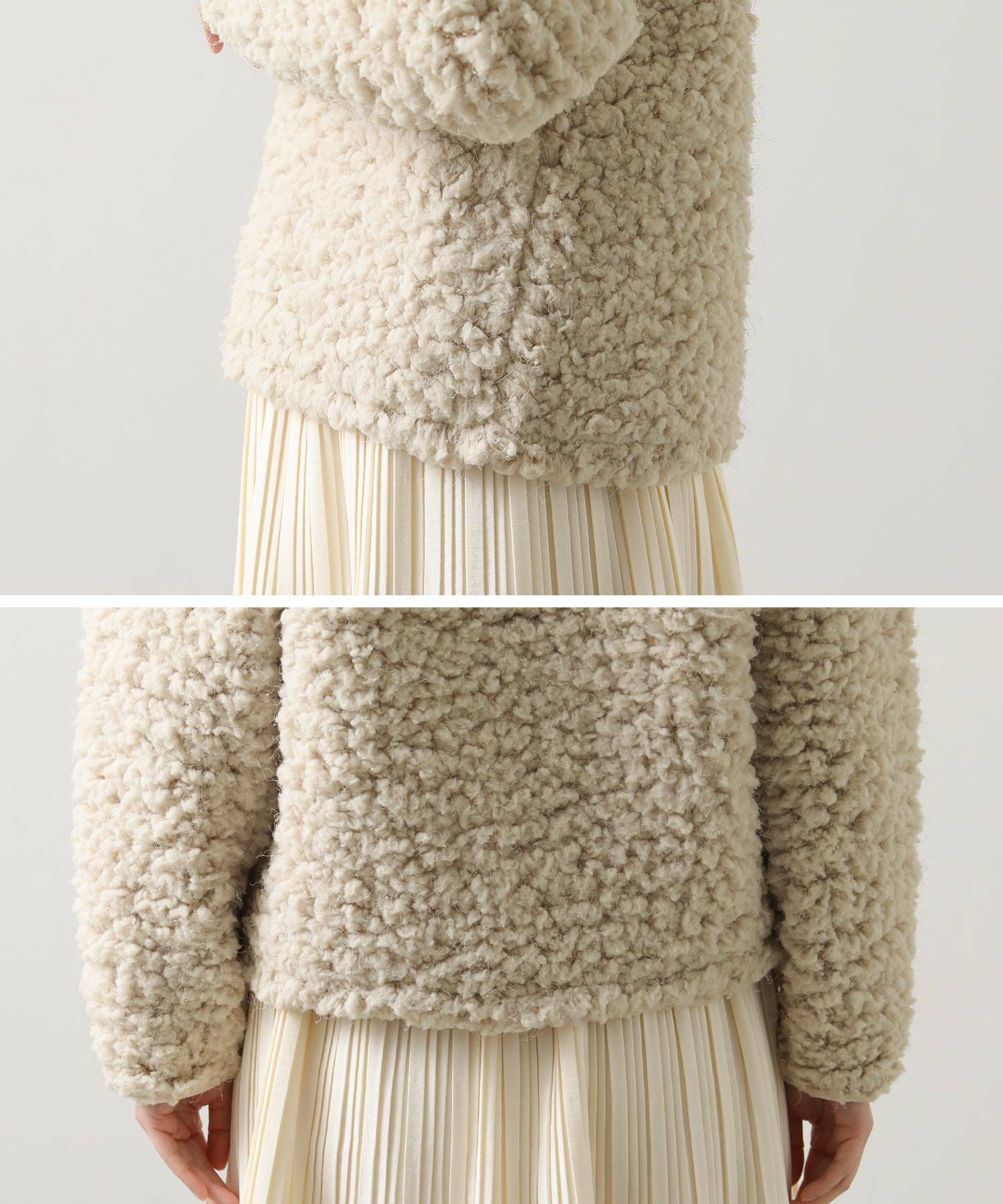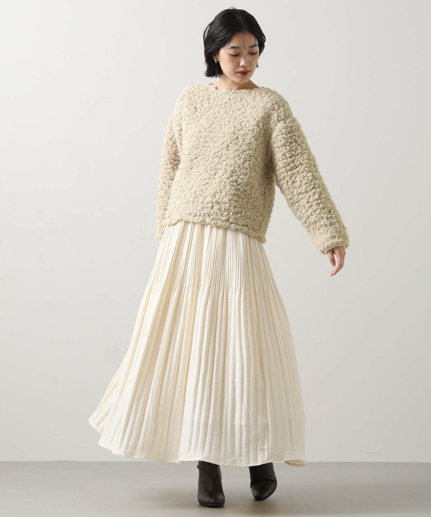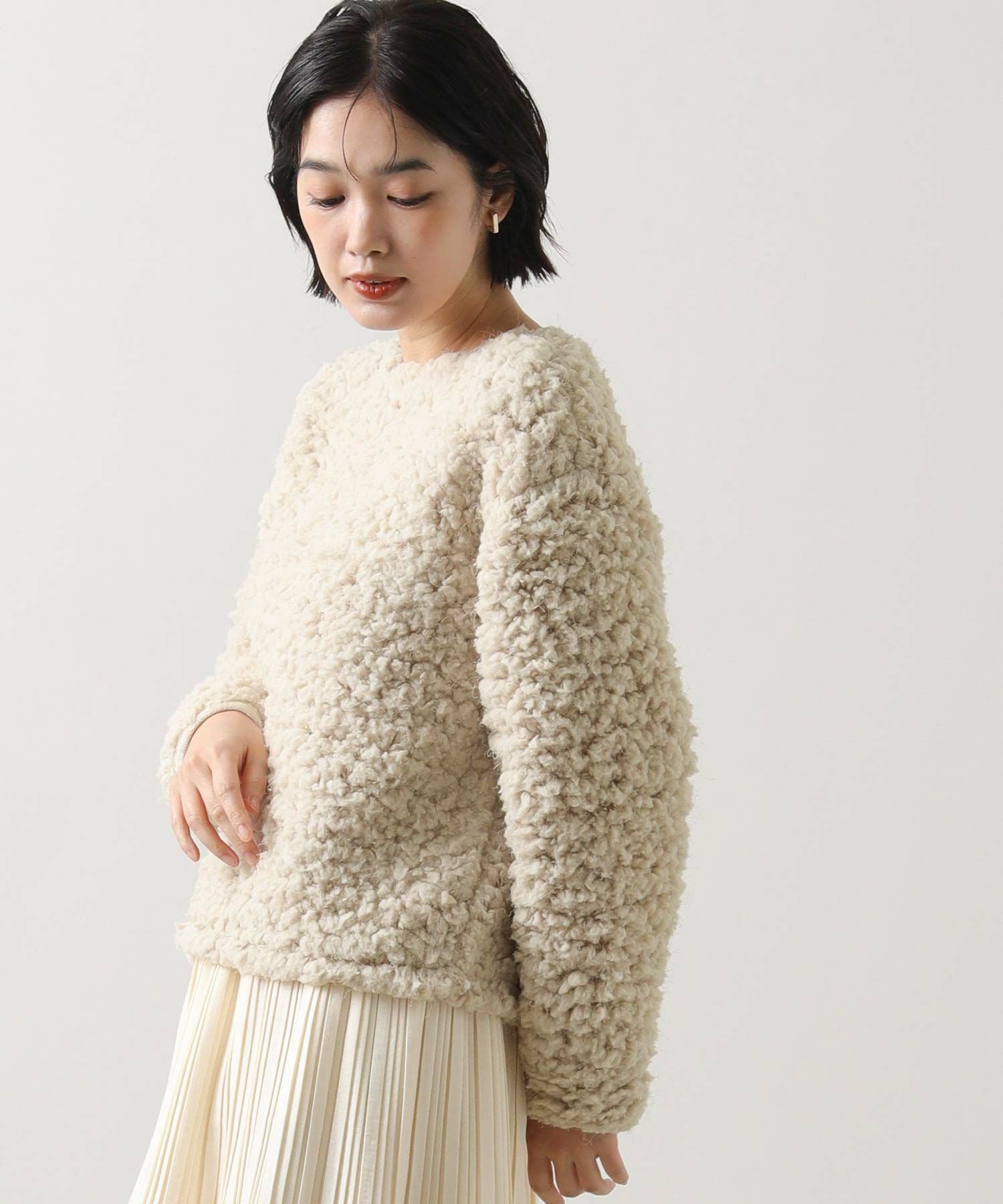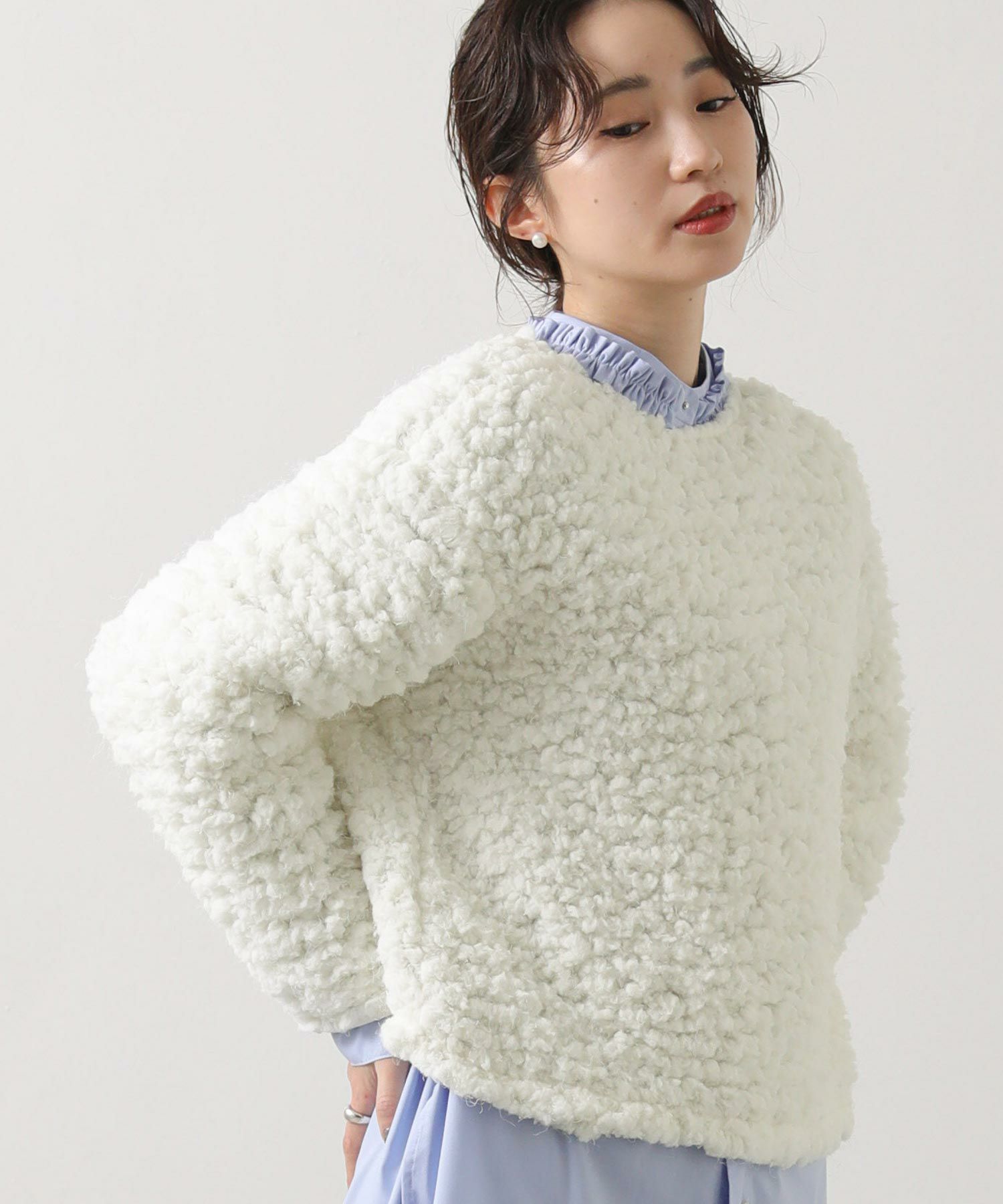 ふわふわのブークレー素材を使用したカットプルオーバー。
