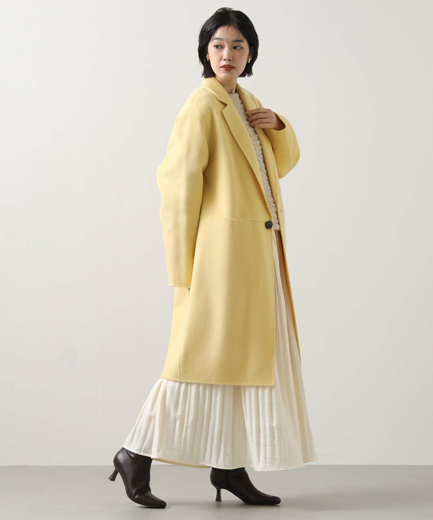 ボリュームのある素材でももたつかず着こなせるよう、着丈は短めに仕上げました。