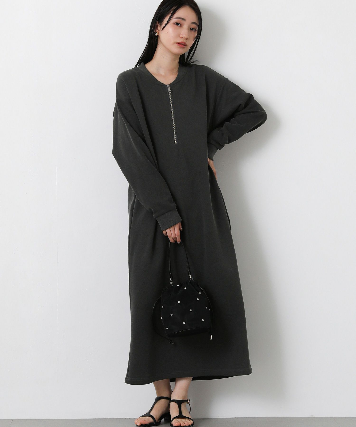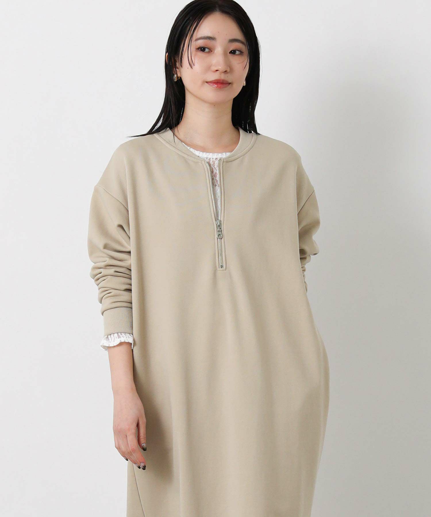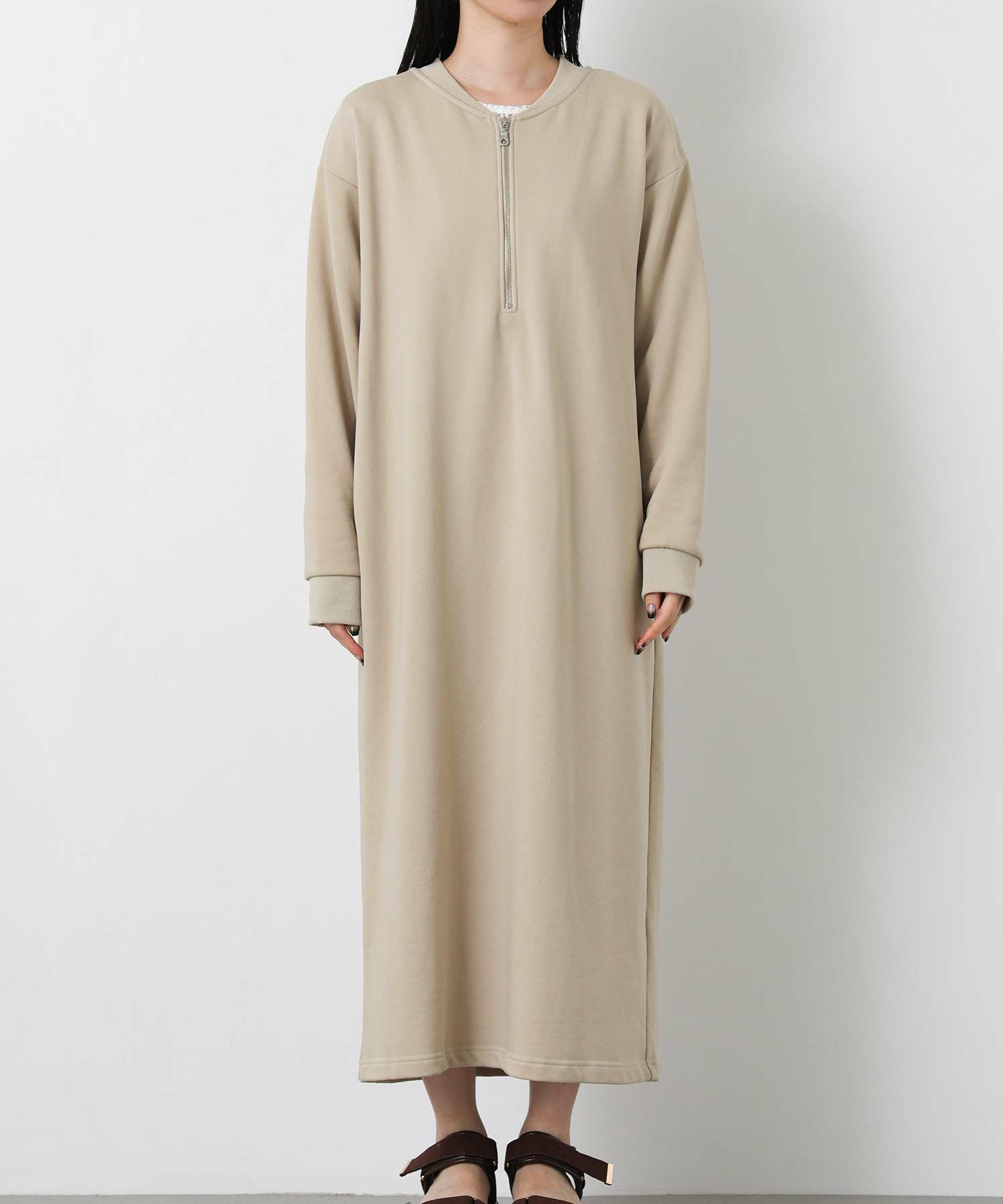 裏毛カットソーを使用した、程よい厚みで春先まで着用できるハーフジップワンピース。