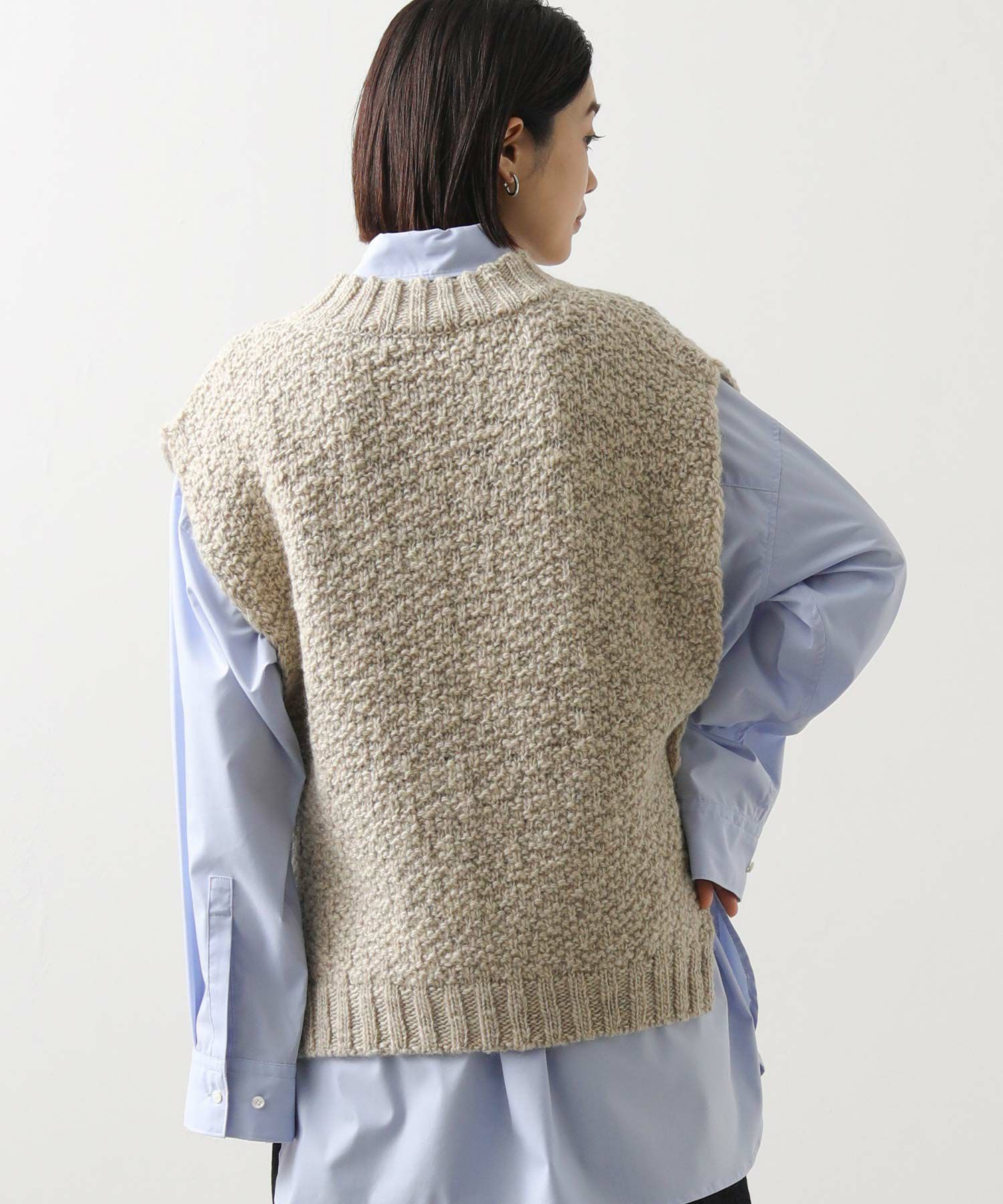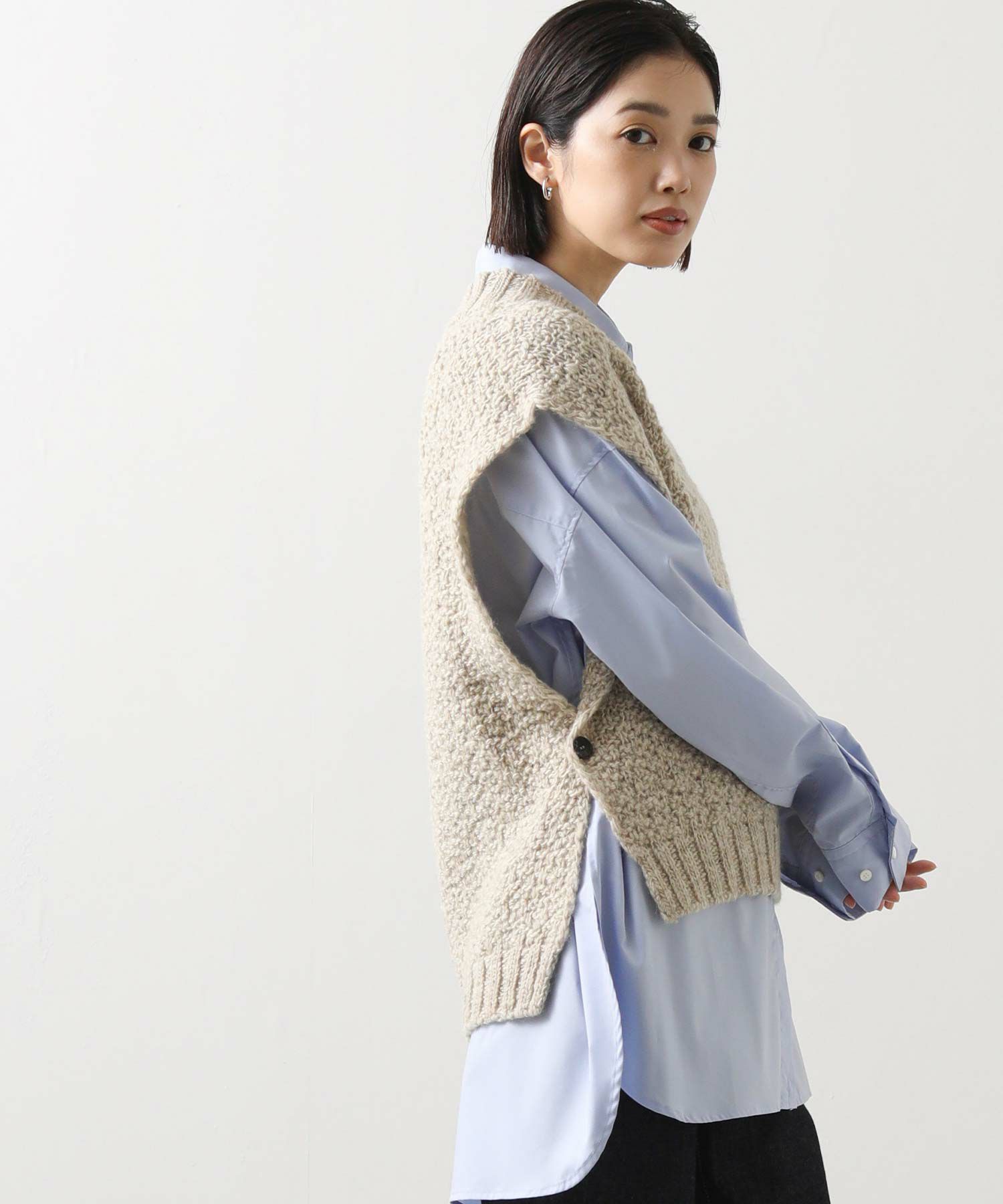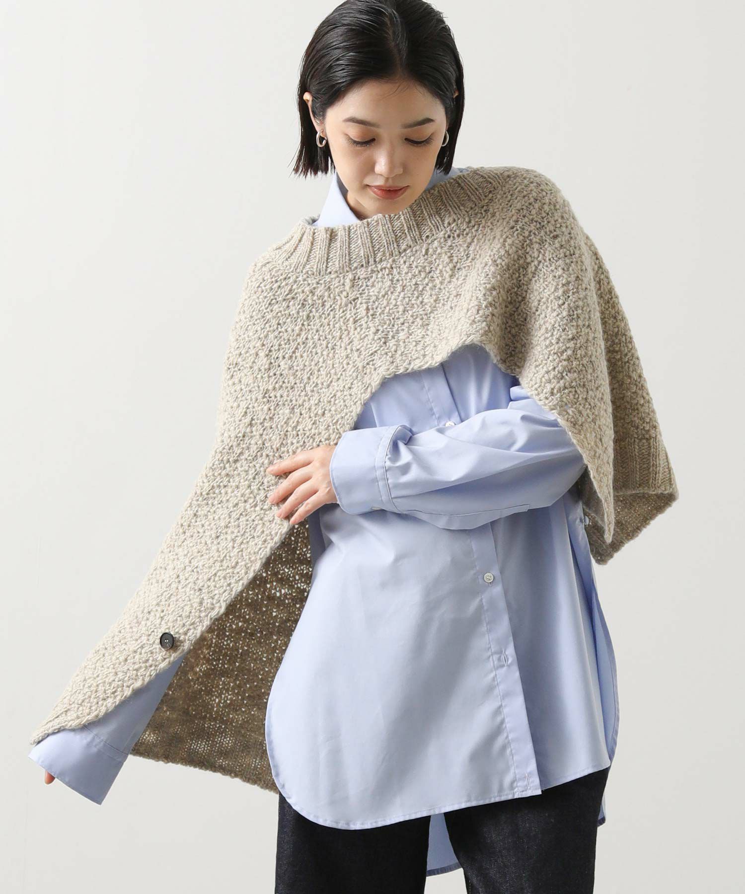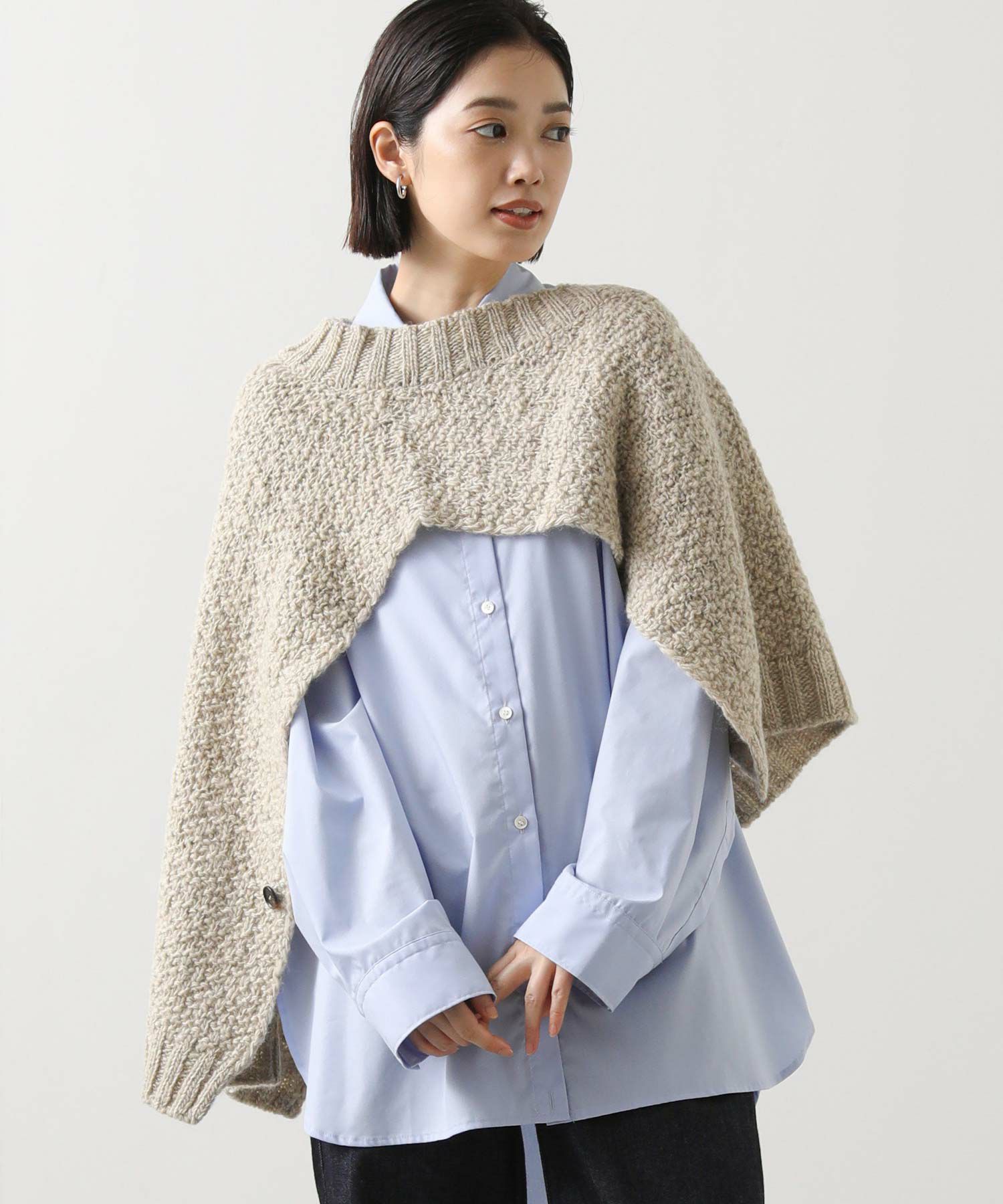 脇のボタンを止めてVネックショートベストに、ボタンを開けて肩部分をずらしてボートネックショートポンチョ風にアレンジ出来るデザインニット。