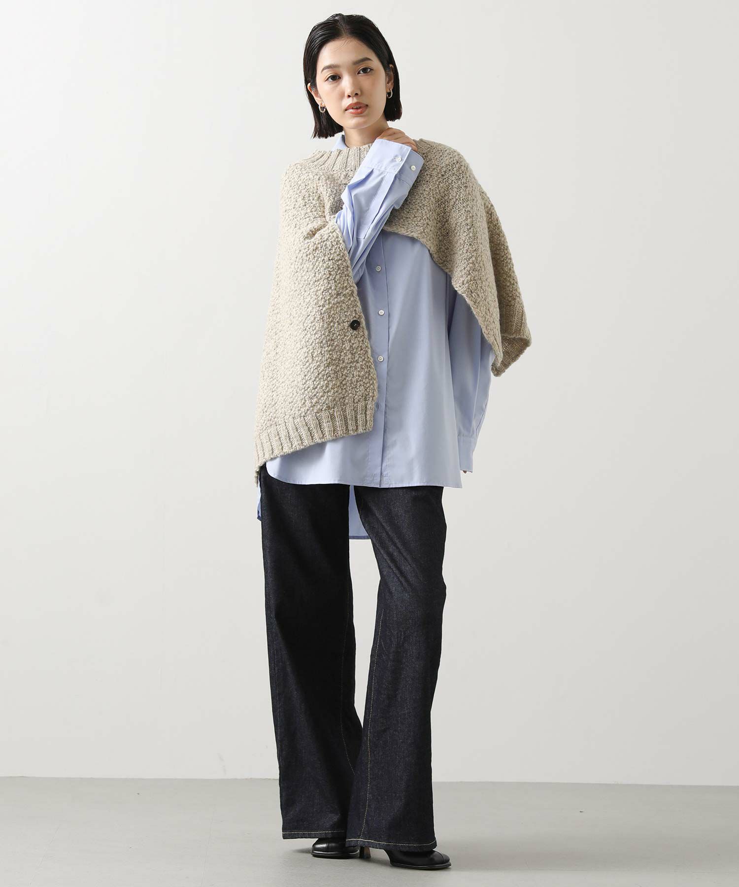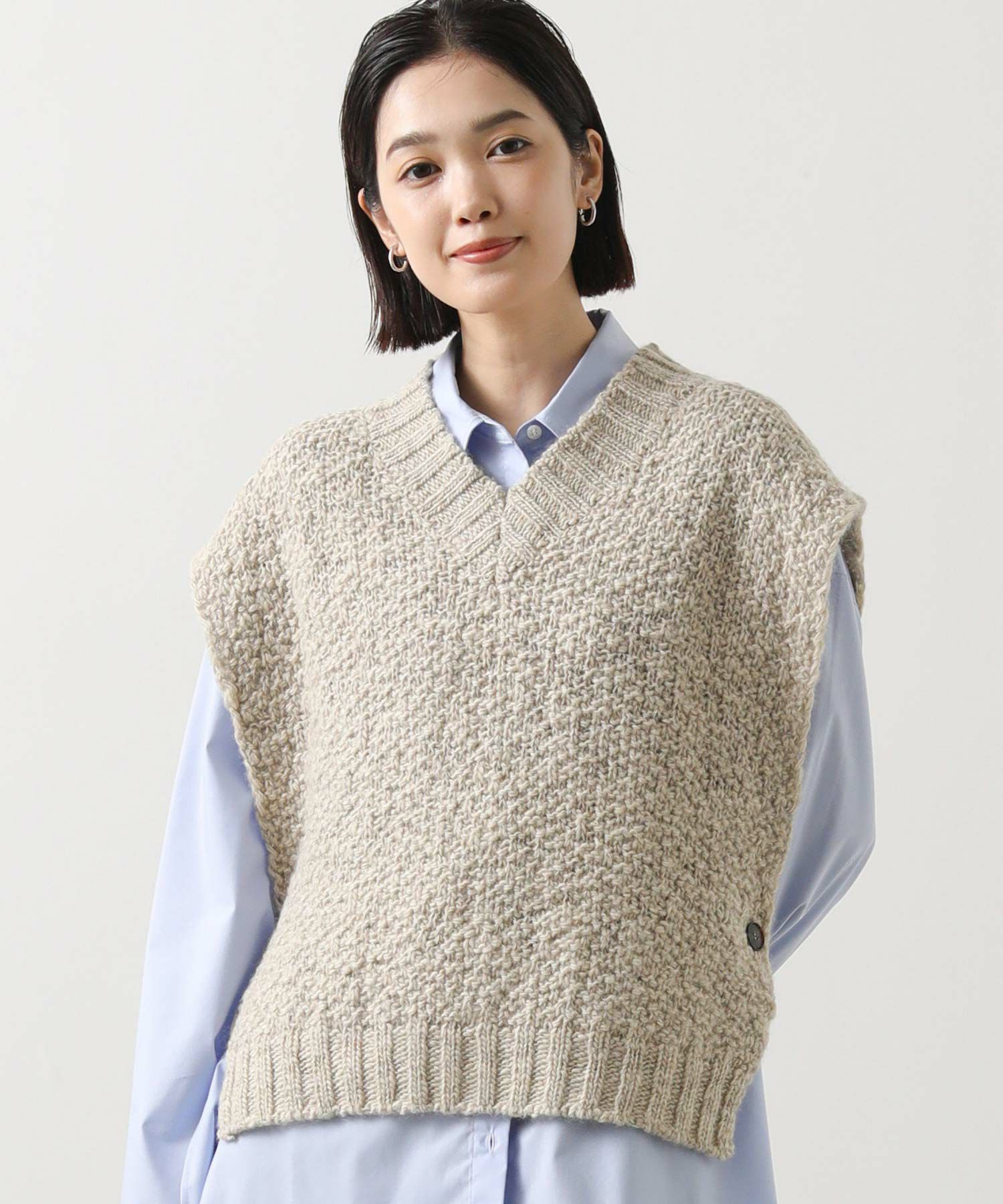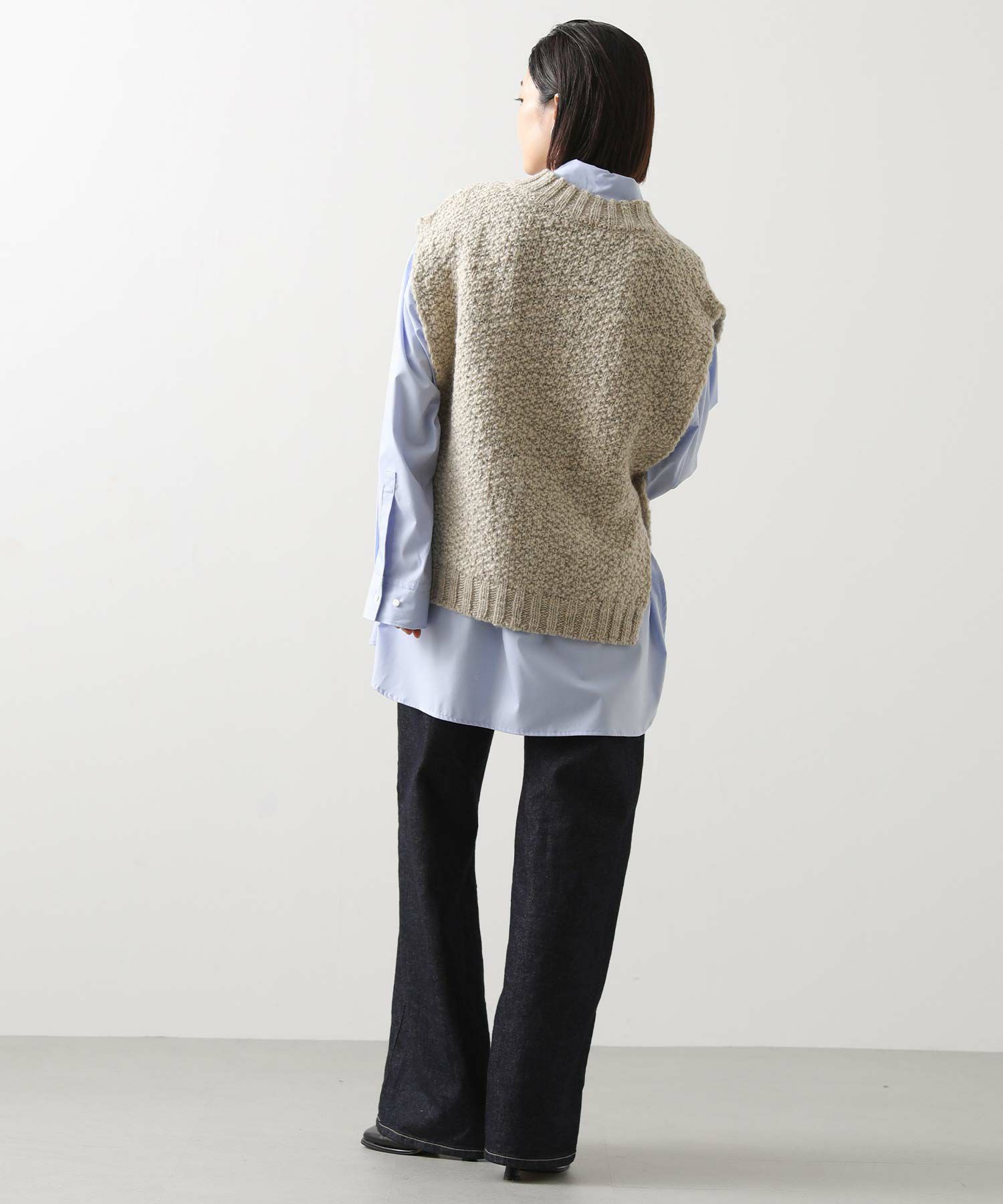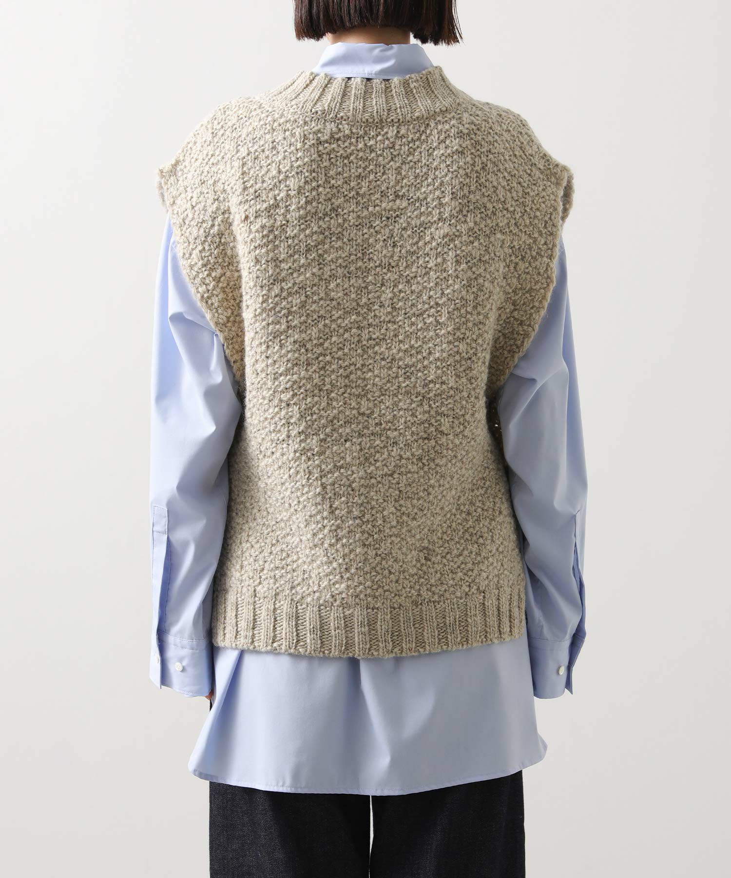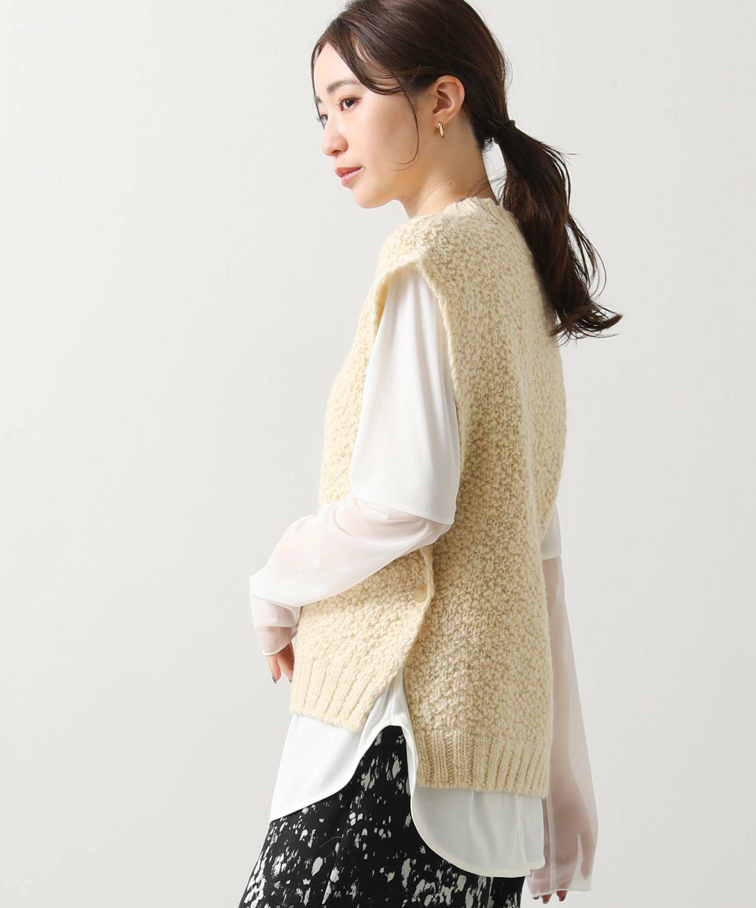脇のボタンを止めてVネックショートベストに、ボタンを開けて肩部分をずらしてボートネックショートポンチョ風にアレンジ出来るデザインニット。
