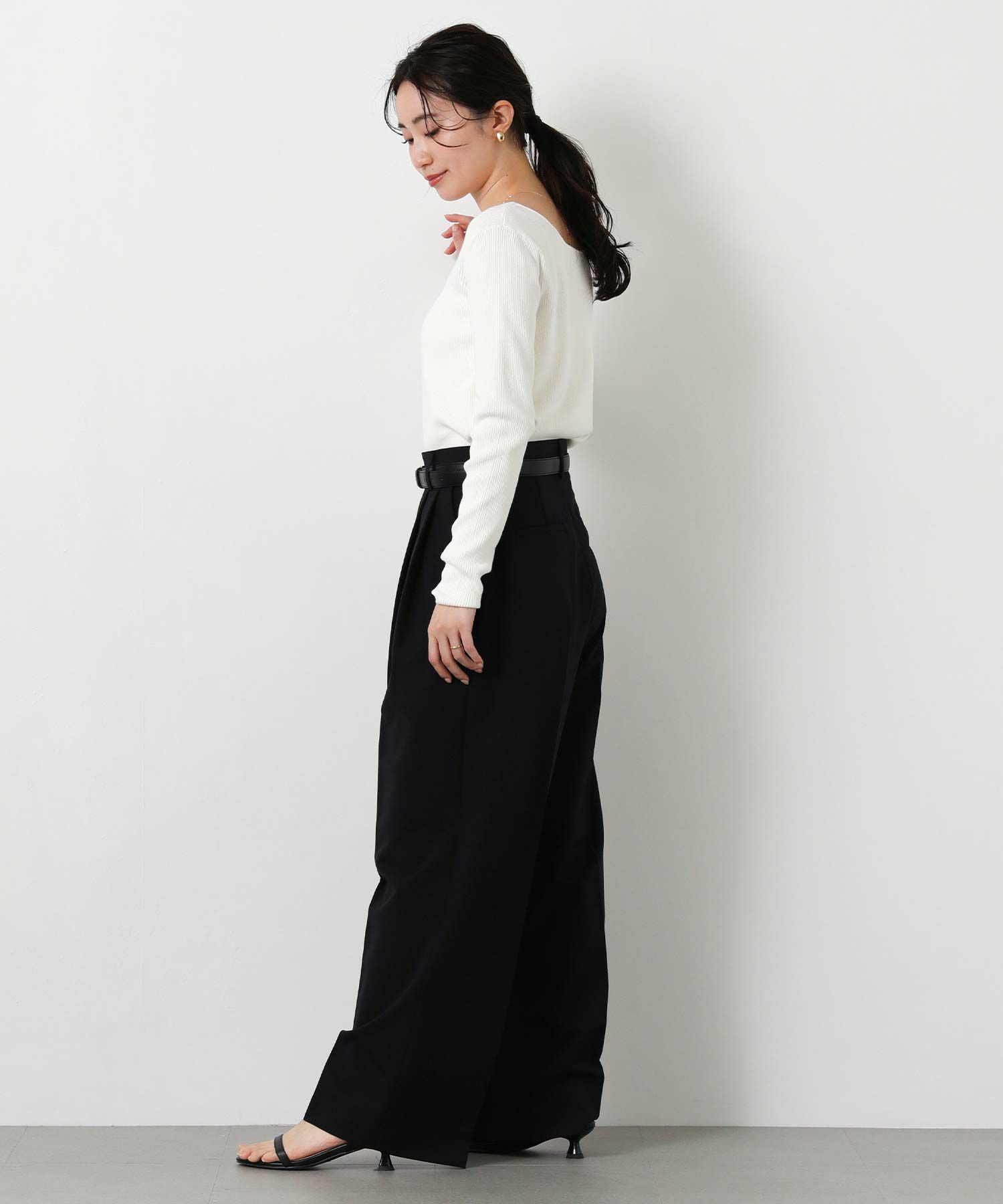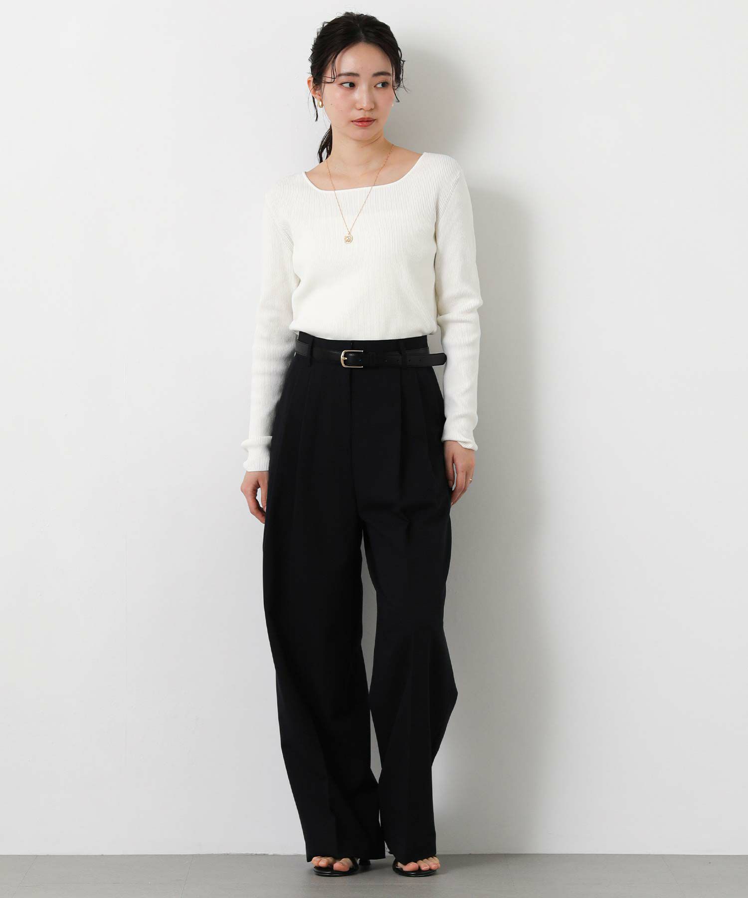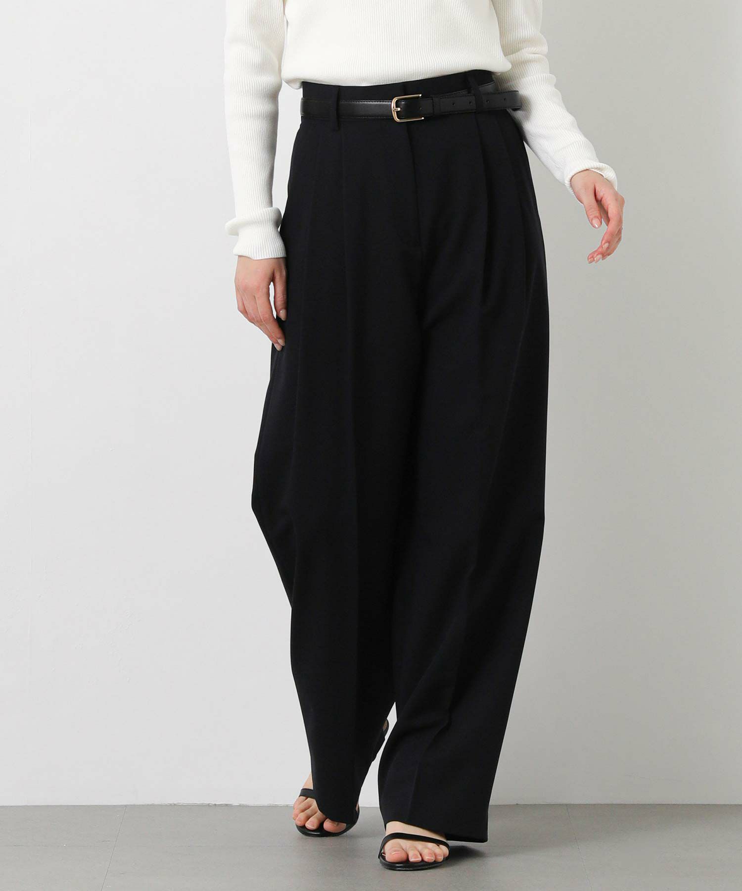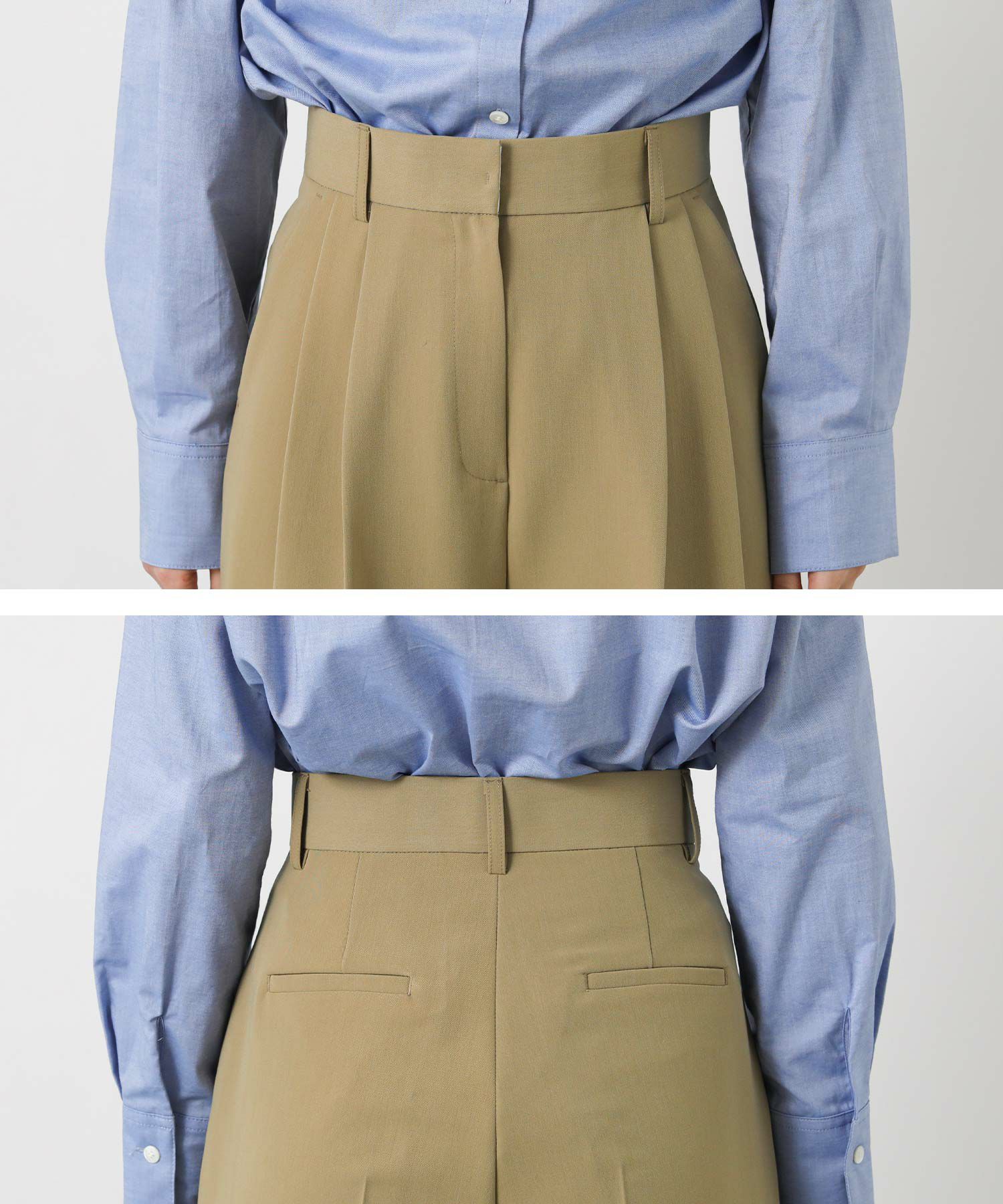 ジャストウエスト設定で、ウエストをすっきりと見せてくれる2タックデザインと、脚のラインを拾いすぎないストレートシルエットに拘った1本。
