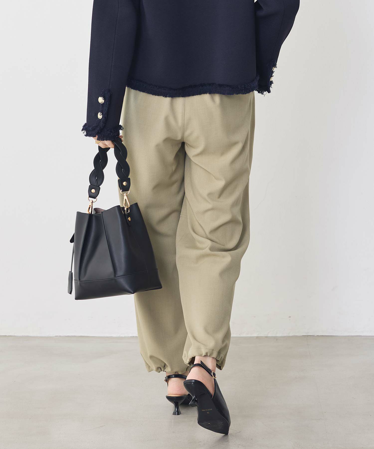 裾のドローコードでシルエットを変化させることにより、スニーカーやパンプス、サンダルなど足元に合わせて変えられるので、様々なシーンで楽しめます。