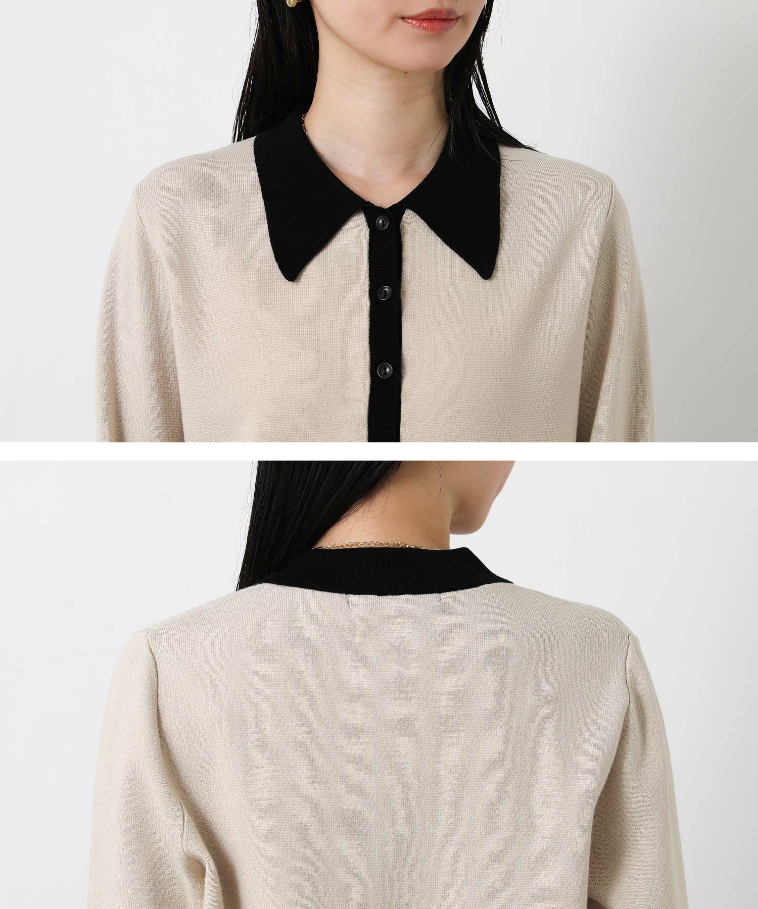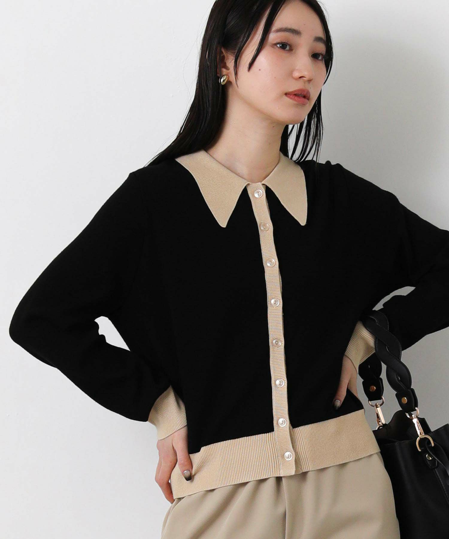 バイカラーの配色が目を惹く、クラシカルな印象のポロ衿ニットカーデ。
