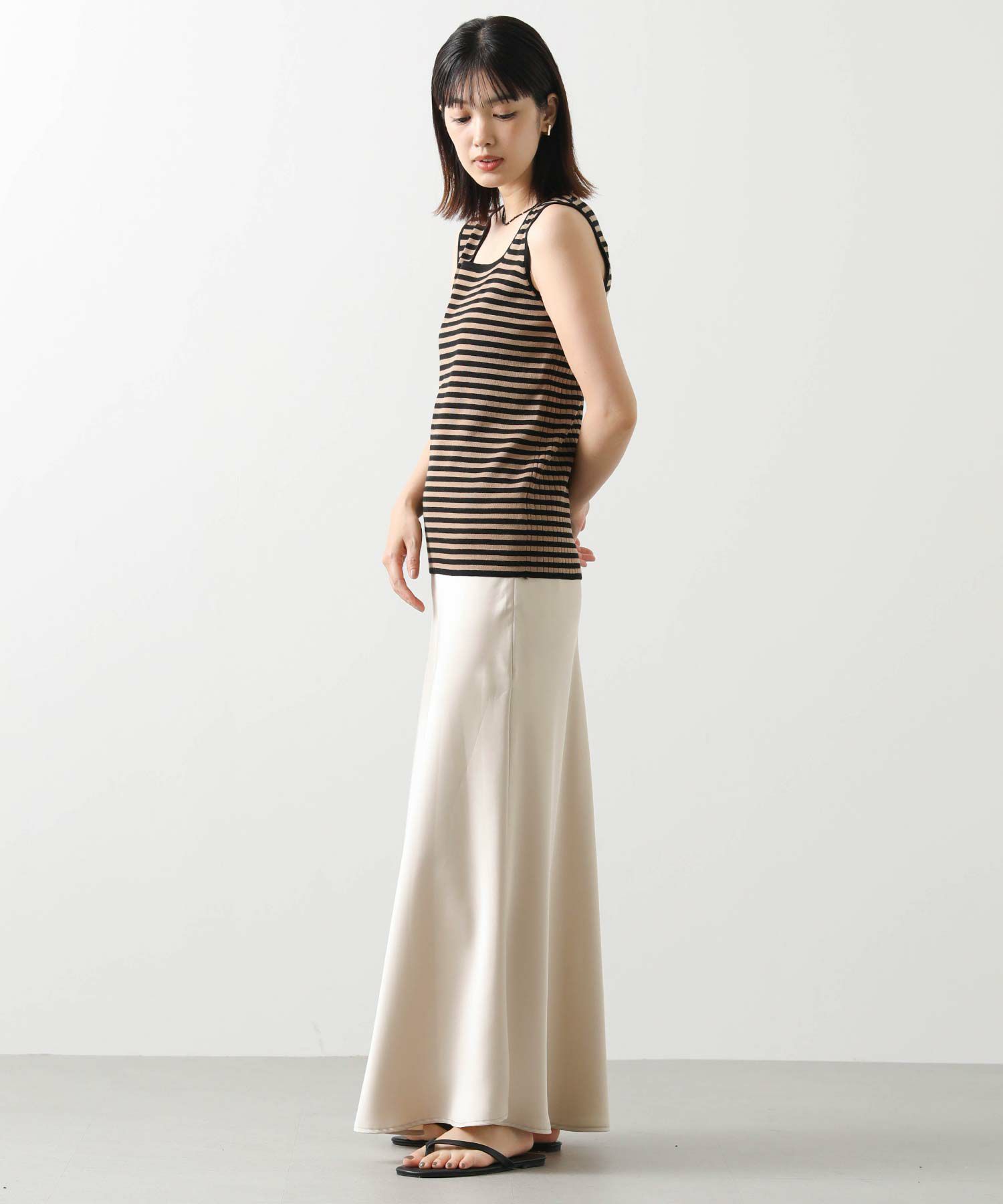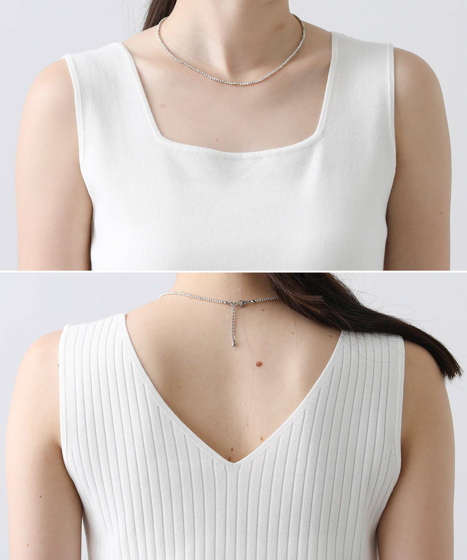 デコルテがキレイに見えるスクエアネックと、顔周りがスッキリ見えるVネックの、前後2WAYで楽しめるニットタンク。