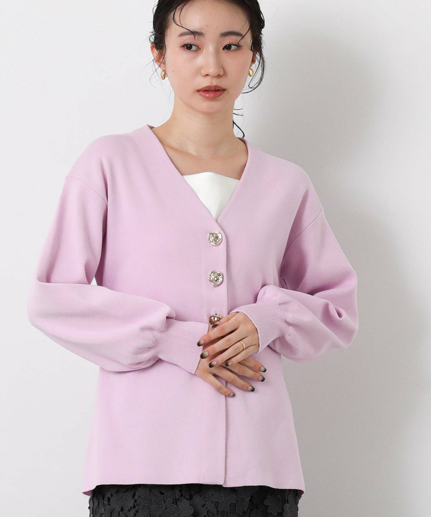 すっきりとしたVネックラインと、ウエストを絞ってペプラムシルエットに編み上げた上品なニットカーデ。