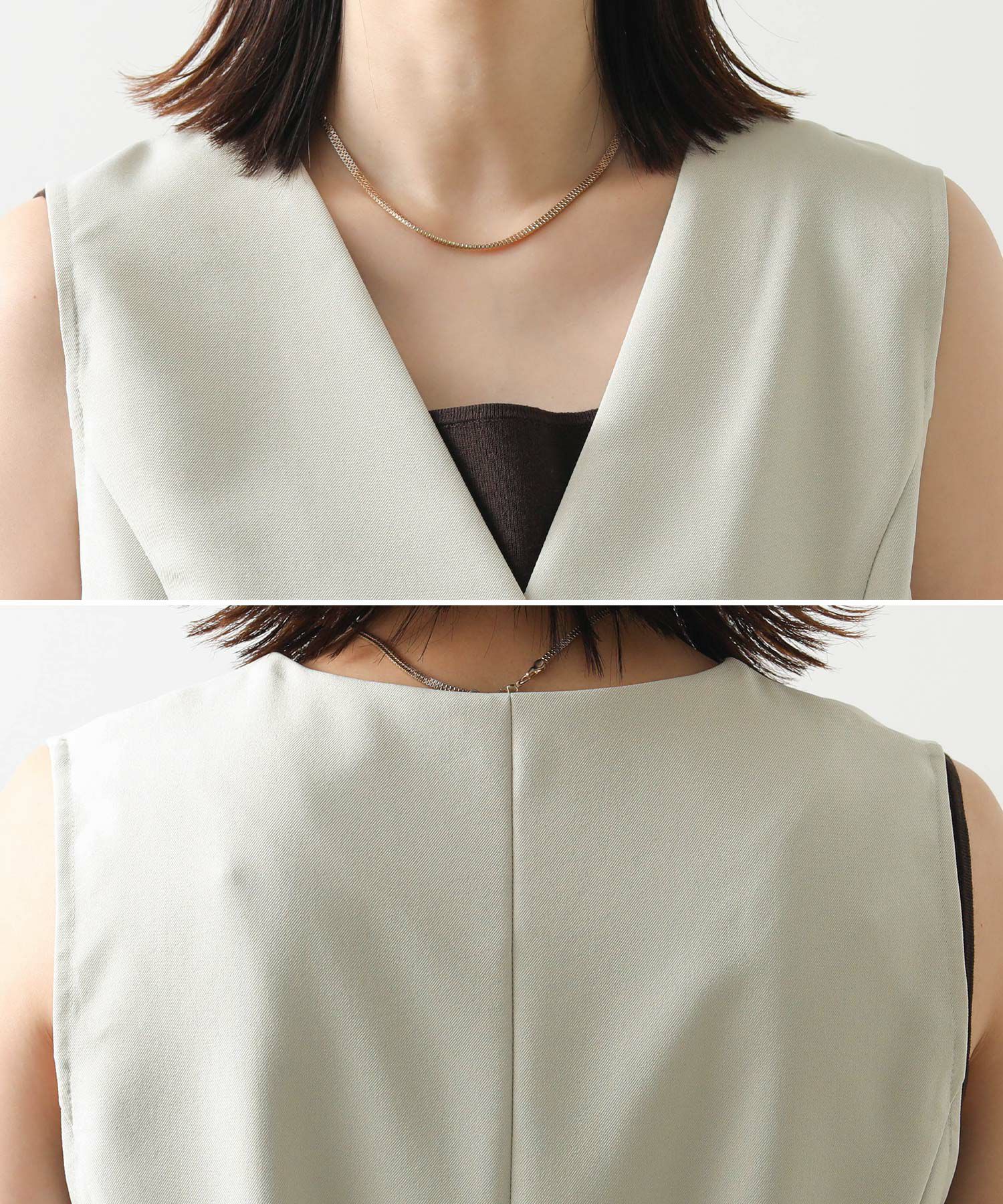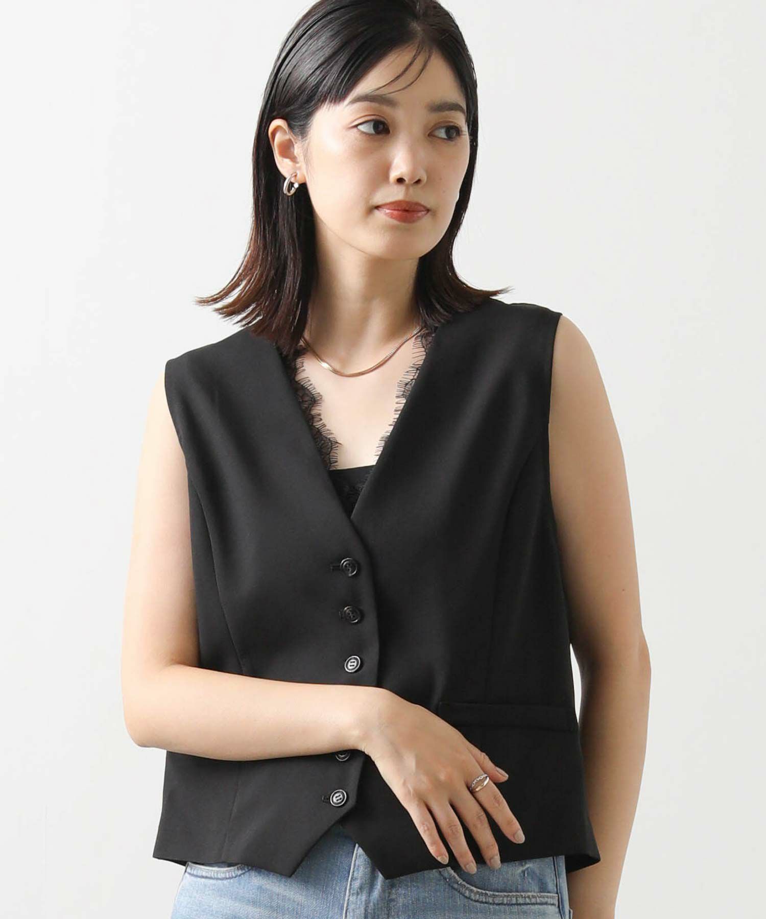 衿元からレースを覗かせる、レースカシュクールジレ(KO301414002)とのレイヤードスタイルがオススメ。