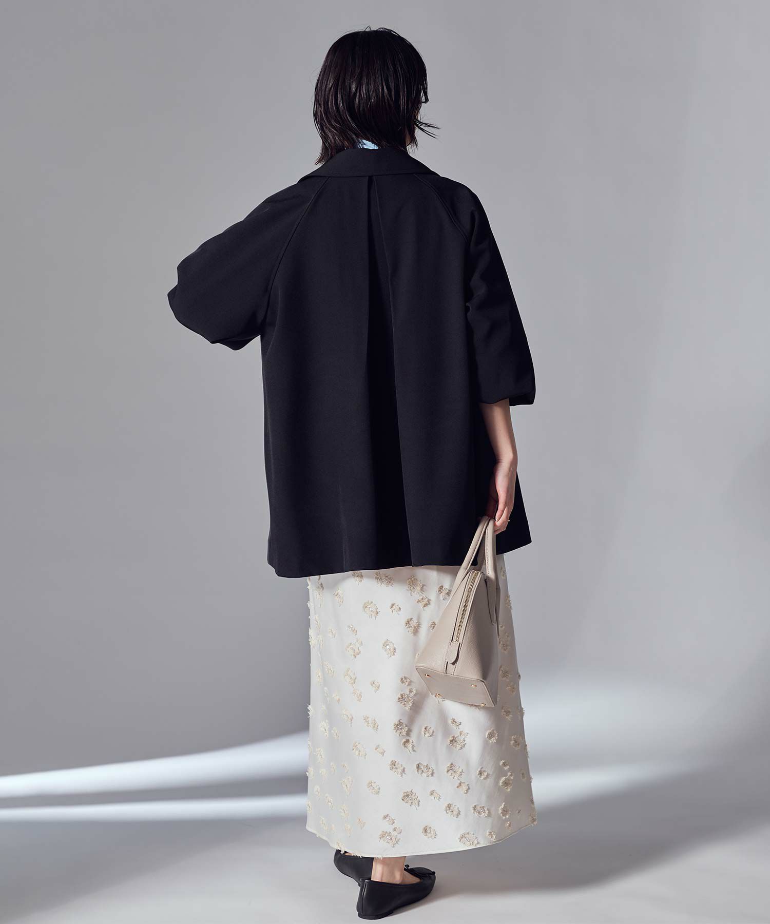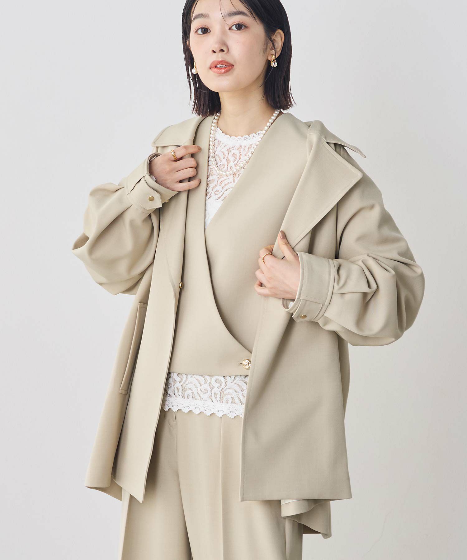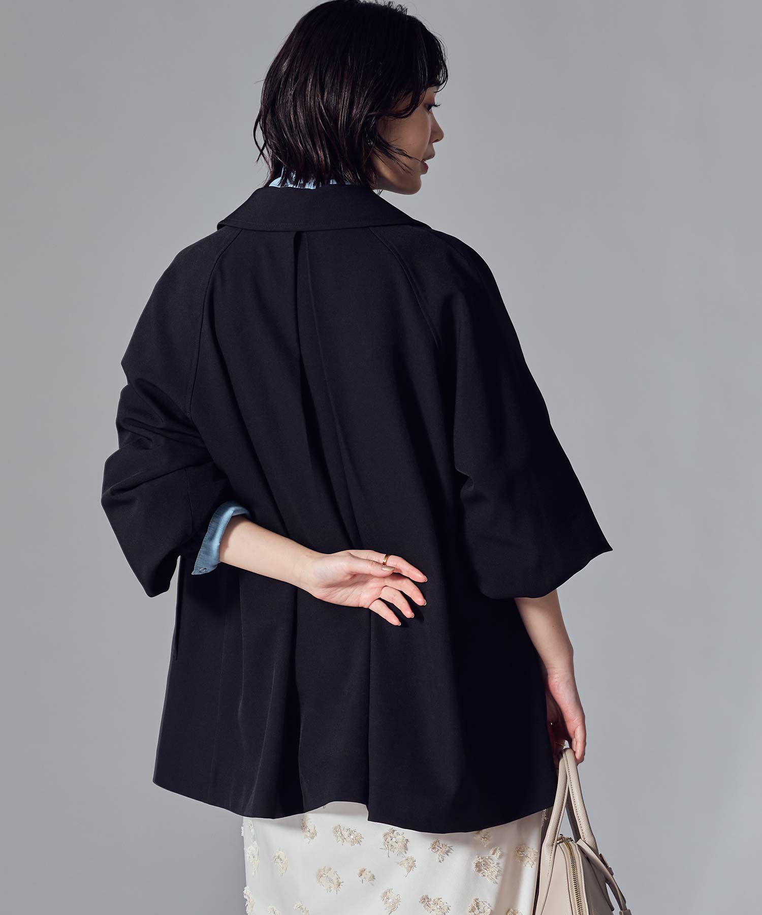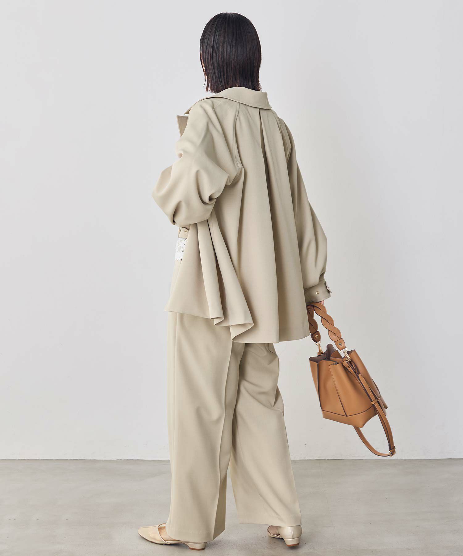 トラディショナルなトレンチコートのディティールを取り入れながら、Aラインに広がるテント型のシルエットがトレンド感のある印象に仕上げたコート。