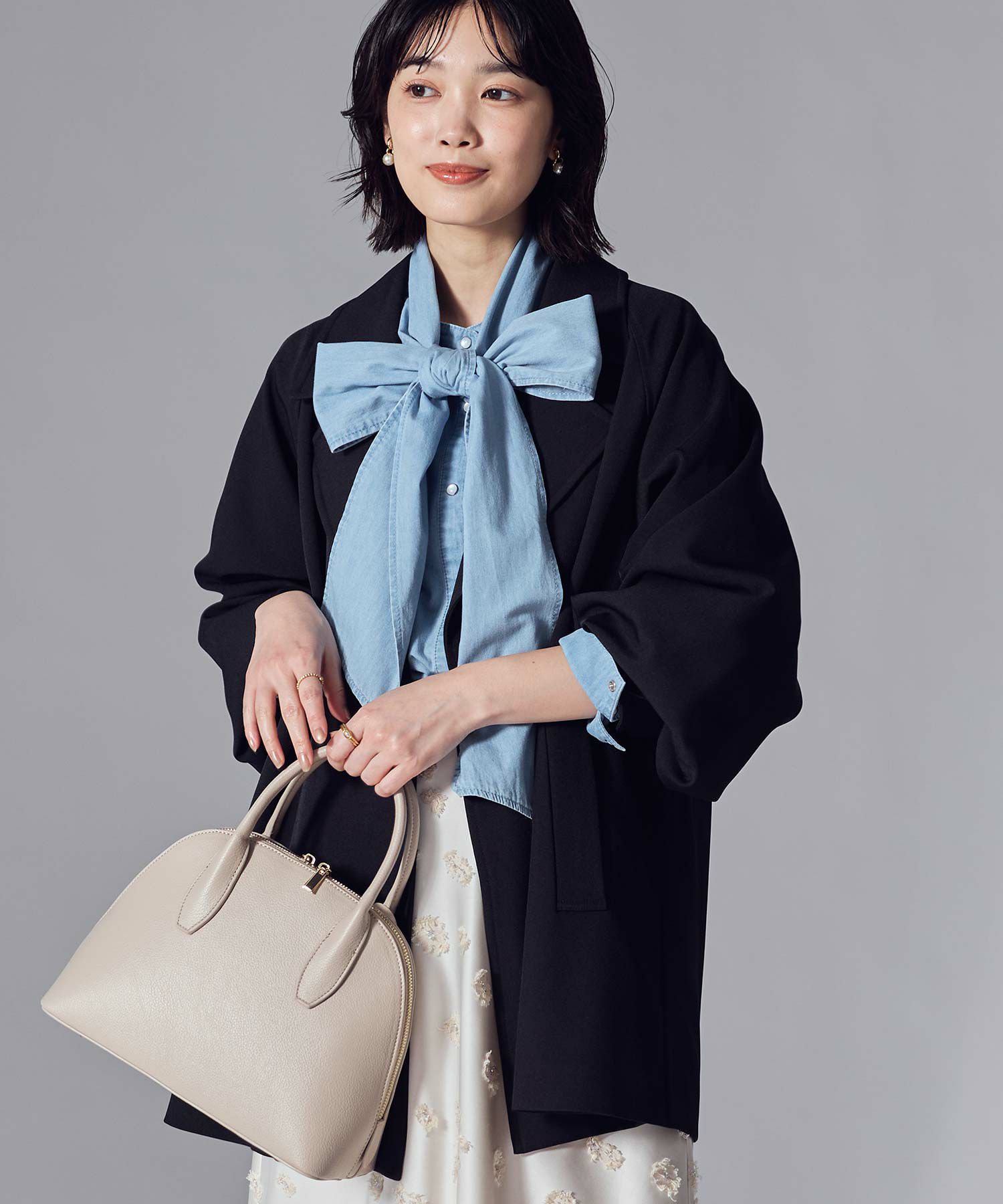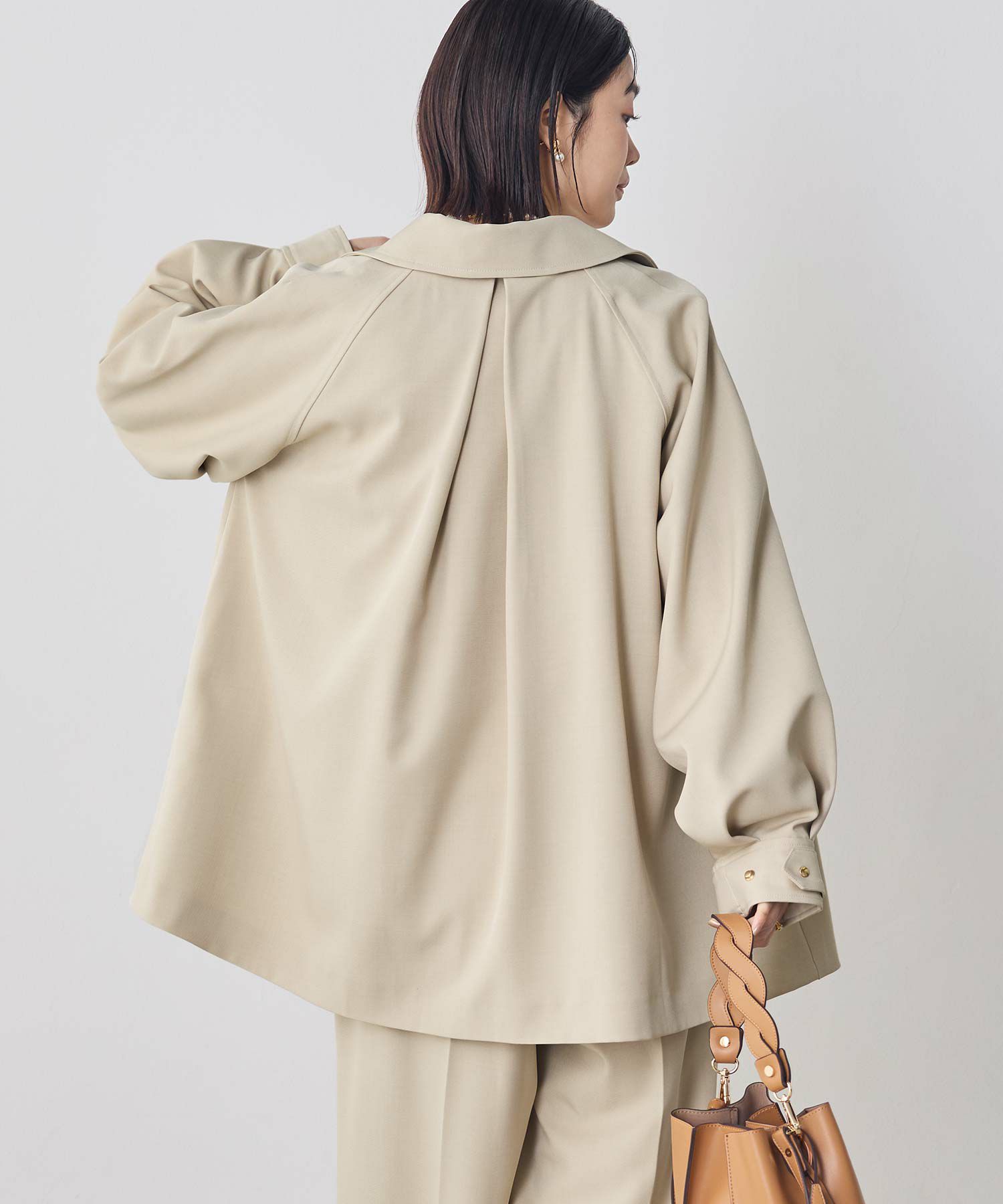 袖口はギュッと絞ってボリュームを出したり、あえて釦を金属のドットにしてシンプルに仕上げる着こなしも。