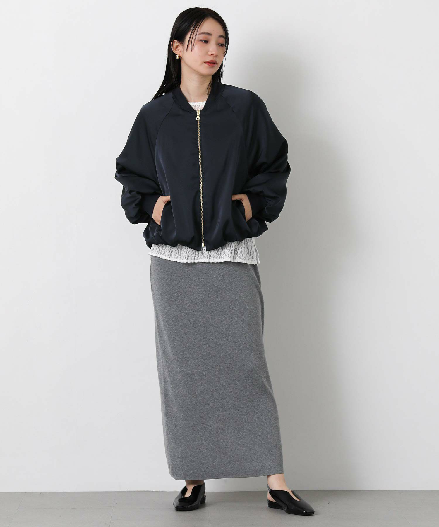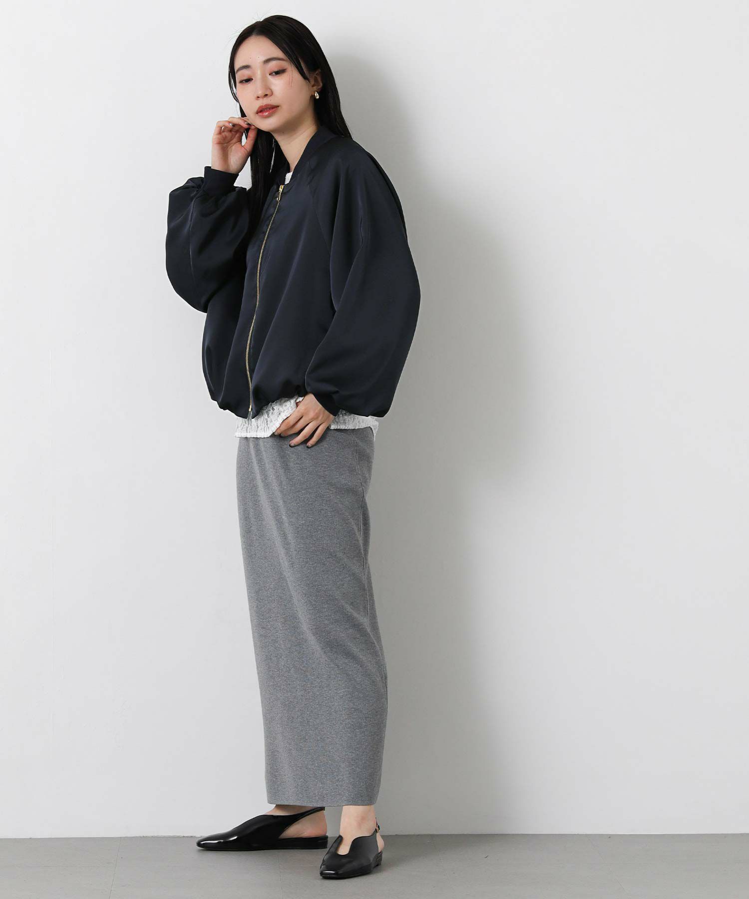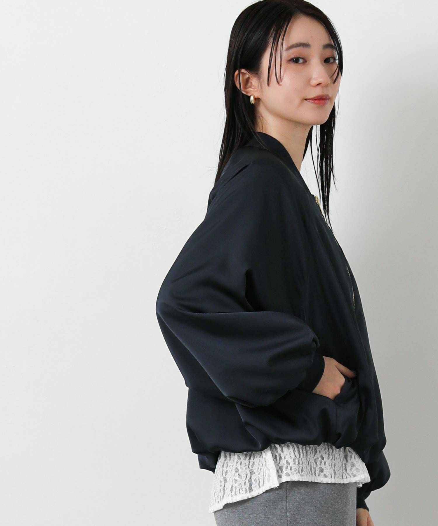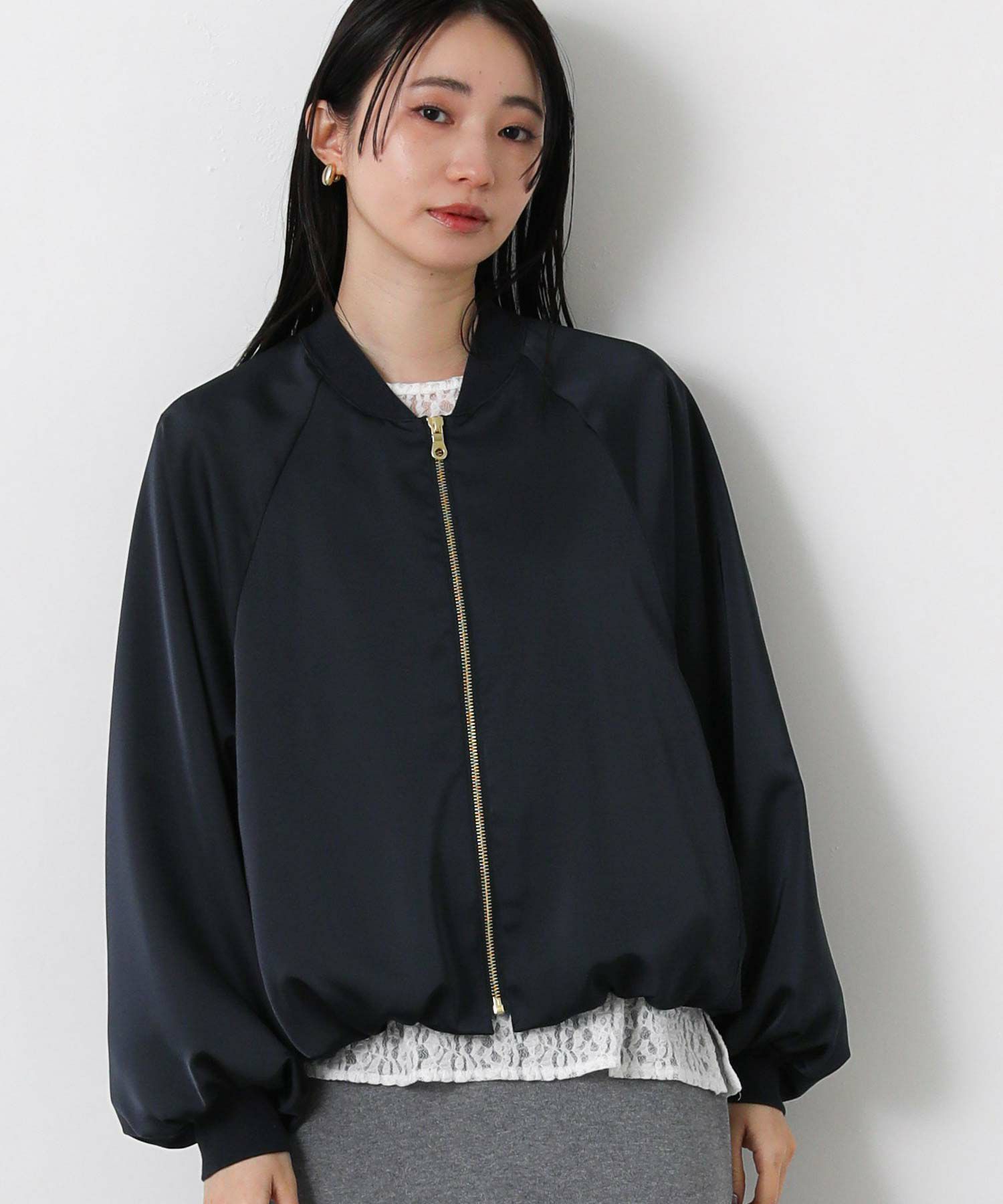 なめらかな微光沢感が美しいサテン素材を使用したブルゾン。