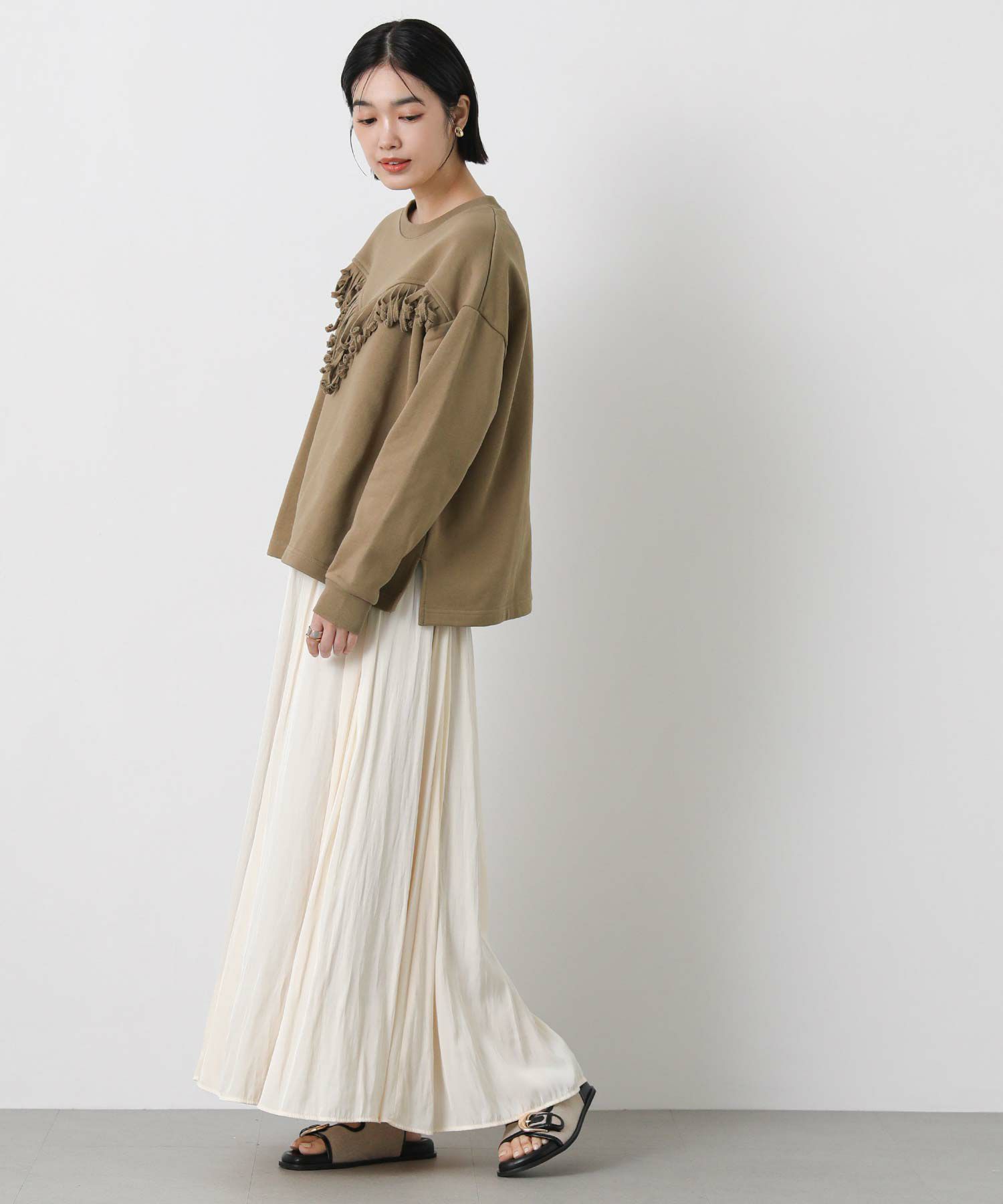 裾が止まらないシルエットで、スカートでもパンツでもスタイリングしやすくなっています。
