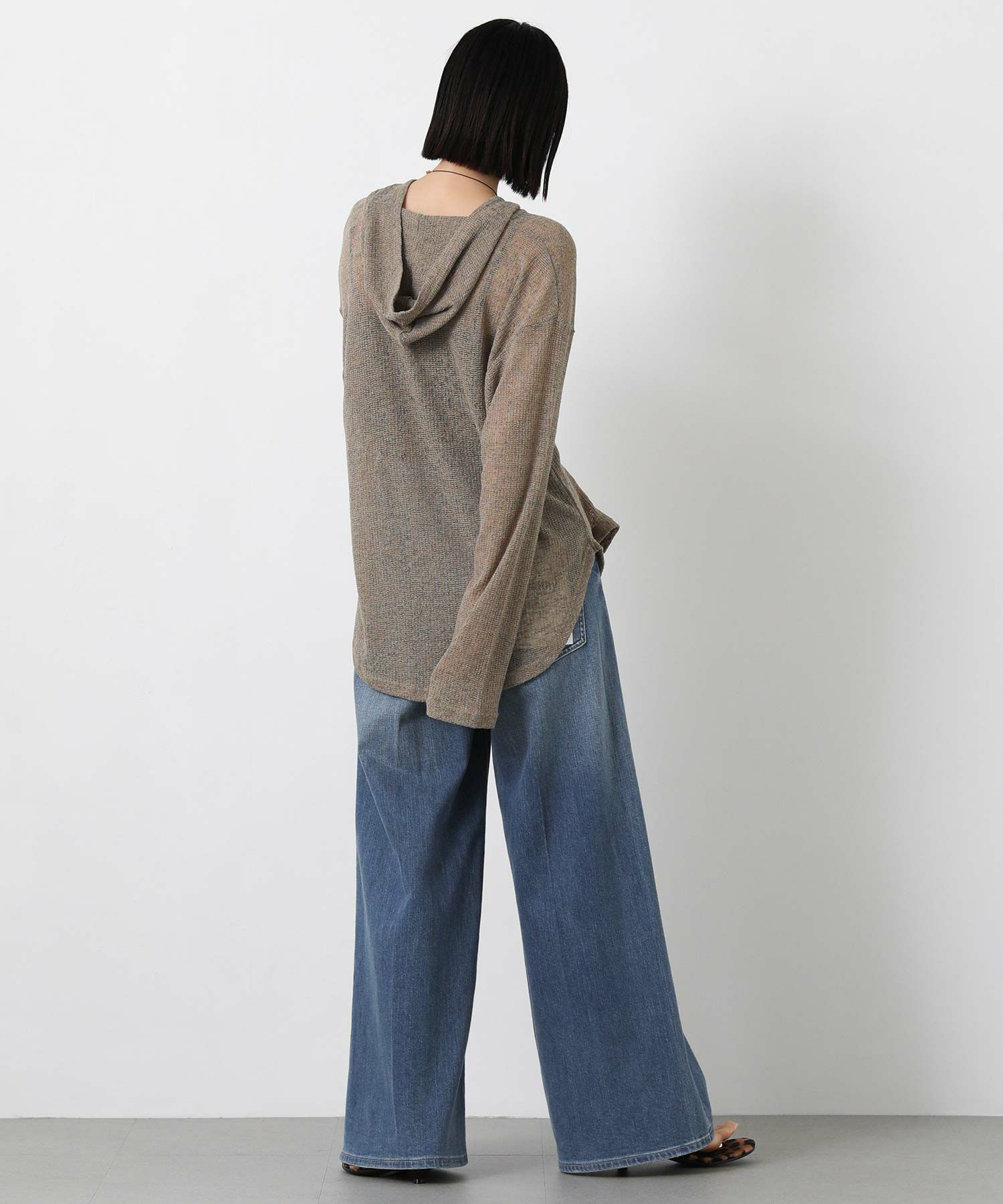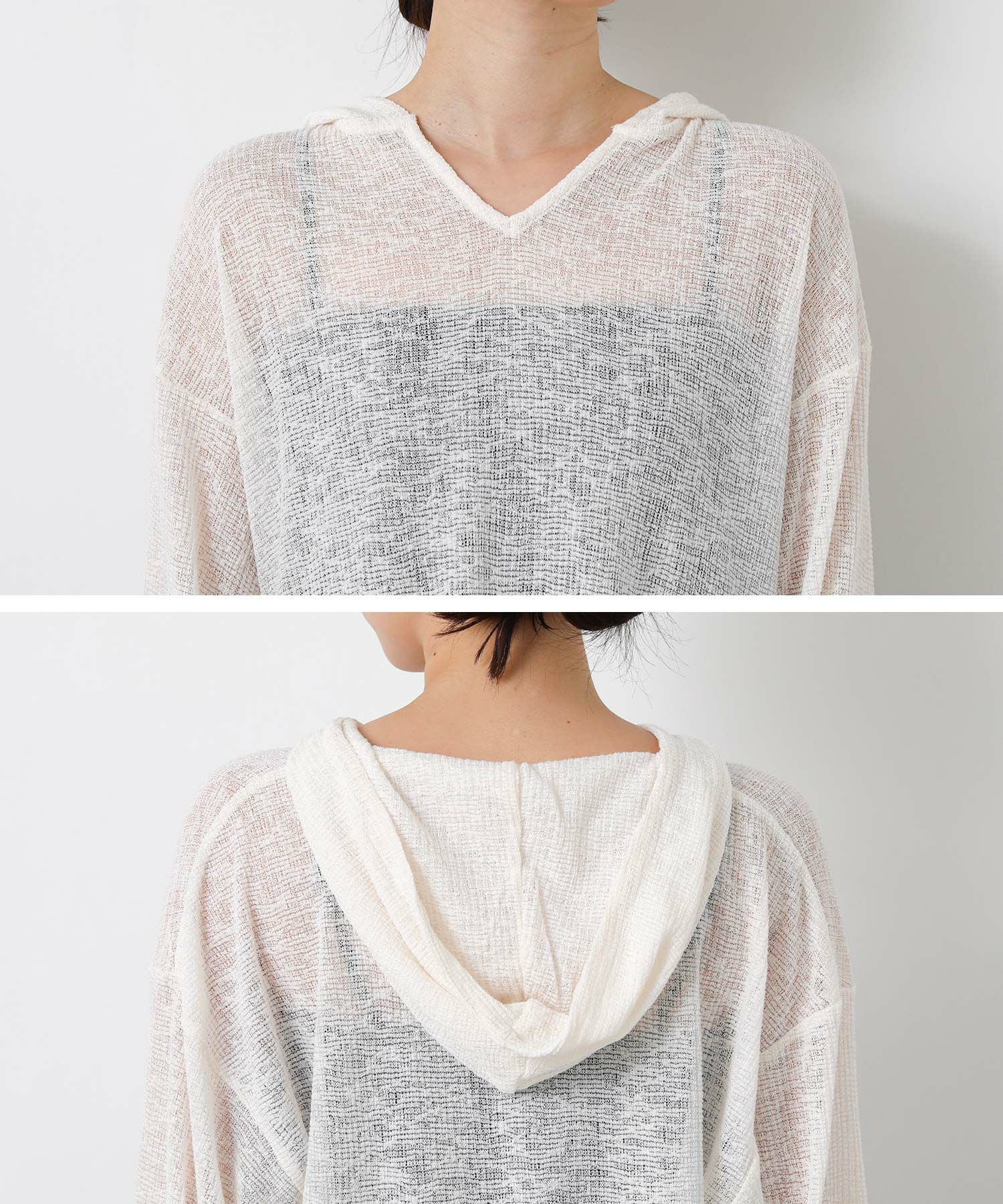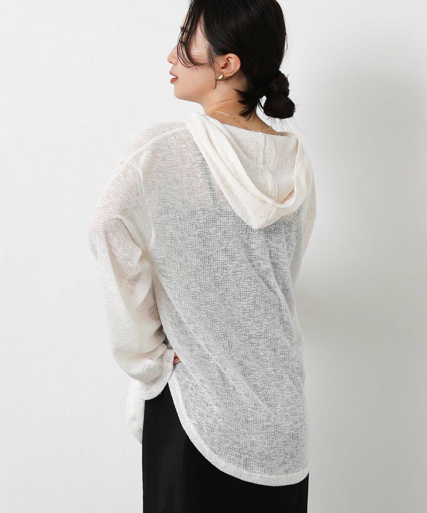 カジュアルな印象のフーディーを、ほんのりシアーな軽やかなカットソーでこなれ感のある1枚に。
