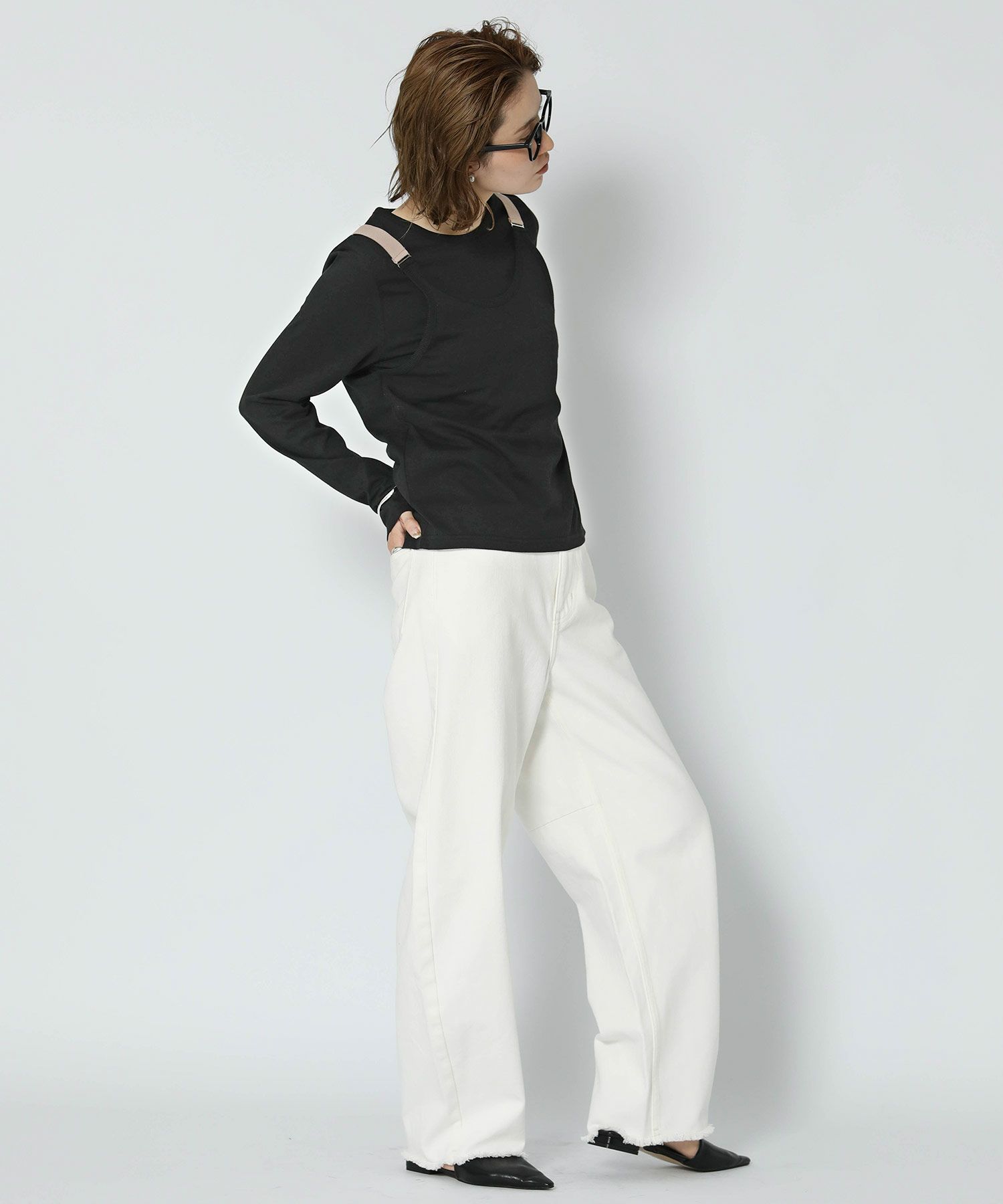 1枚でレイヤードコーデが楽しめる一枚。コンパクトな丈感なので、着ぶくれすることなく、様々なトップスとレイヤードしてお楽しみいただけます。太めに設定した肩紐は、肩幅を華奢に見せる効果も◎