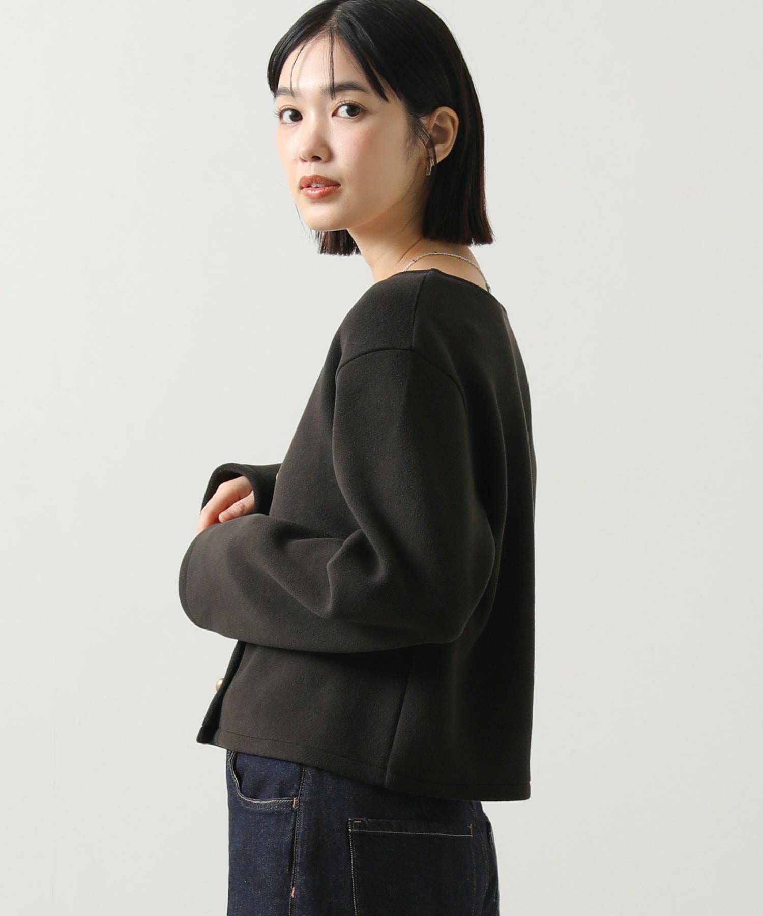 その日のスタイリングに合わせて羽織りとしてもプルオーバー風にも着用でき、着こなしの幅が広がります。