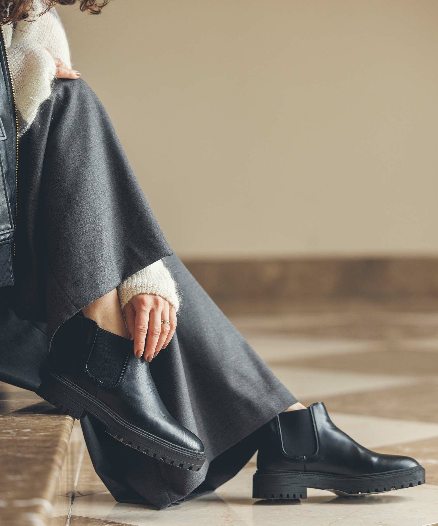 スカートスタイルはもちろん、パンツでもさっと履け、バランスよく決まります。