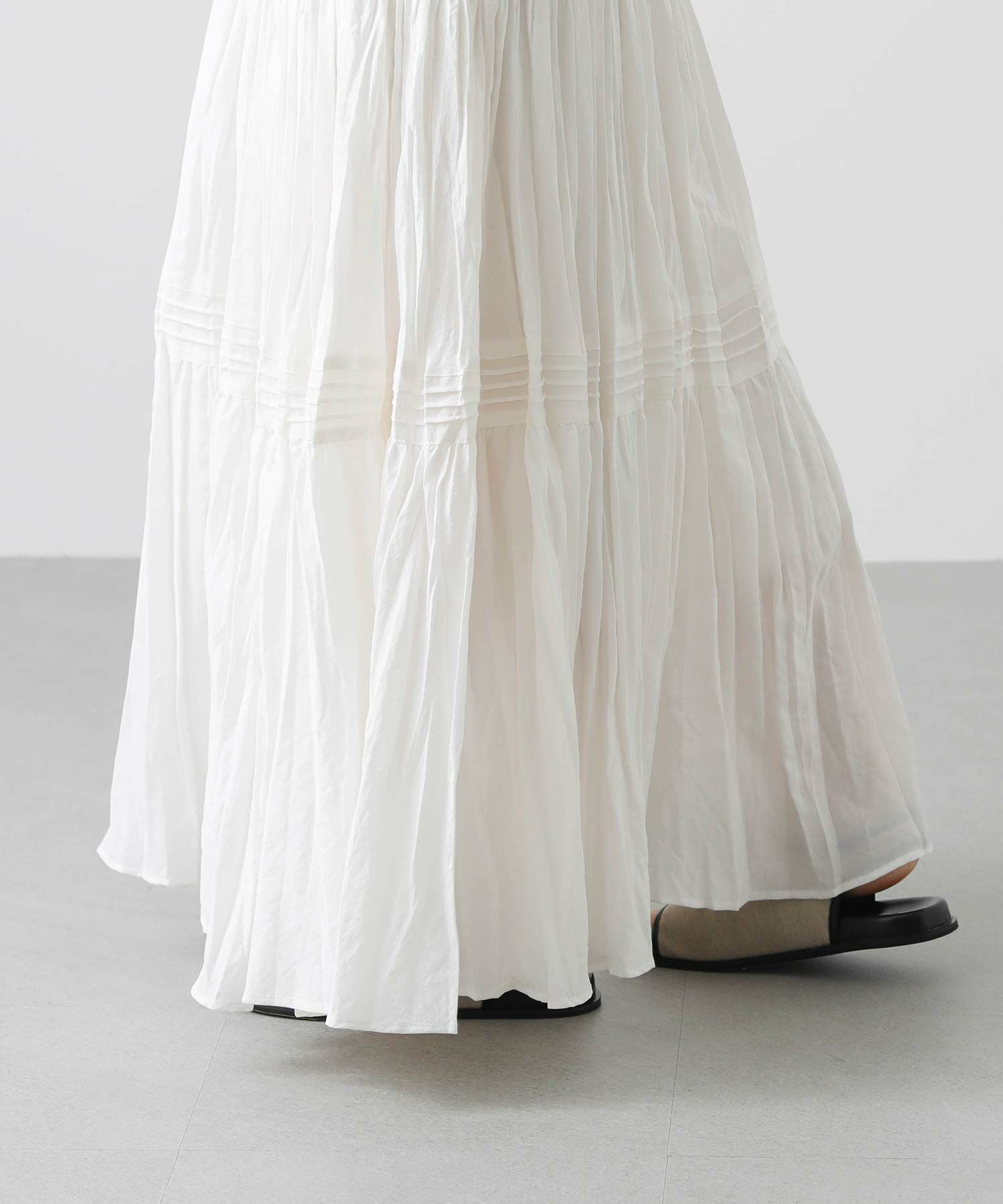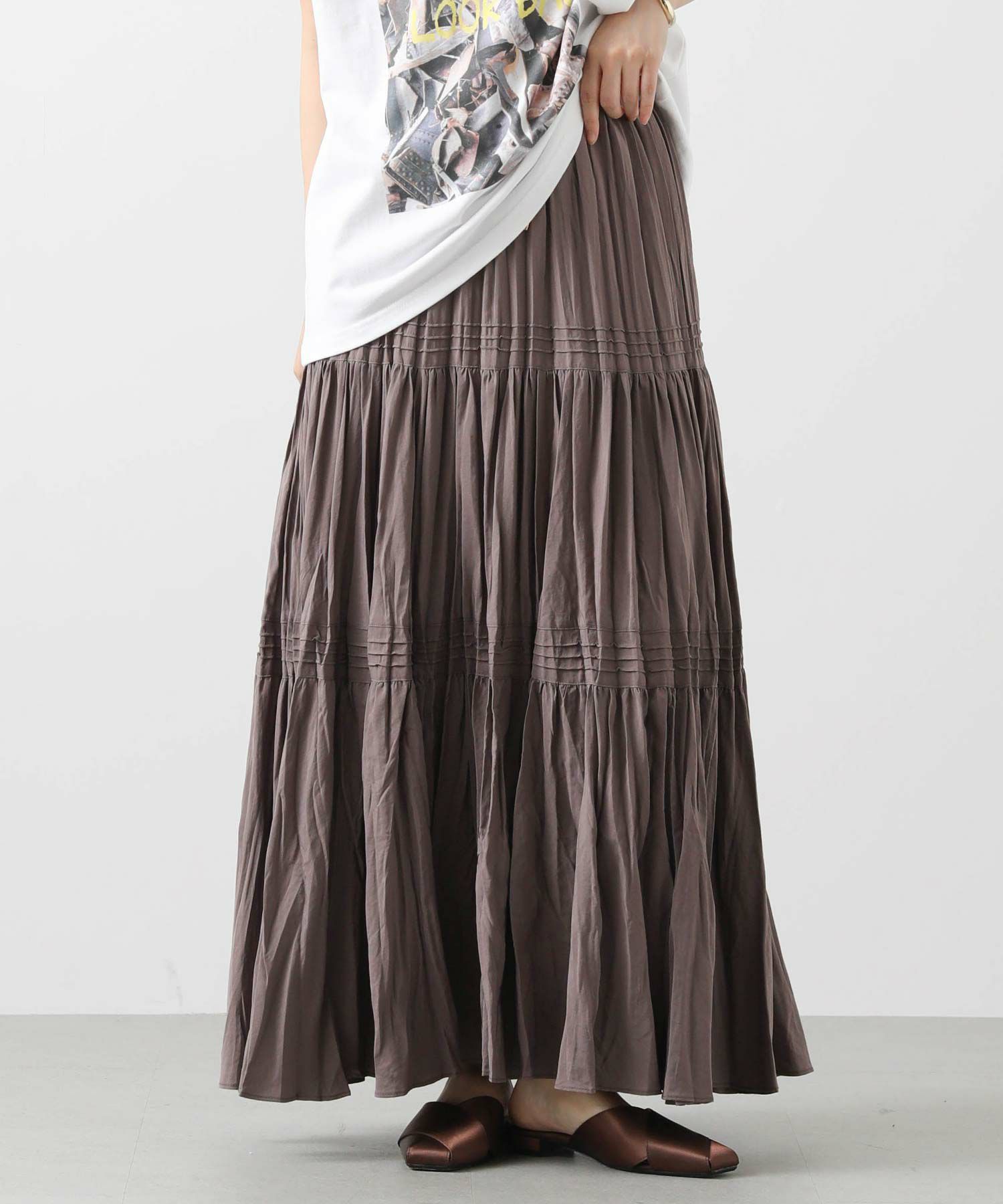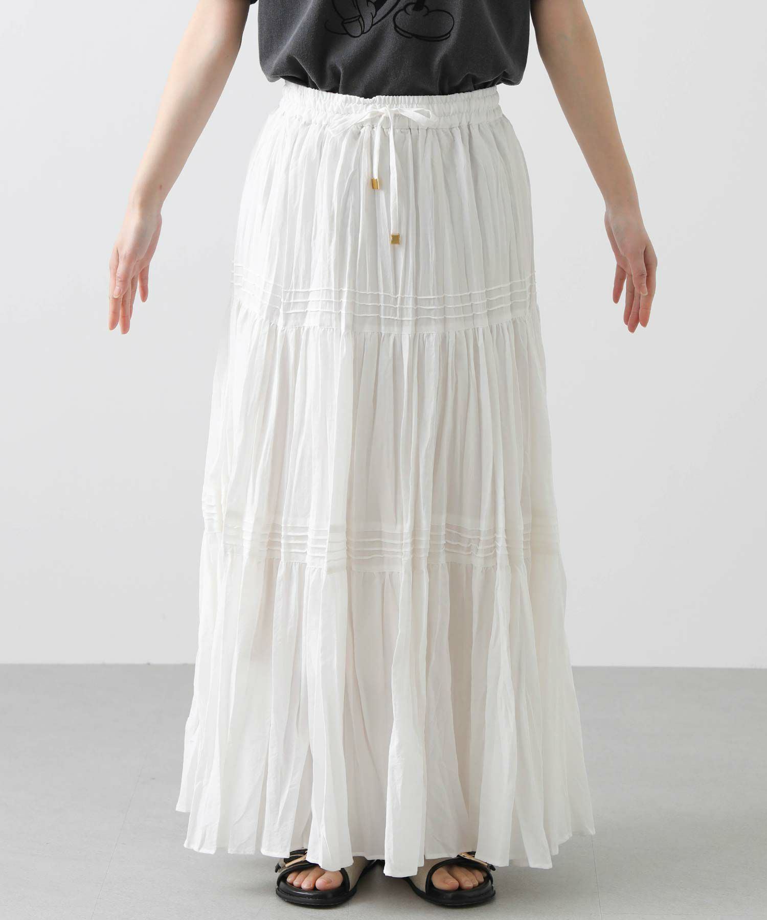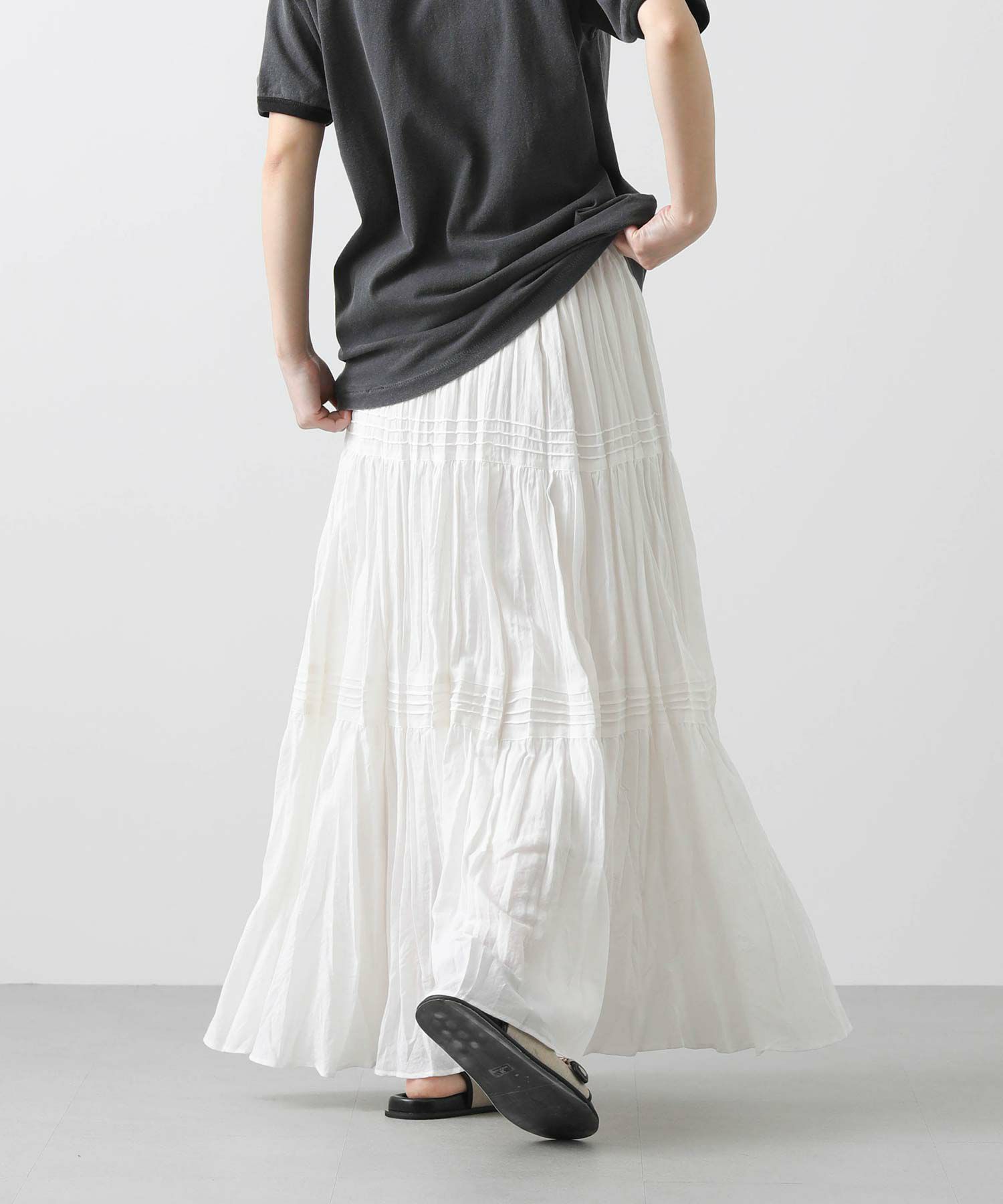 ティアードデザインながら、腰回りにボリュームがでないので、すっきり見せてくれます。切り替えのピンタックデザインがポイント。ポリエステルのローン生地でカジュアル過ぎずきれいめな印象です。