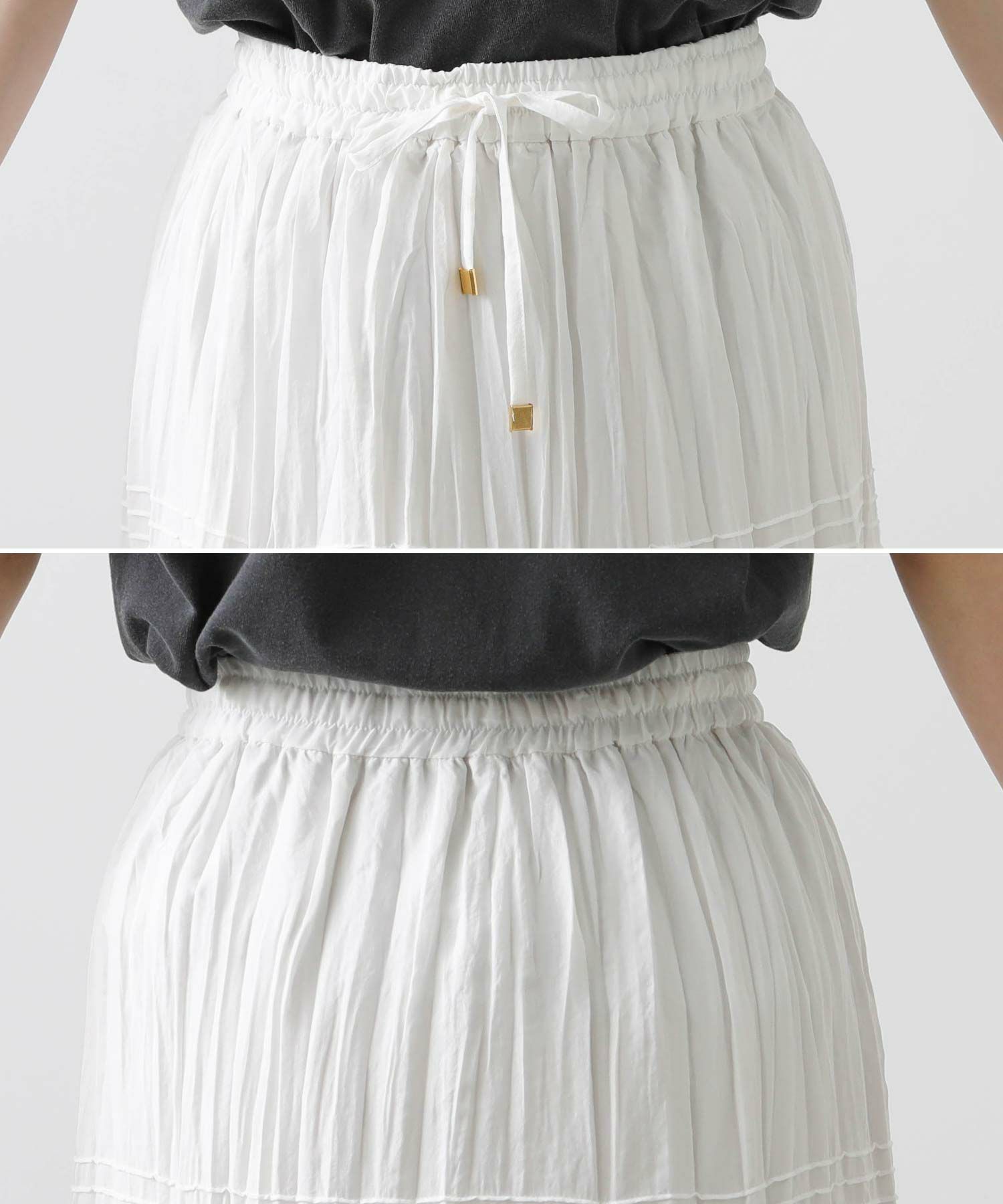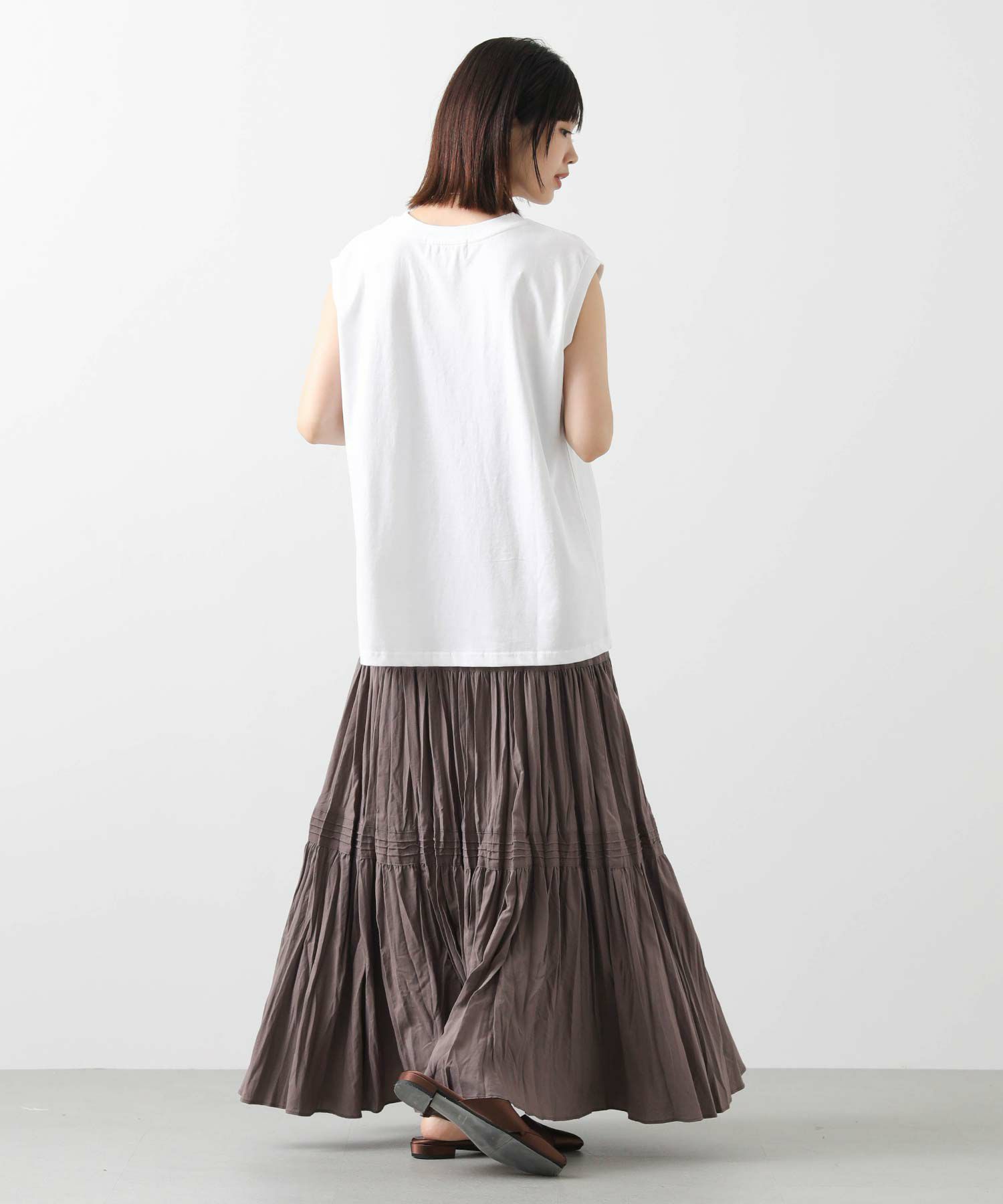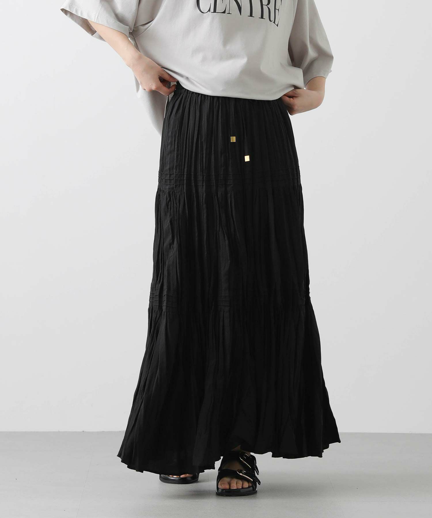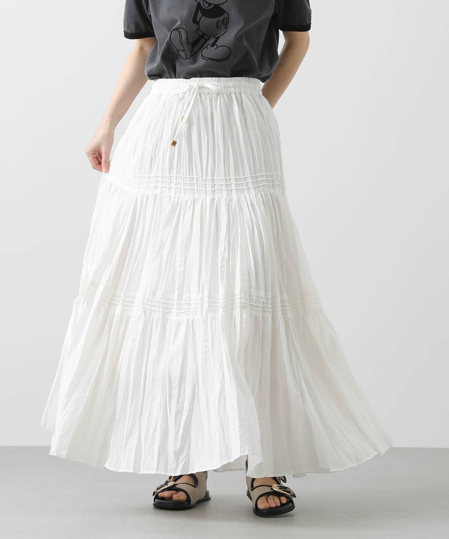 ティアードデザインながら、腰回りにボリュームがでないので、すっきり見せてくれます。切り替えのピンタックデザインがポイント。ポリエステルのローン生地でカジュアル過ぎずきれいめな印象です。