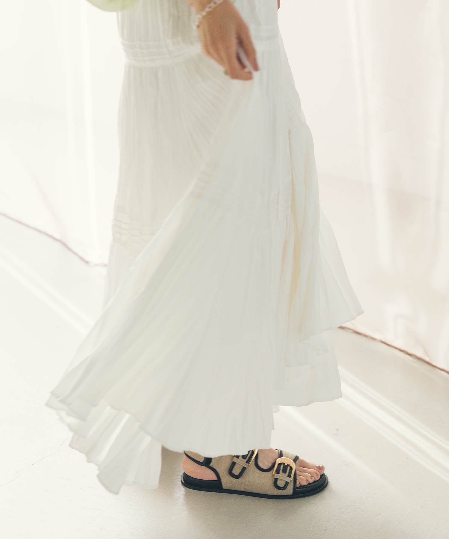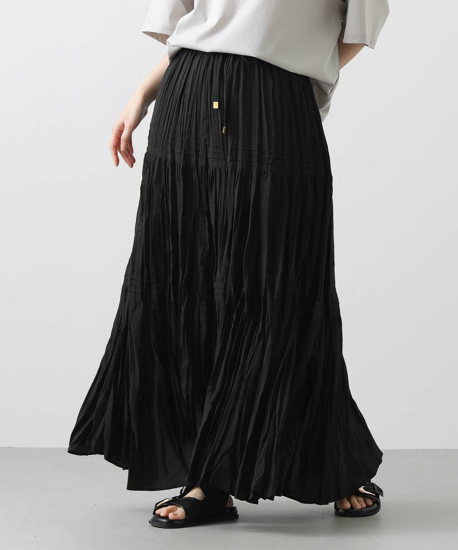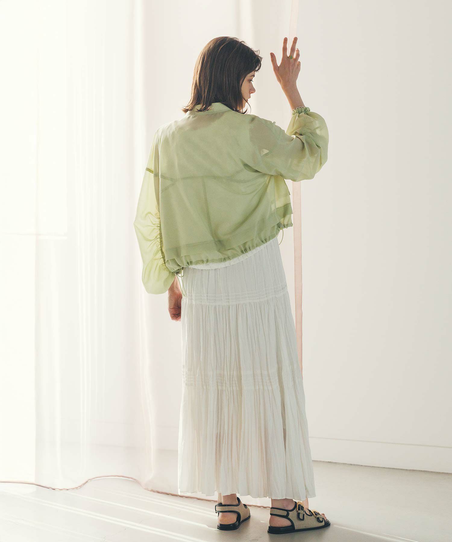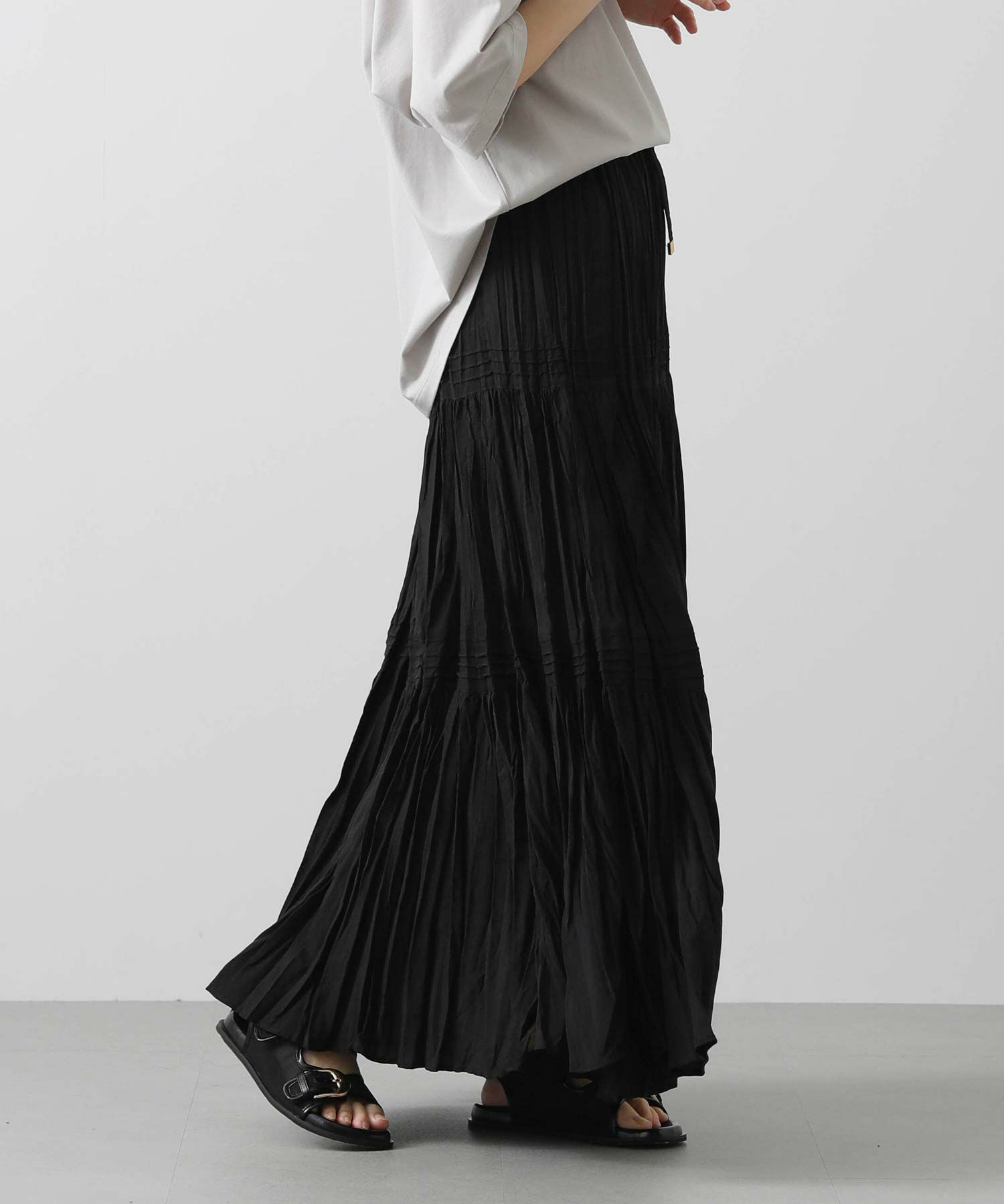 ティアードデザインながら、腰回りにボリュームがでないので、すっきり見せてくれます。切り替えのピンタックデザインがポイント。ポリエステルのローン生地でカジュアル過ぎずきれいめな印象です。