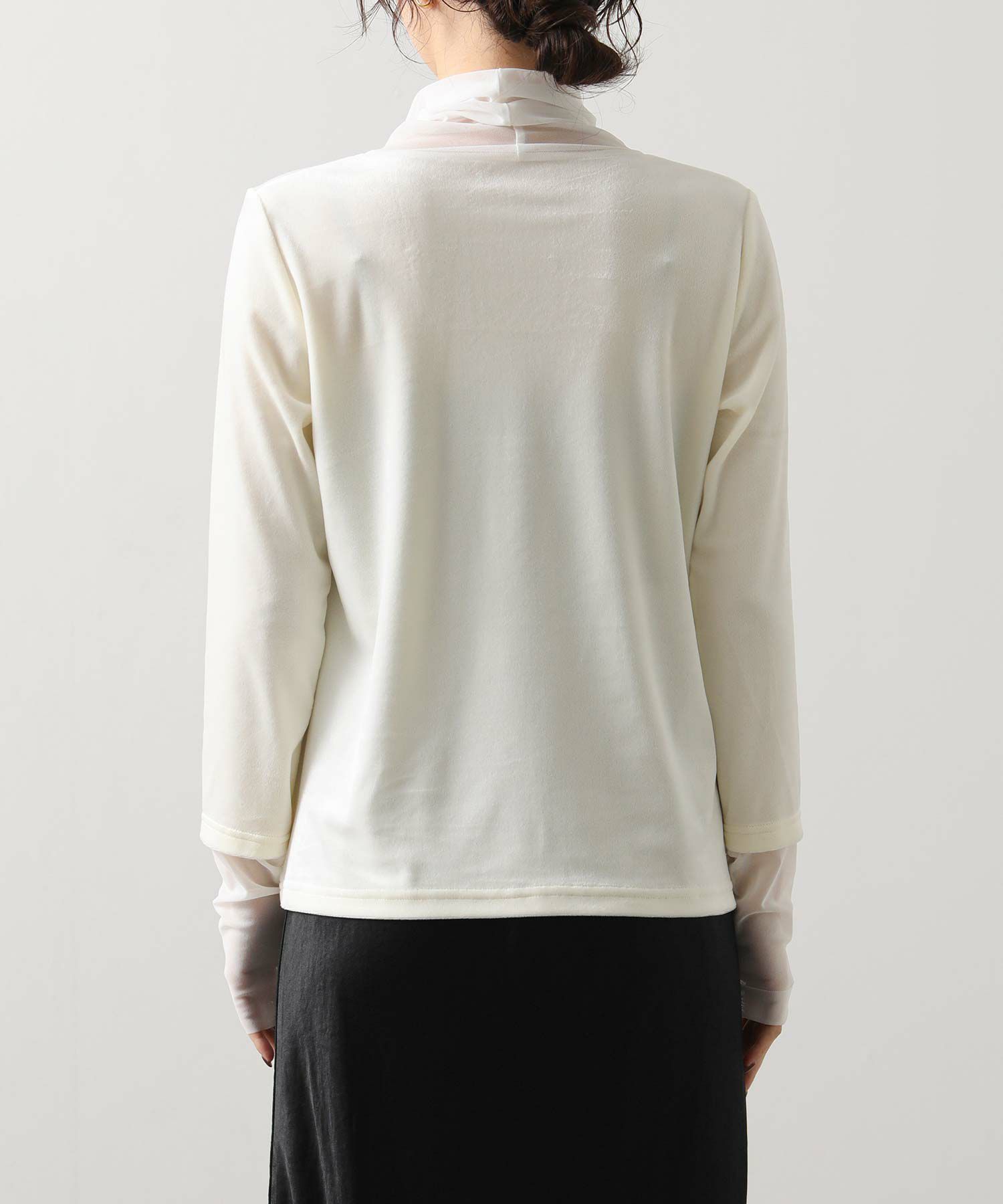 チュールの袖口をちらりと見せるスタイルで、洗練された抜け感をプラス。