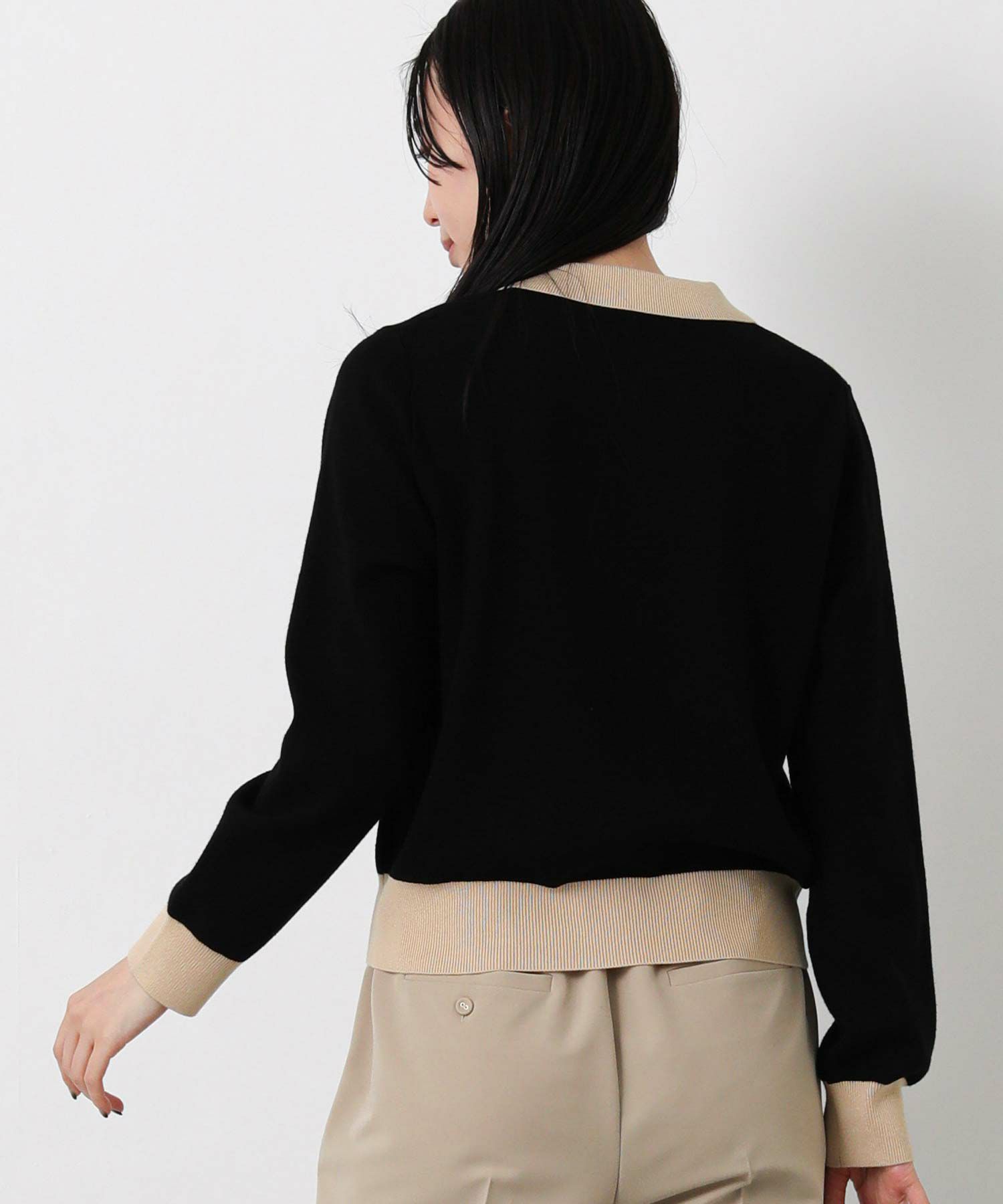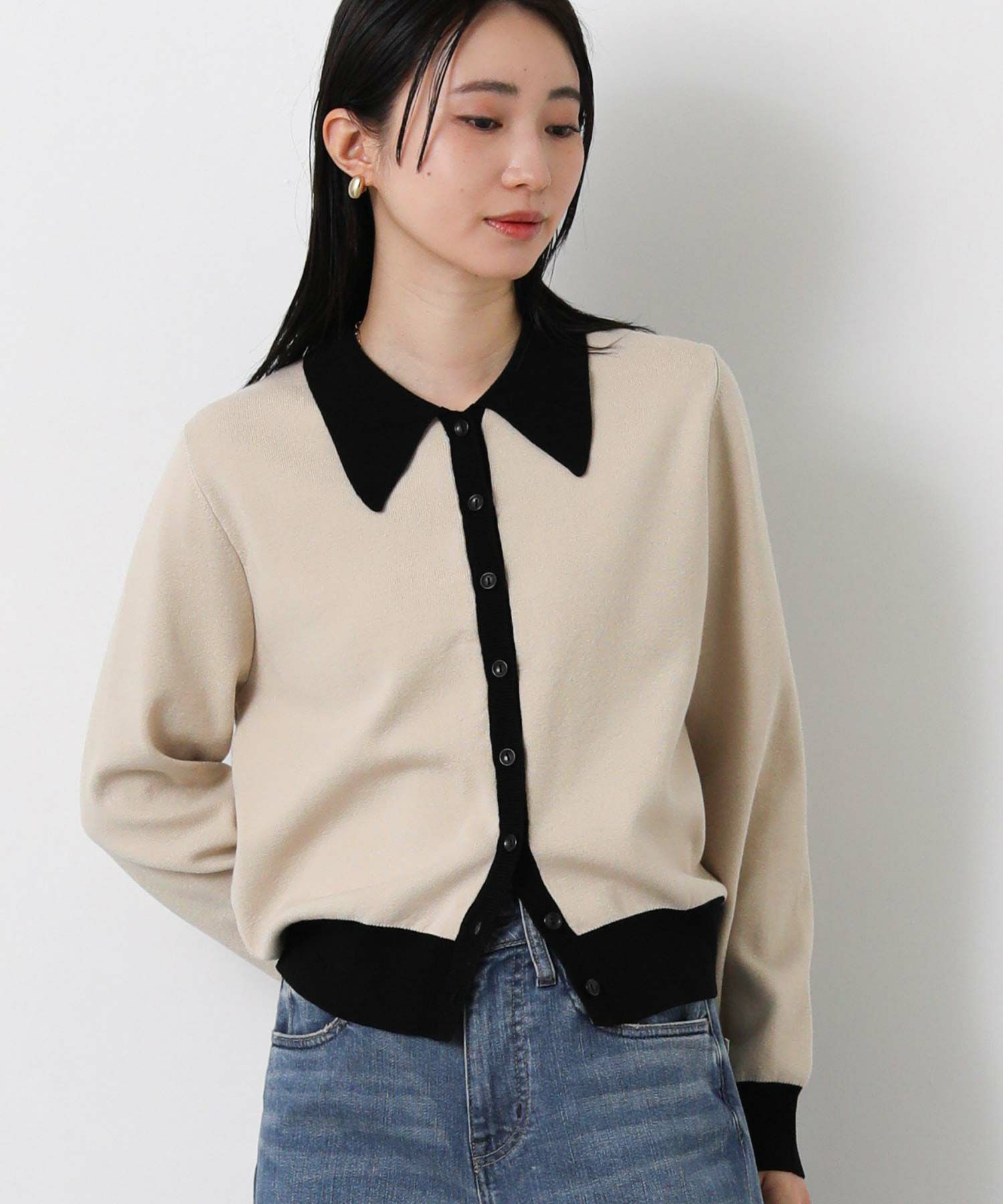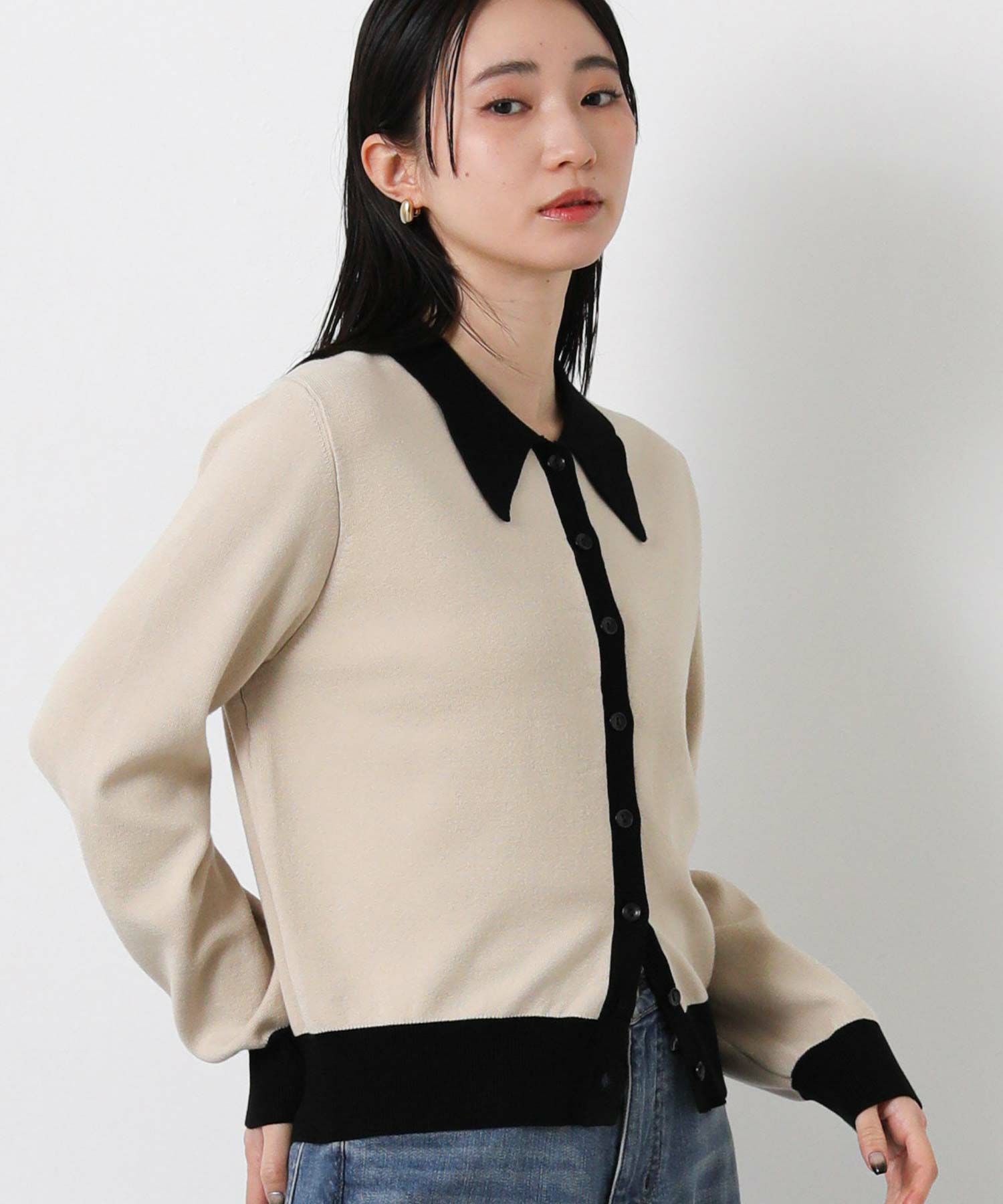 バイカラーの配色が目を惹く、クラシカルな印象のポロ衿ニットカーデ。