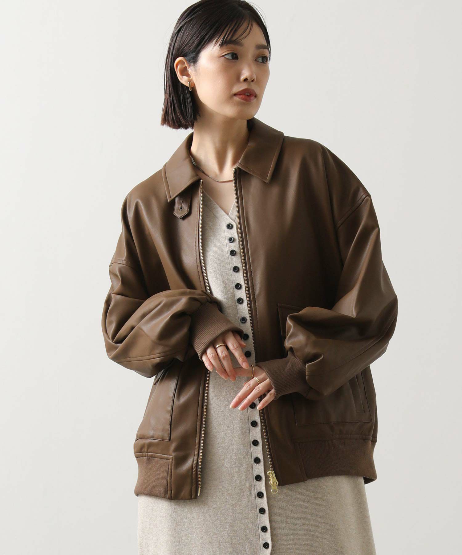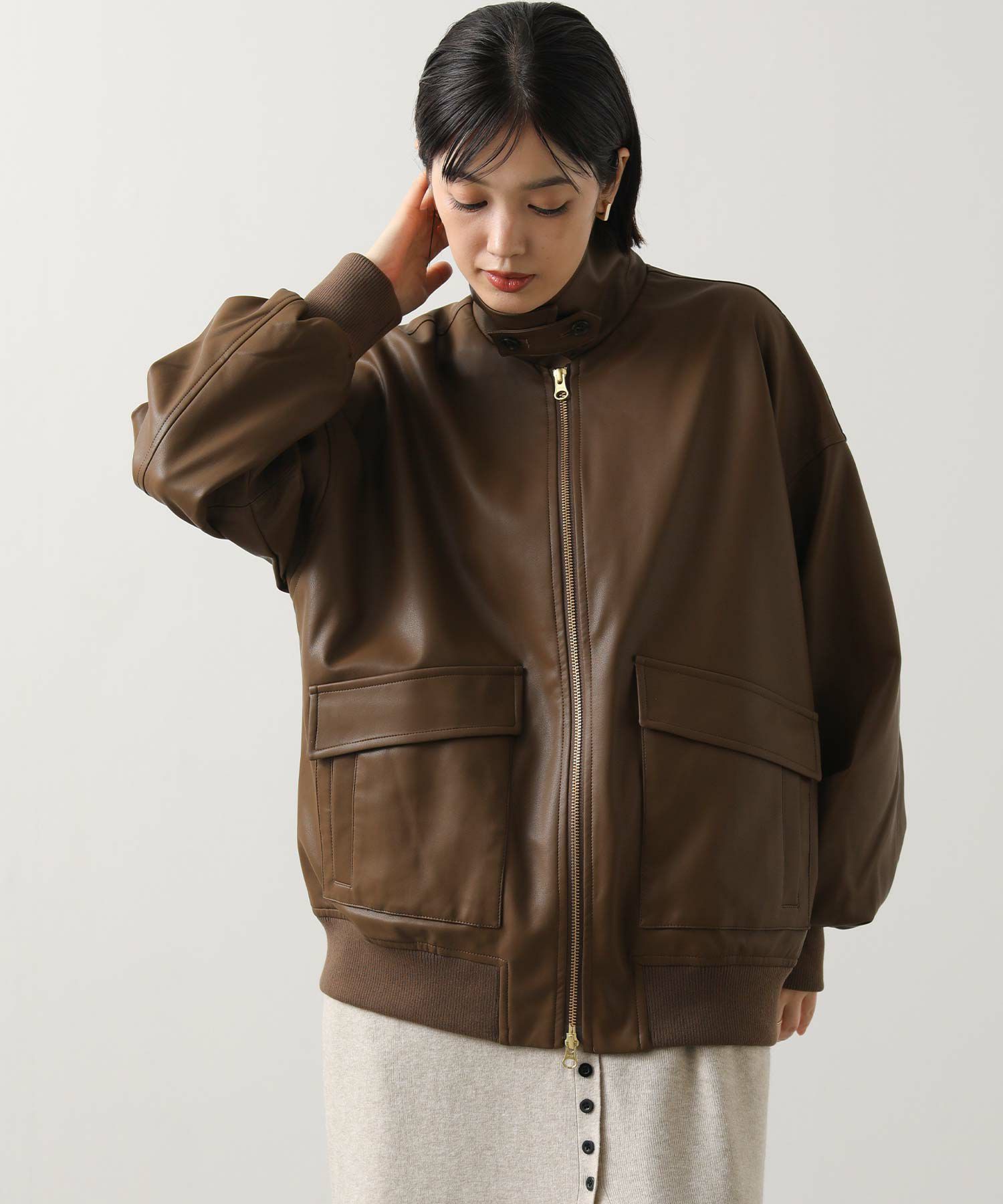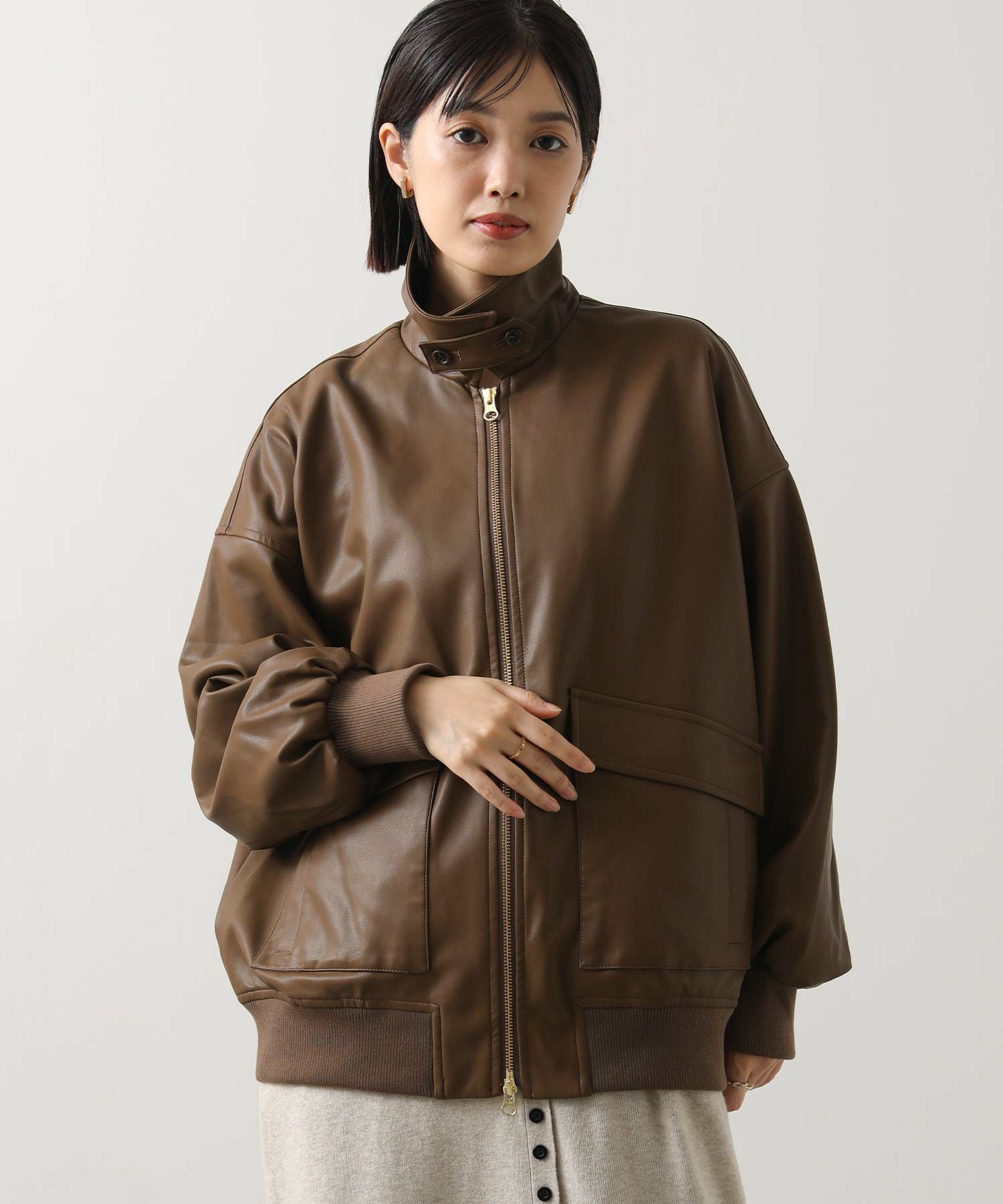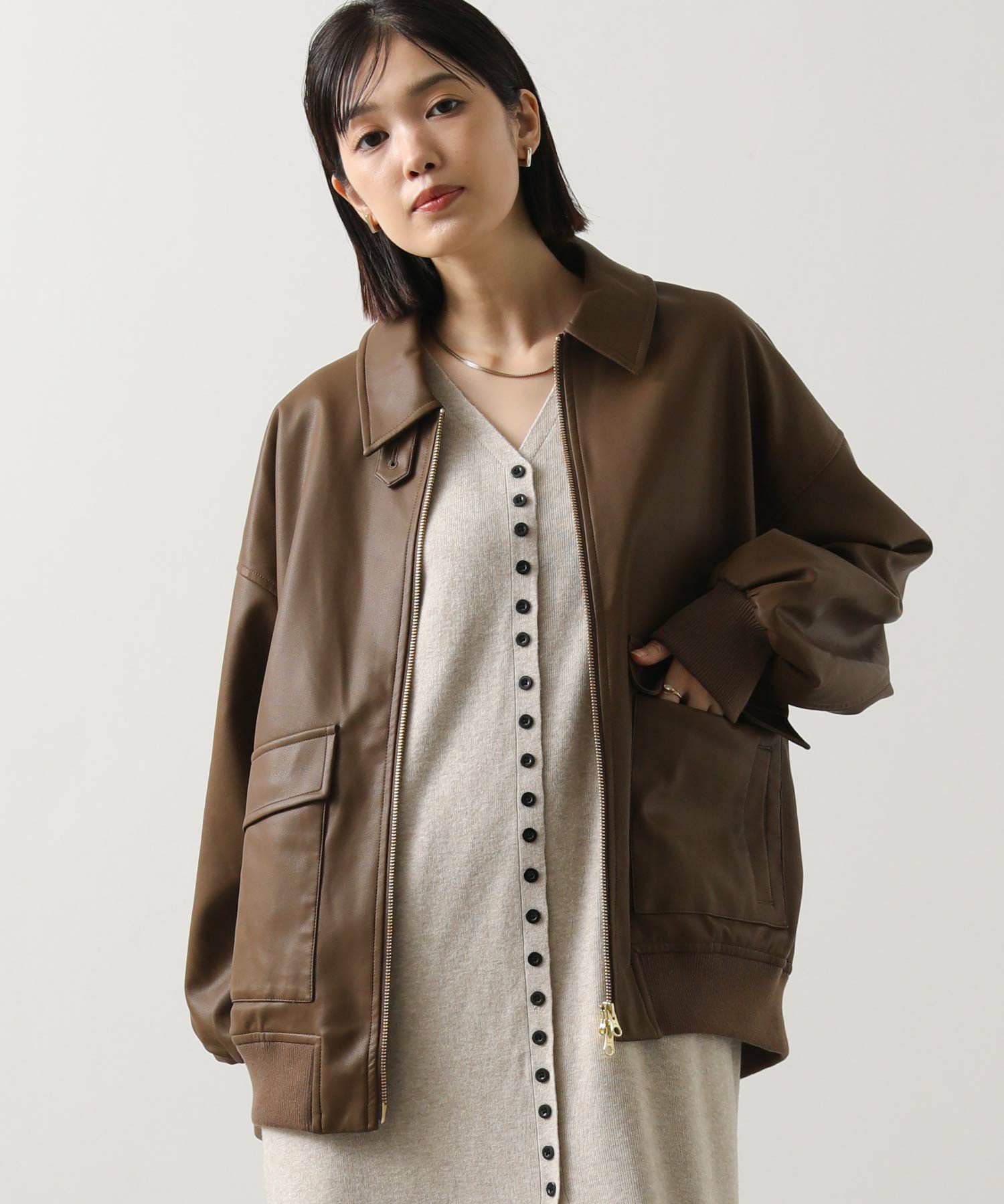オーバーサイズですが、リアルレザーと違い軽くて羽織りやすいのでデイリー使いにオススメ。