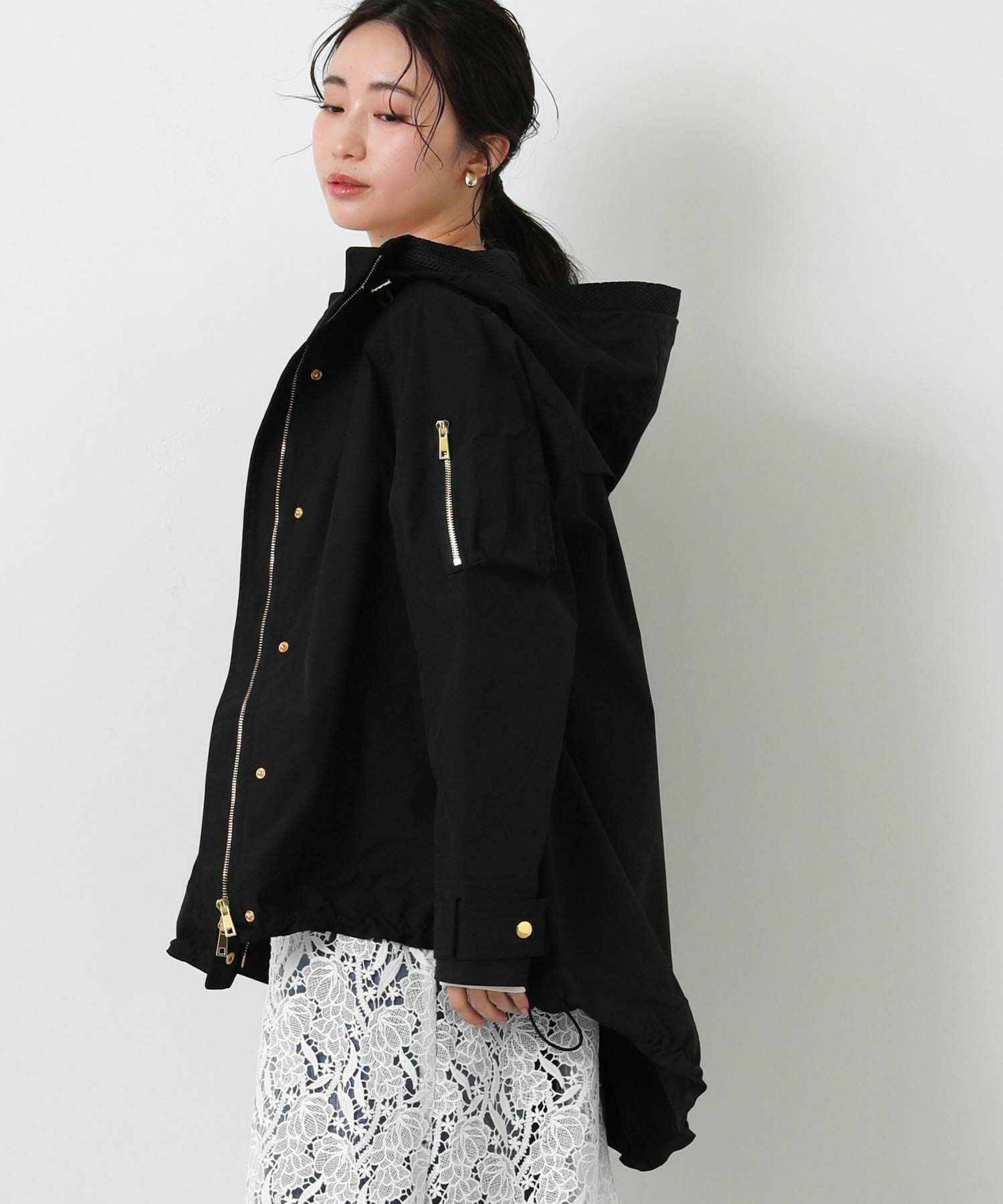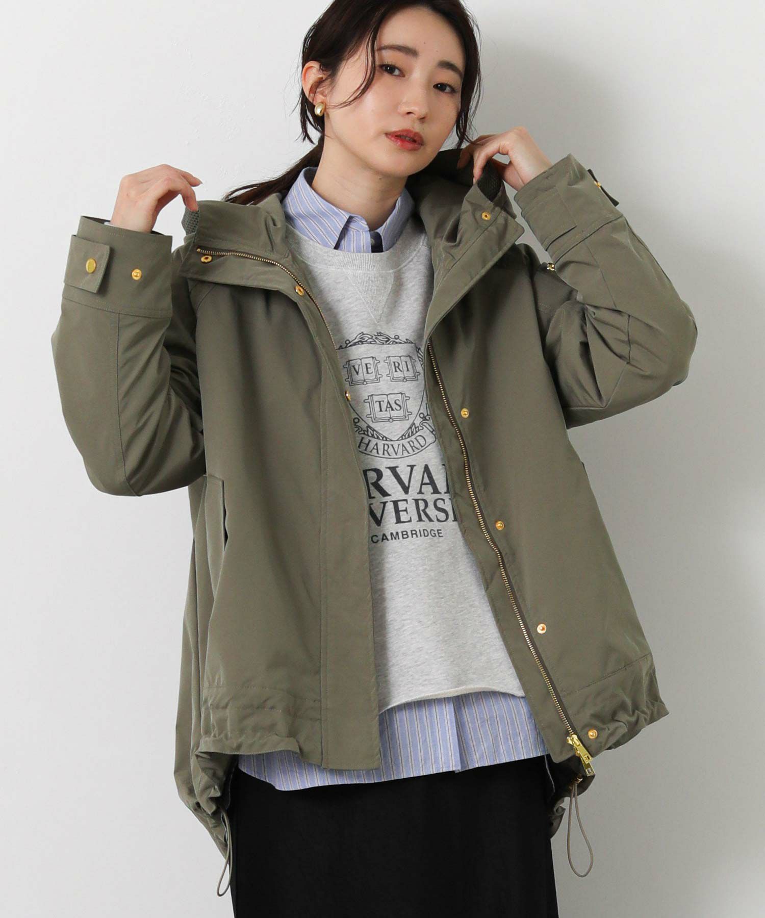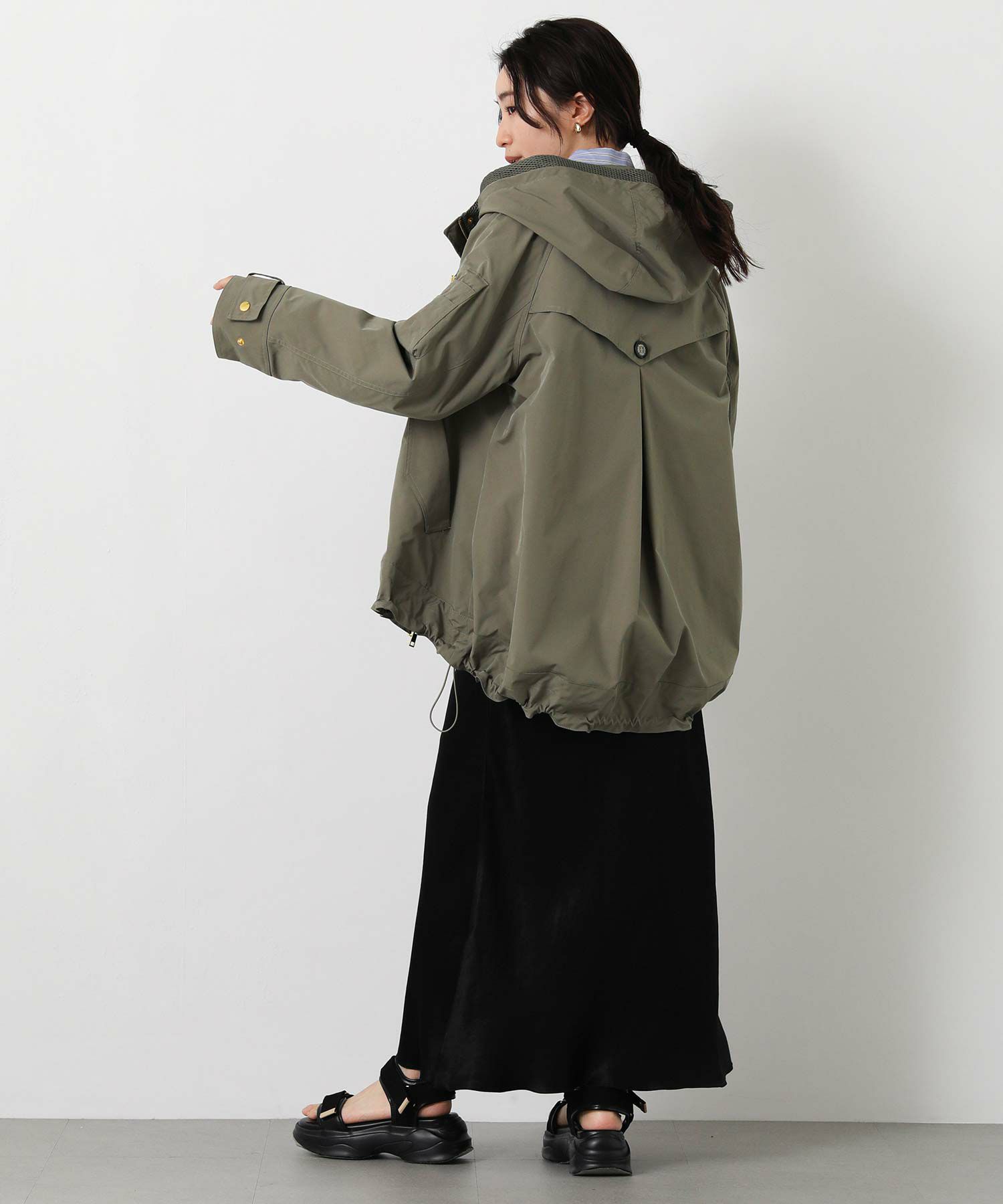 裾のドロストでシルエット調整もでき、パンツにもスカートにもバランス良く合わせられます。