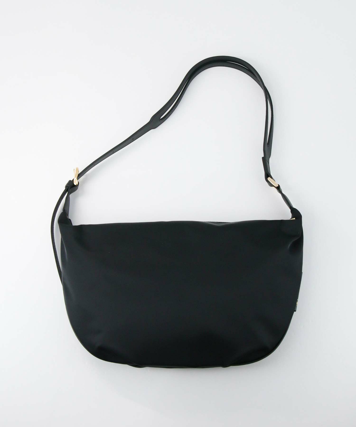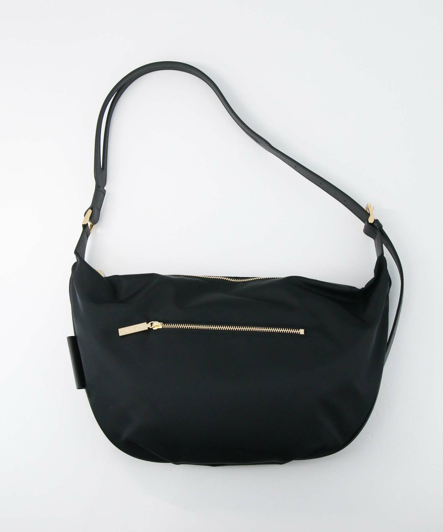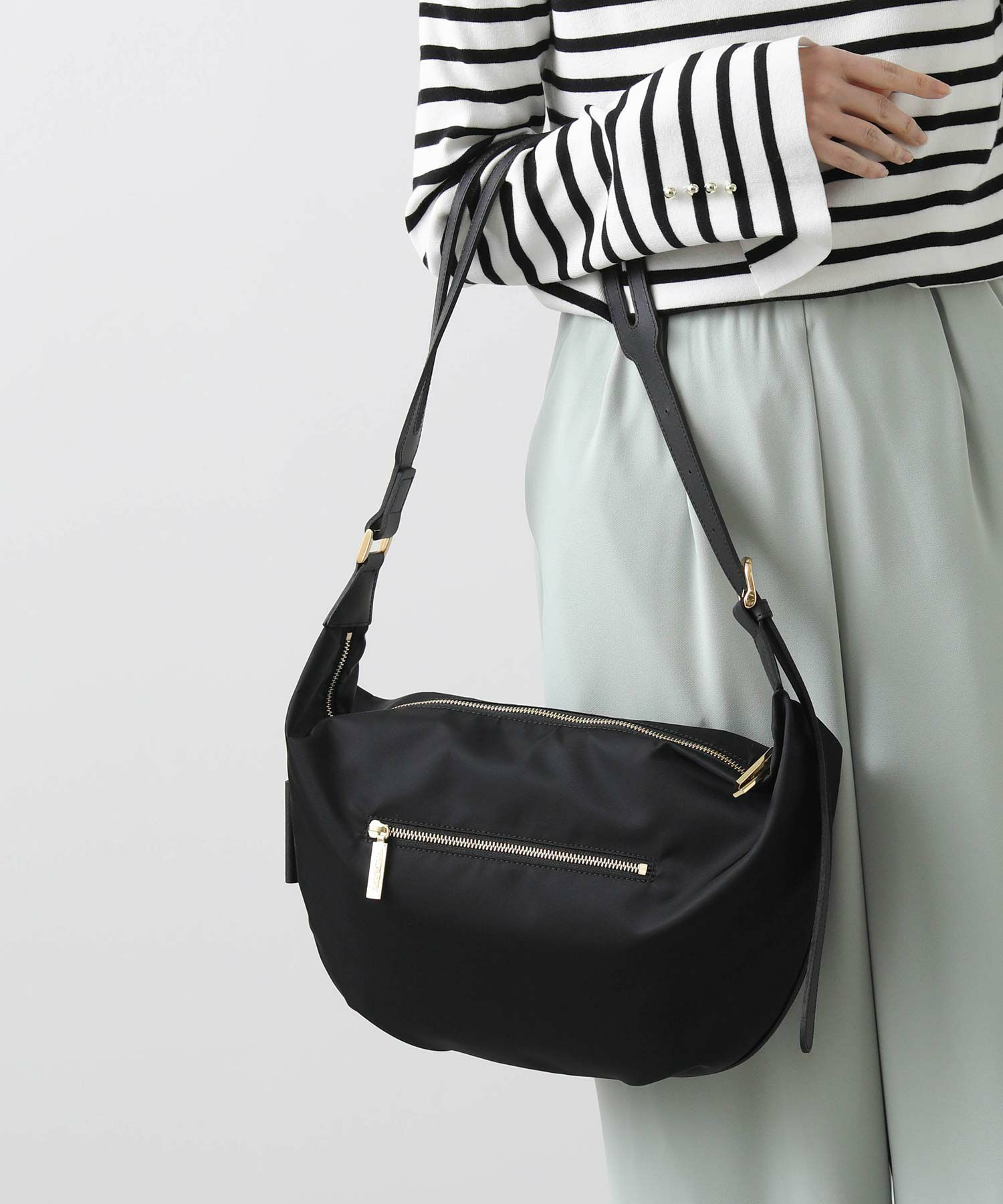 弱撥水性のあるカジュアルなナイロン素材にレザーのショルダーベルトの組み合わせが上品なボディバッグ。さり気ないゴールドパーツも華やかなアクセントに。