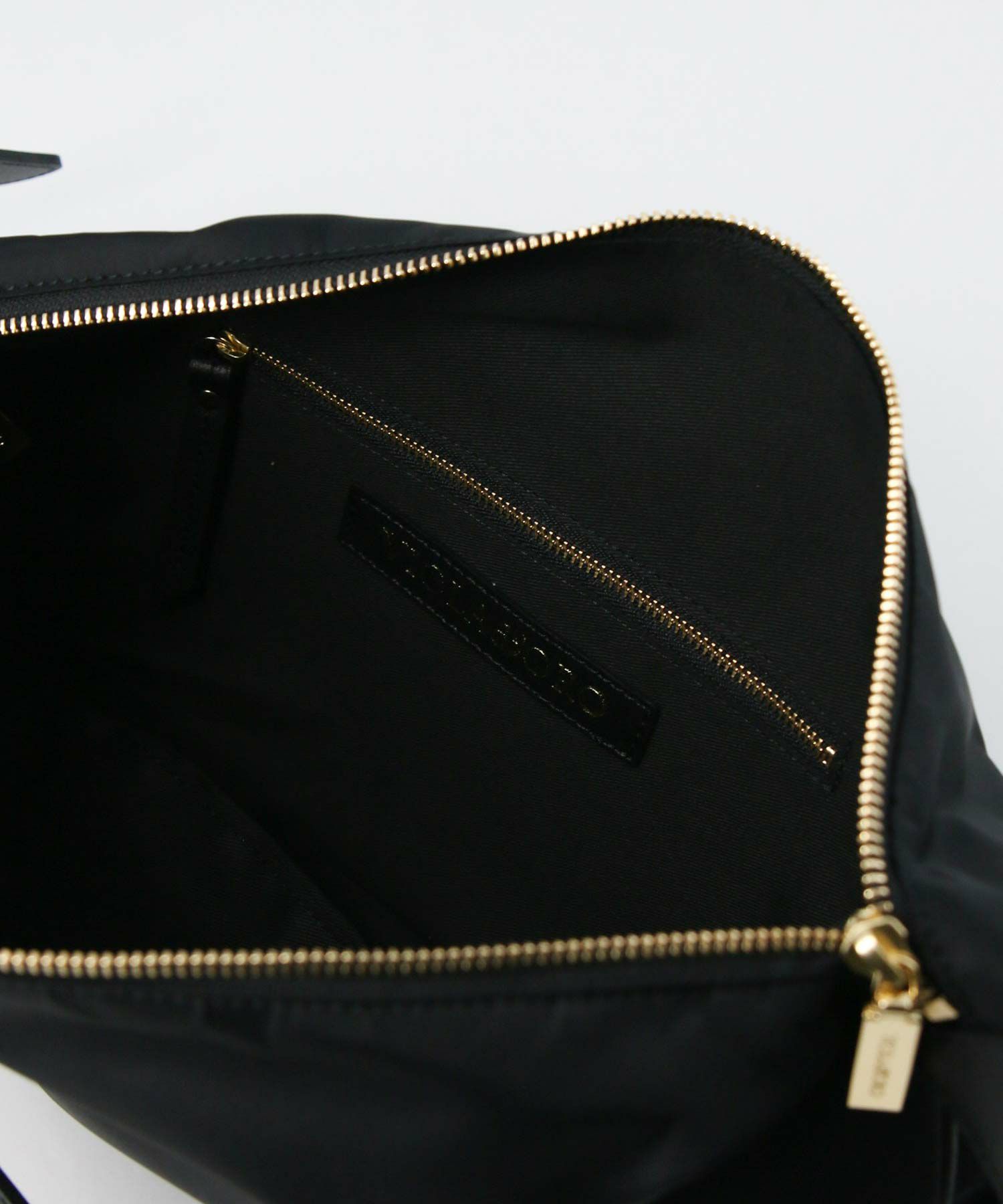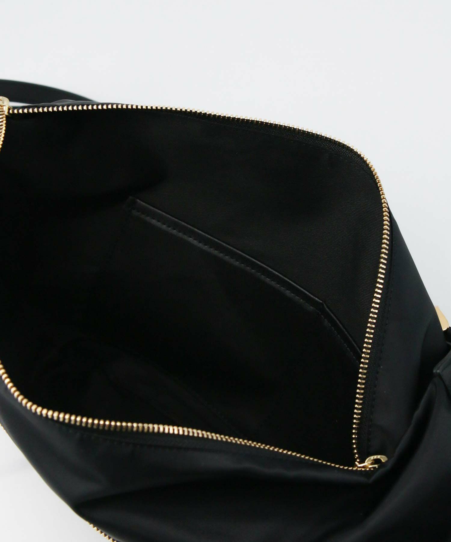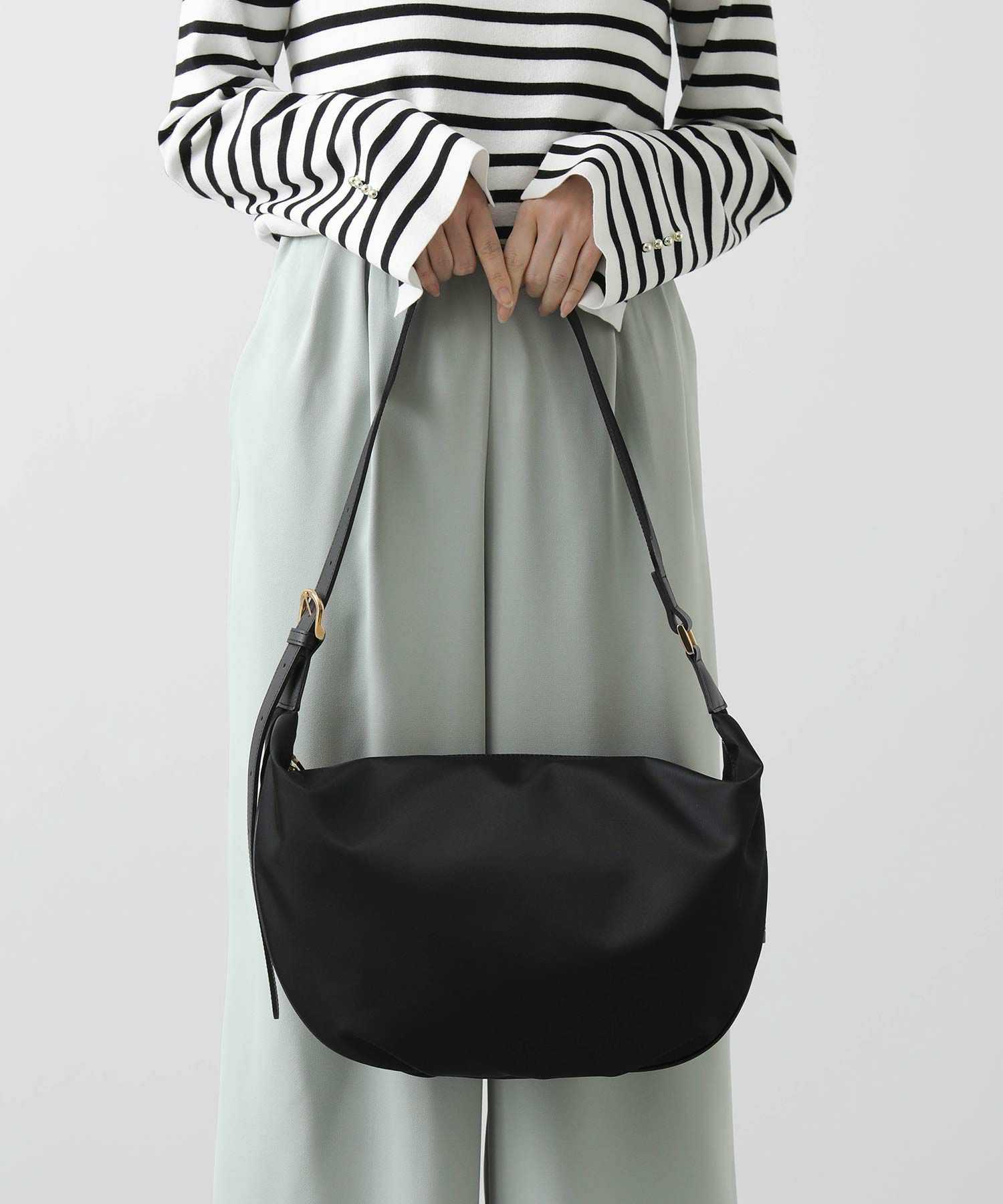 弱撥水性のあるカジュアルなナイロン素材にレザーのショルダーベルトの組み合わせが上品なボディバッグ。さり気ないゴールドパーツも華やかなアクセントに。