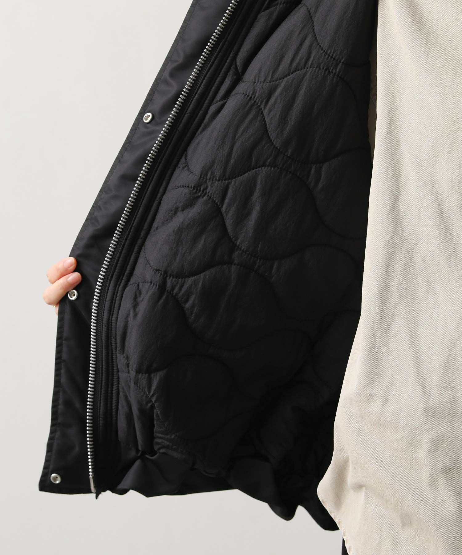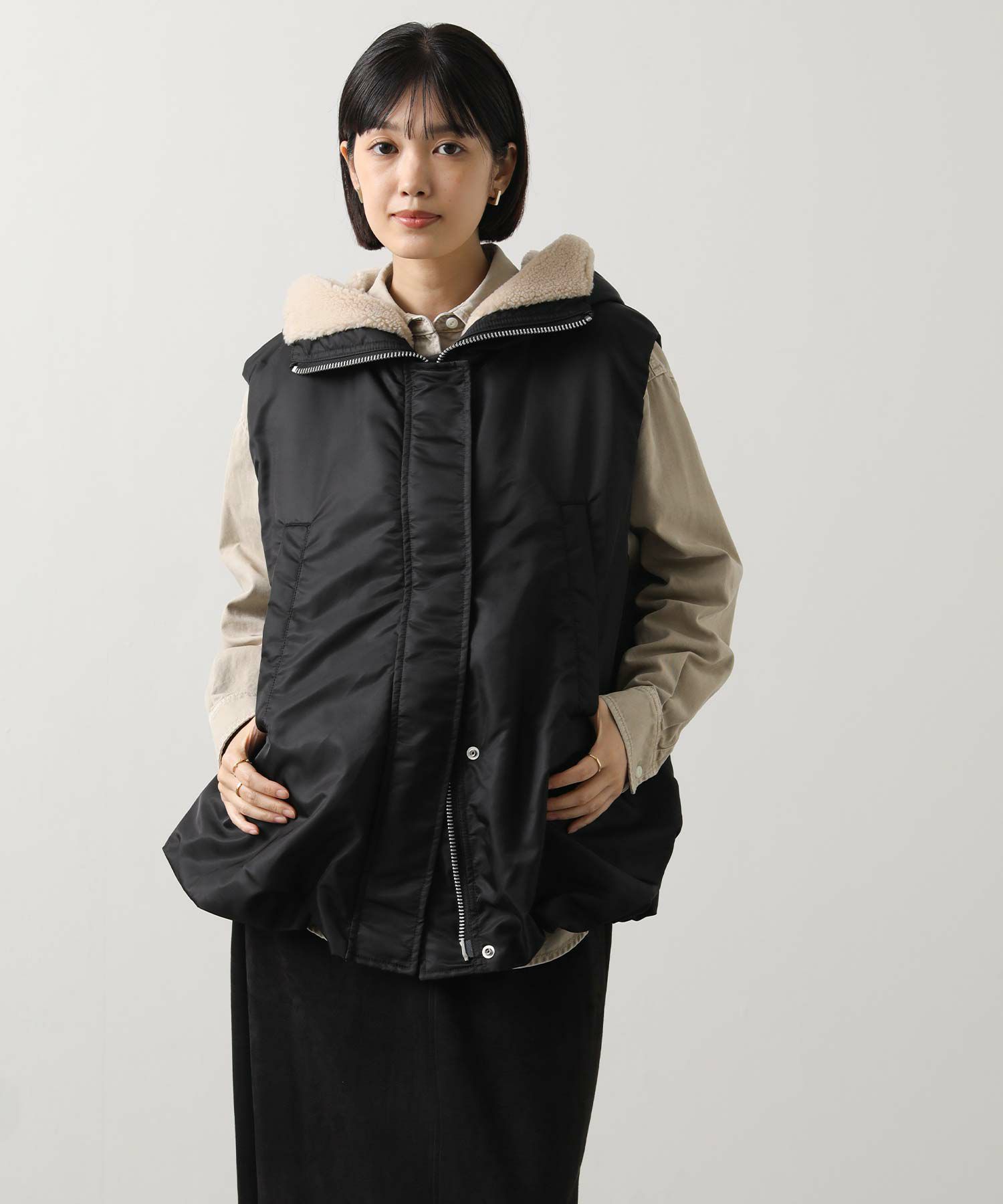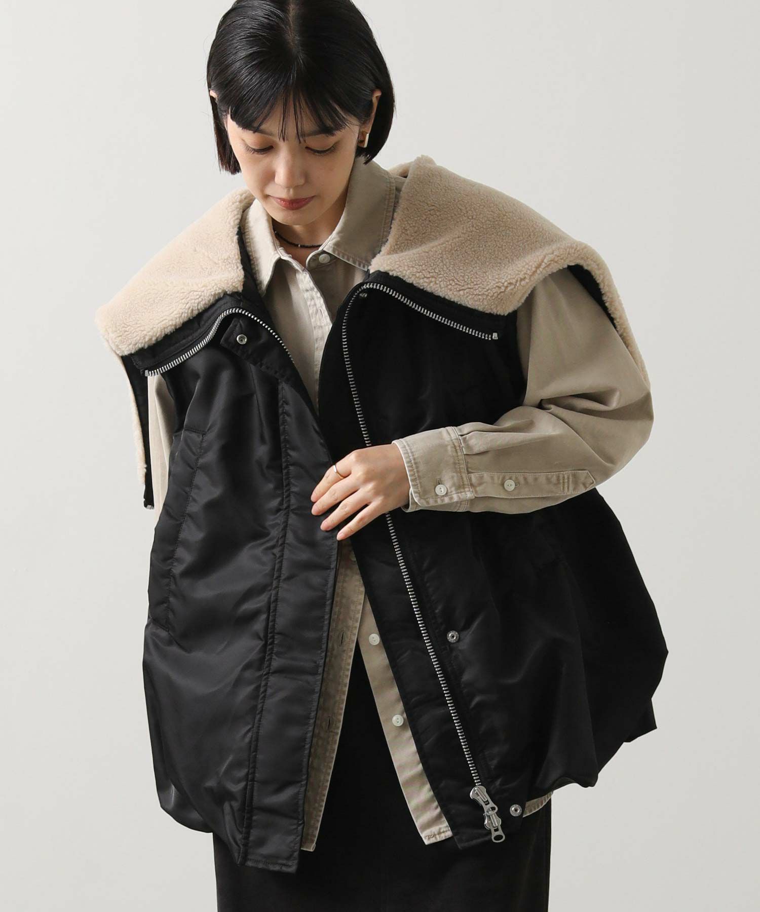 【Munich(ミューニック】から、ミリタリーなデザインを施したナイロン×ボア×中綿のコンビの、丸みあるフォルムで女性らしさを感じられるベストをセレクト。