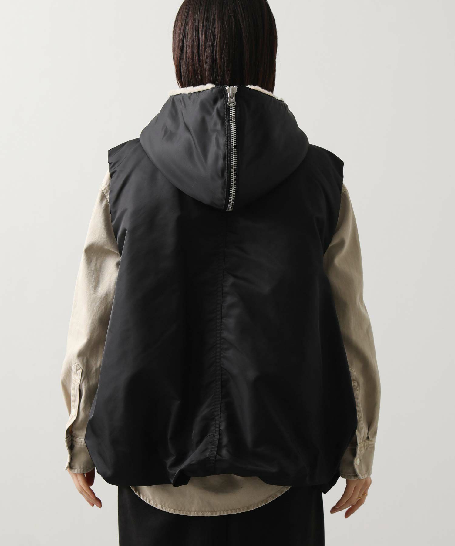 N2BやN3Bなどのフライトジャケットをデザインのベースにしたベストで、コールゴムギャザーとタックによるバルーンヘムでシルエットにアクセントを加えました。