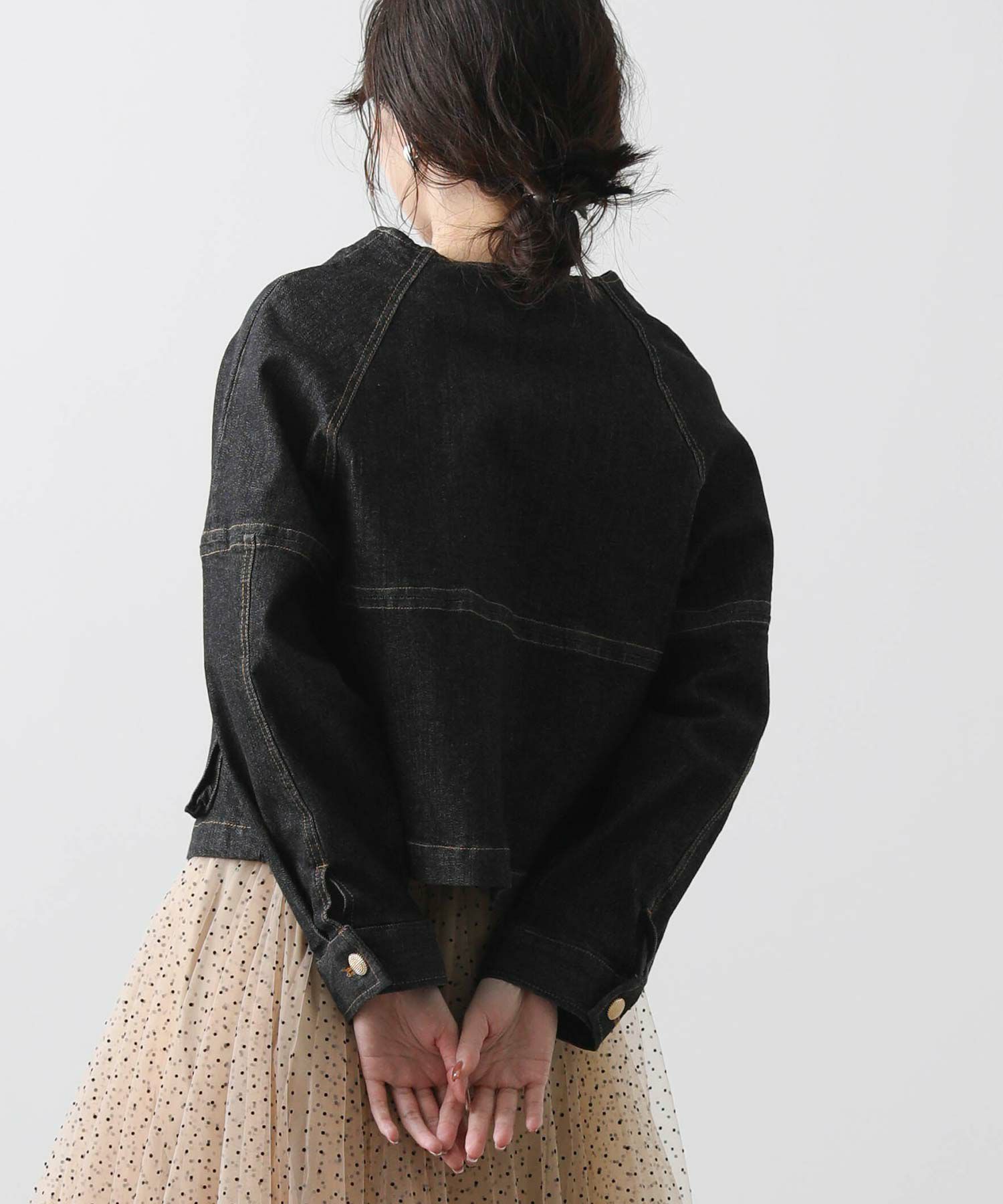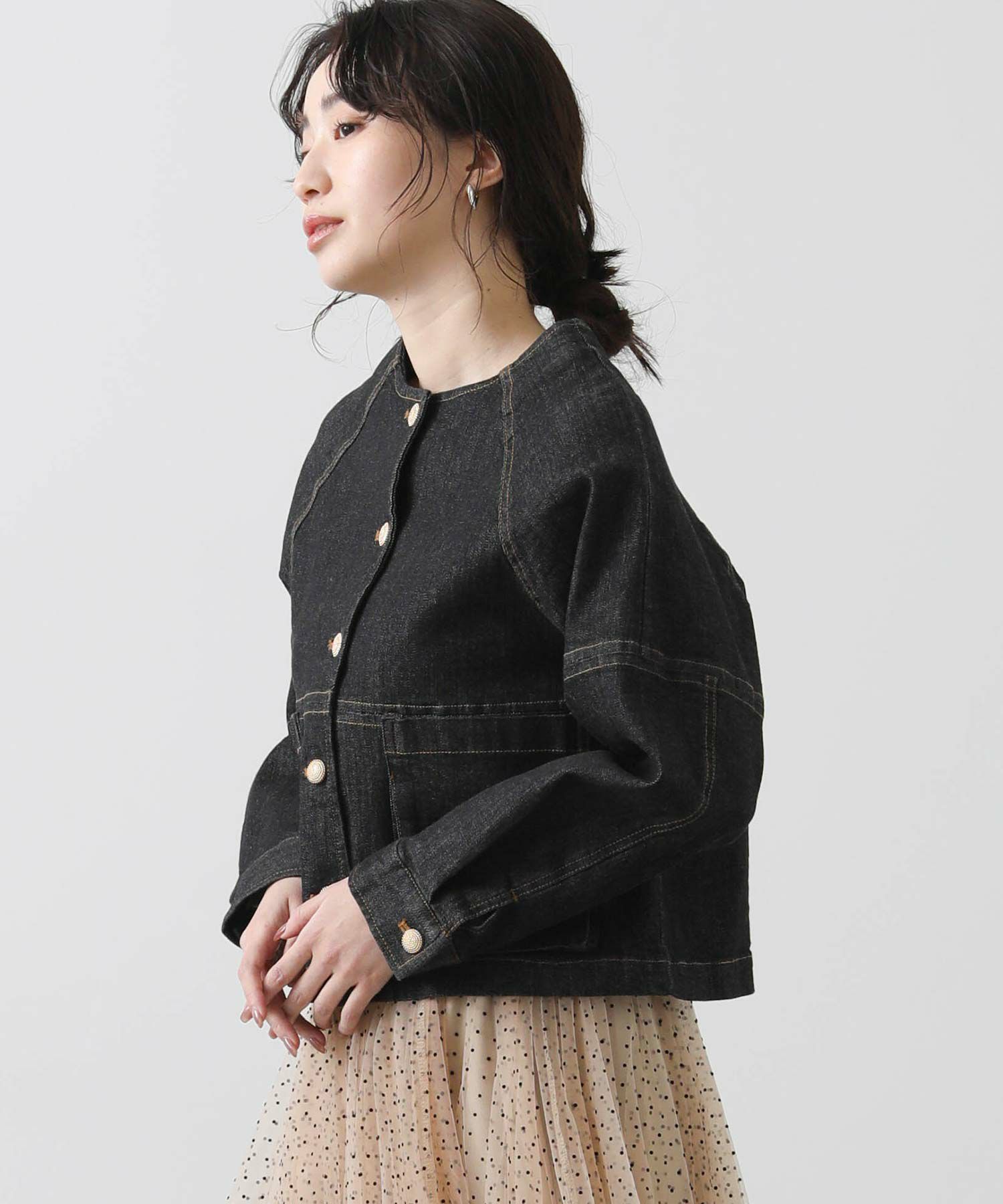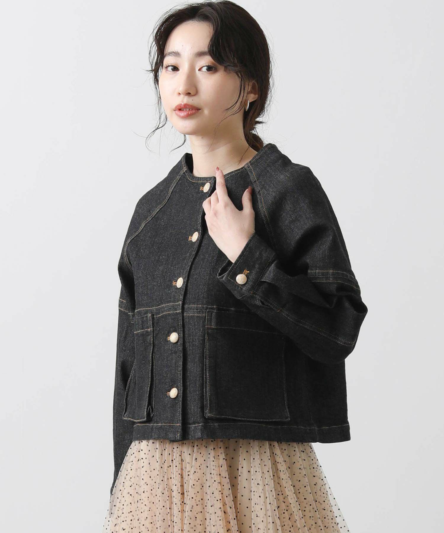 デニムのカジュアル感を楽しみつつ、女性らしい着こなしにもマッチするノーカラーデニムジャケット。