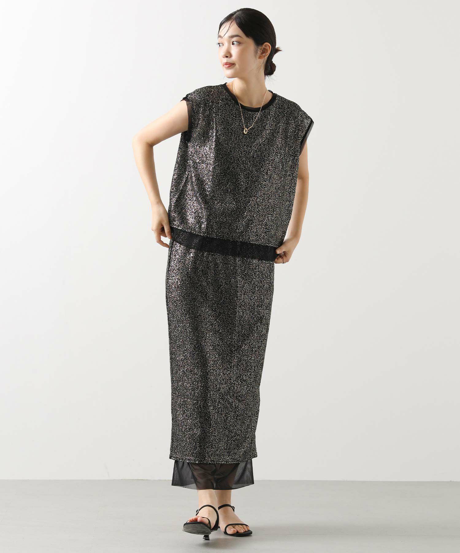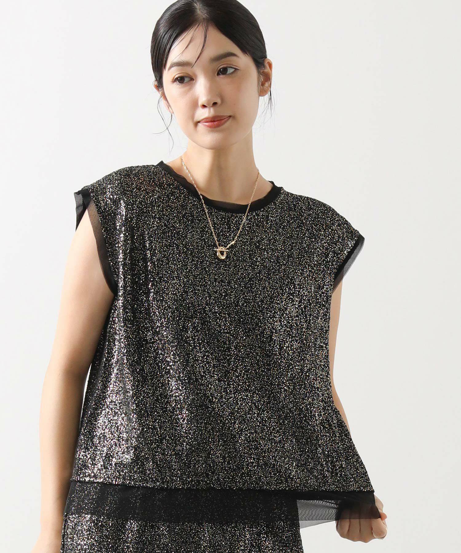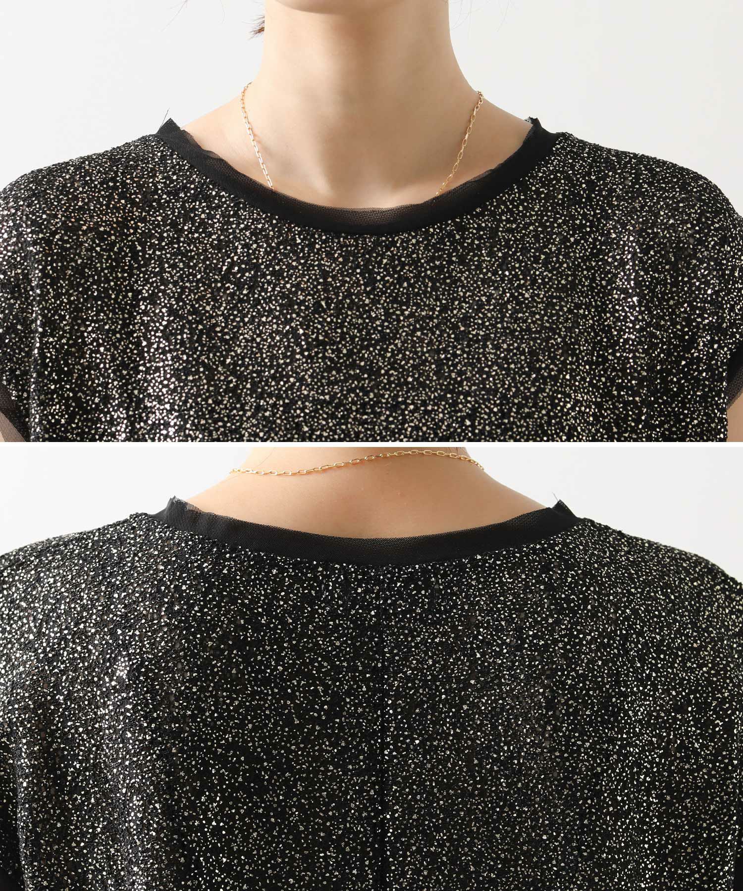 凹凸感のあるストレッチカットソーに、箔プリントが施された華やかな素材を使用して、袖口と裾に軽やかなシアーチュールをドッキングさせています。