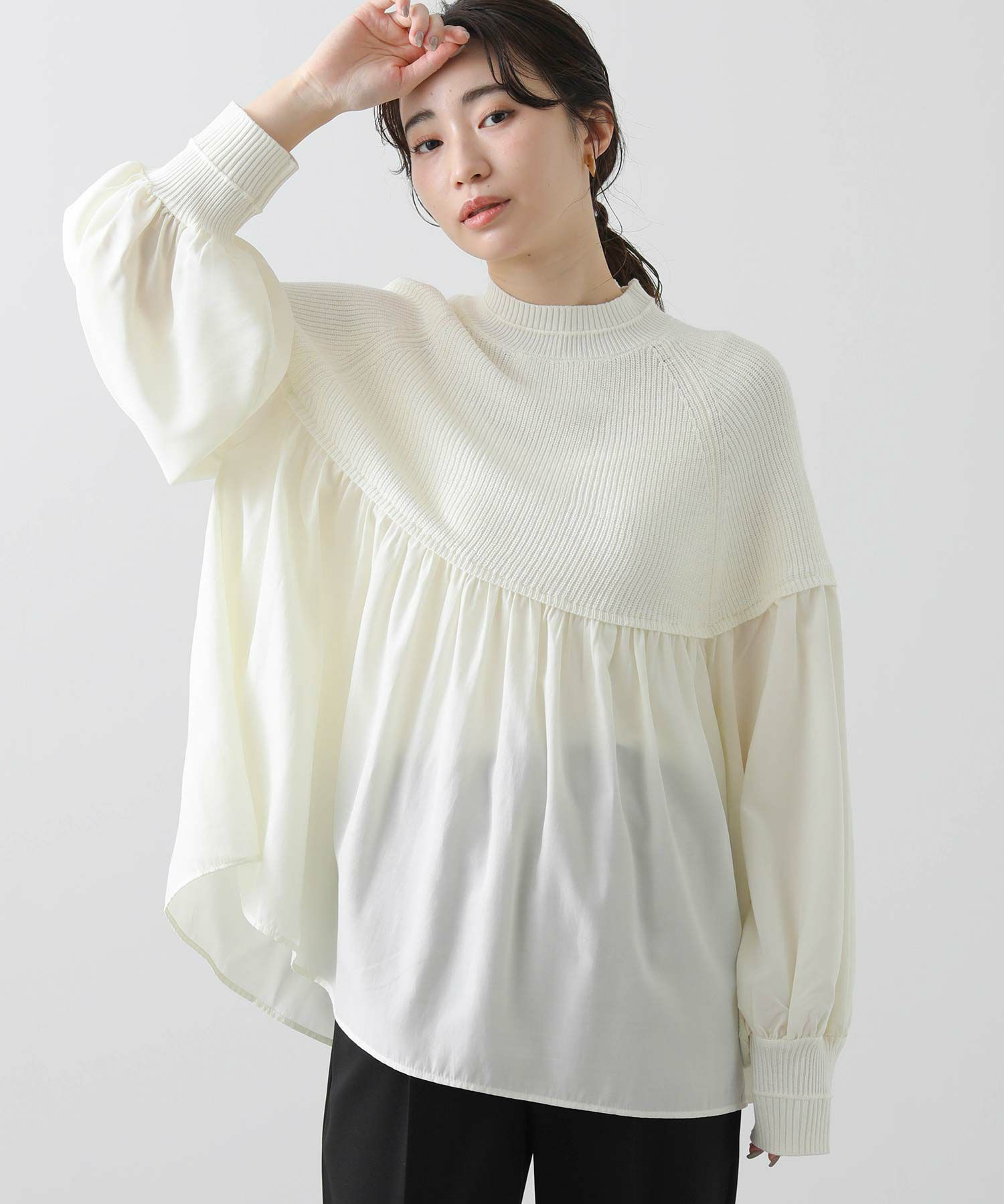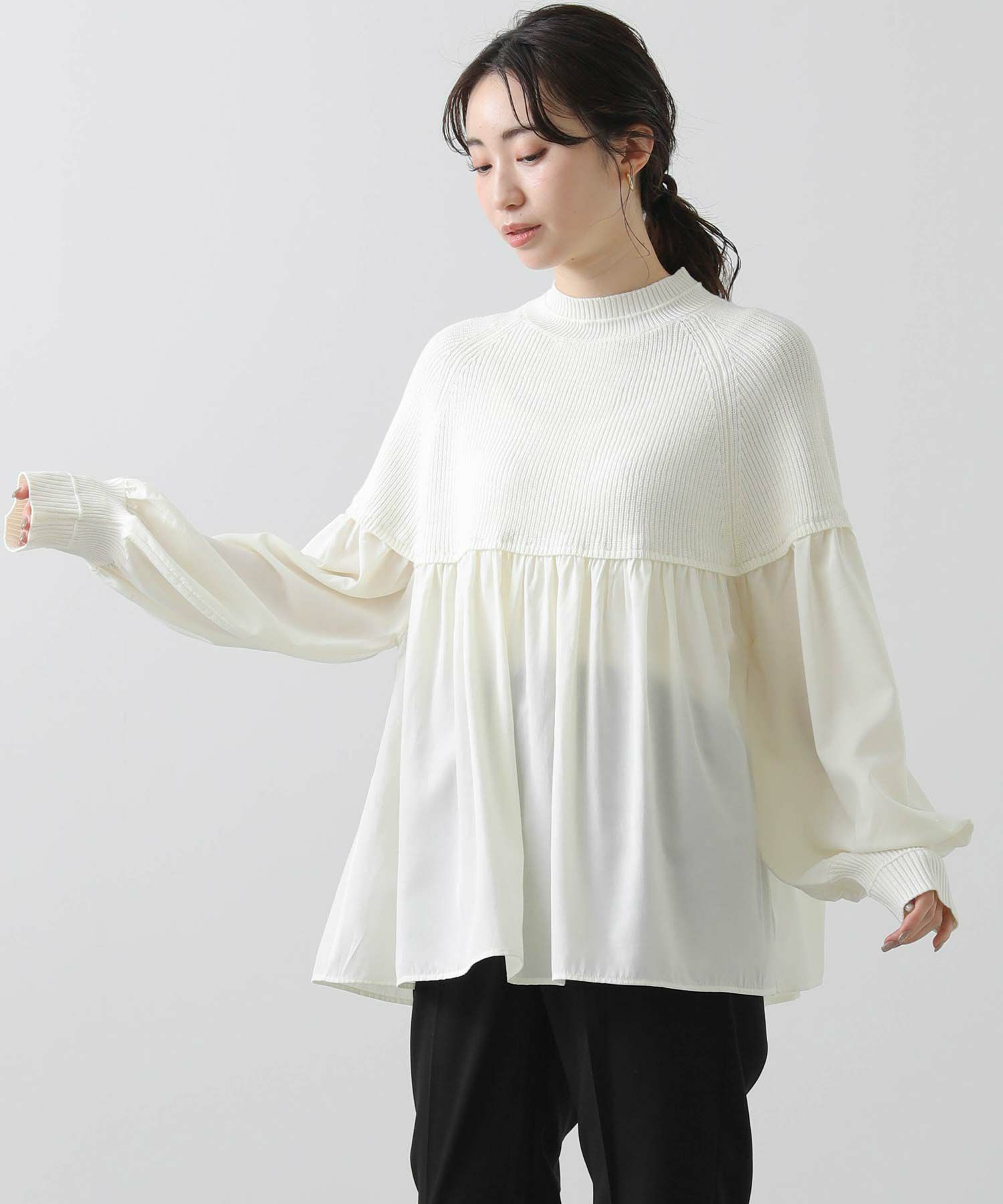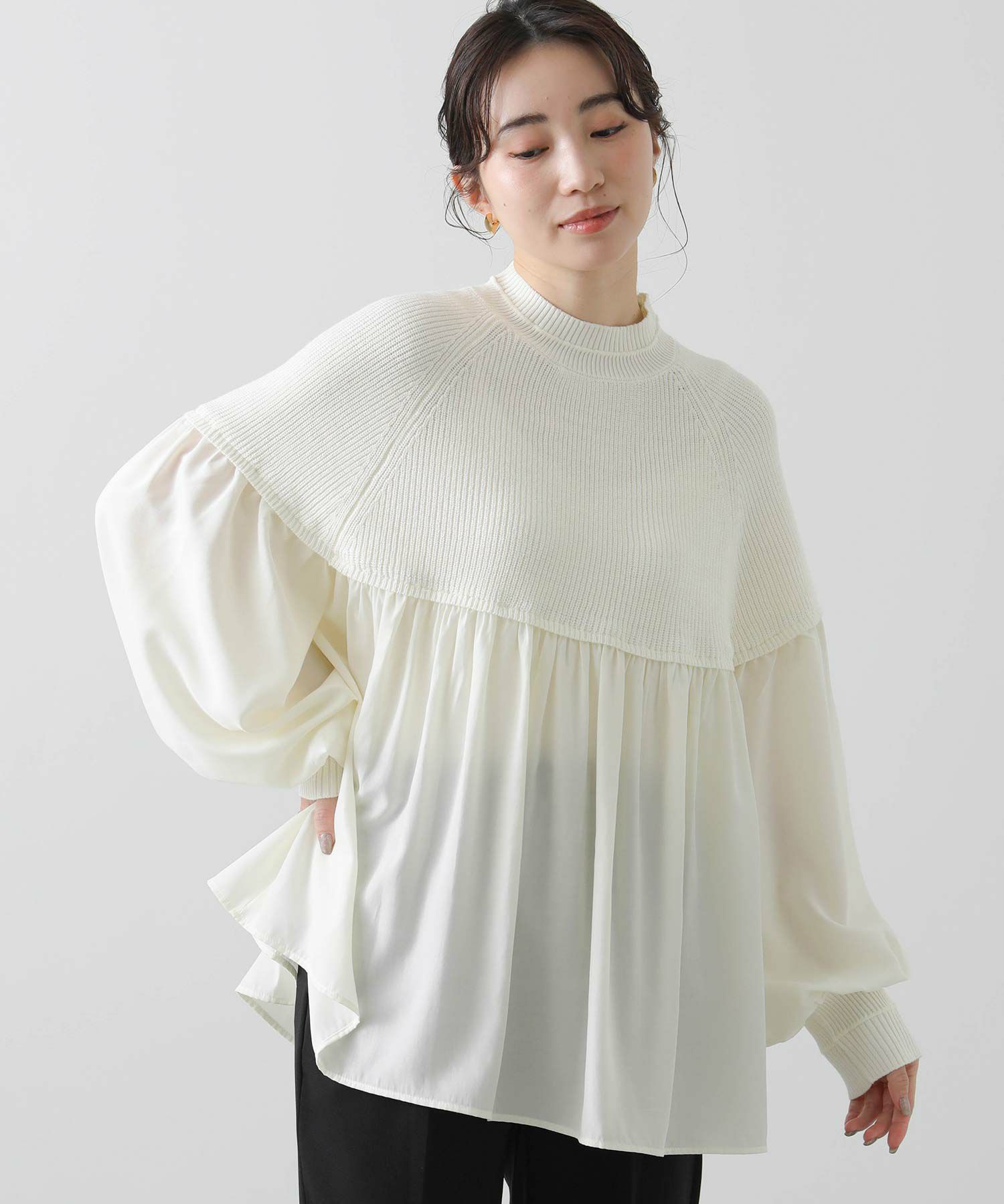 柔らかいニットとブラウス生地のドッキングニットは、どちらも柔らかく肌触りの良い素材で着心地も◎合わせるボトム次第でキレイ目にもカジュアルにも着回せる1枚で、シンプルながら存在感のあるアイテムです。
