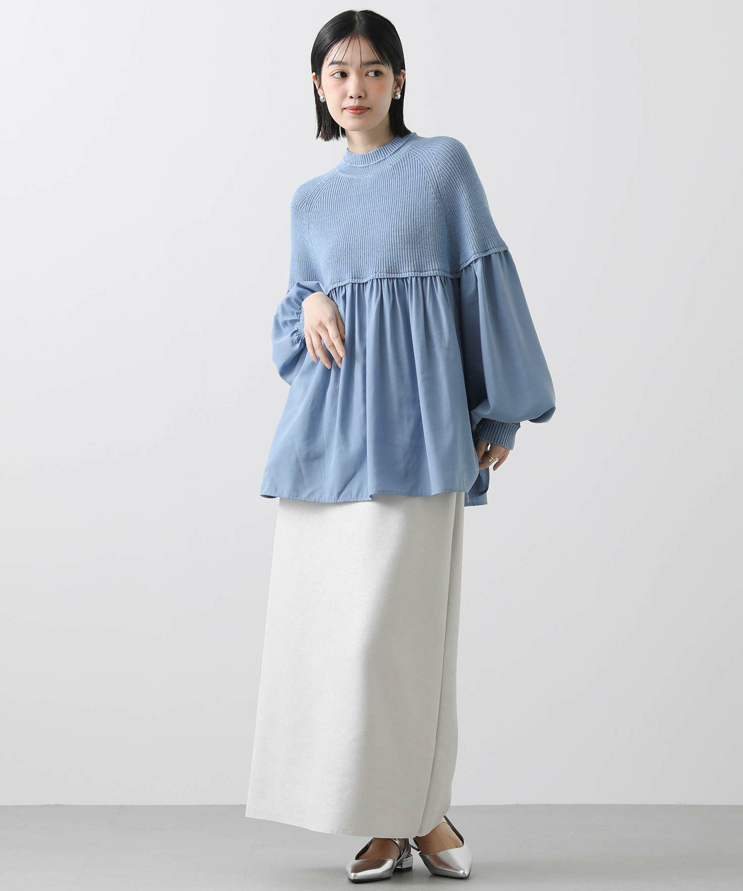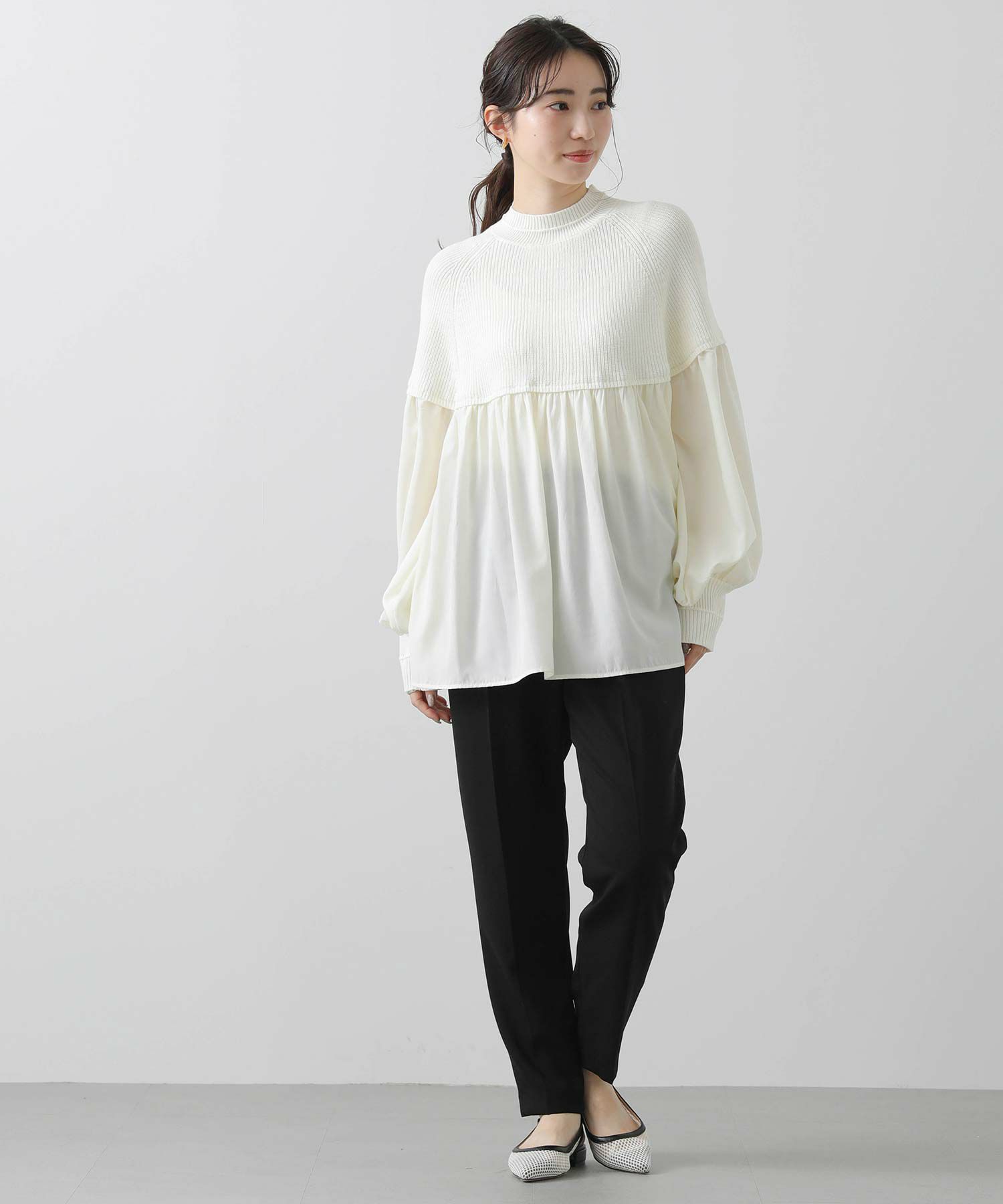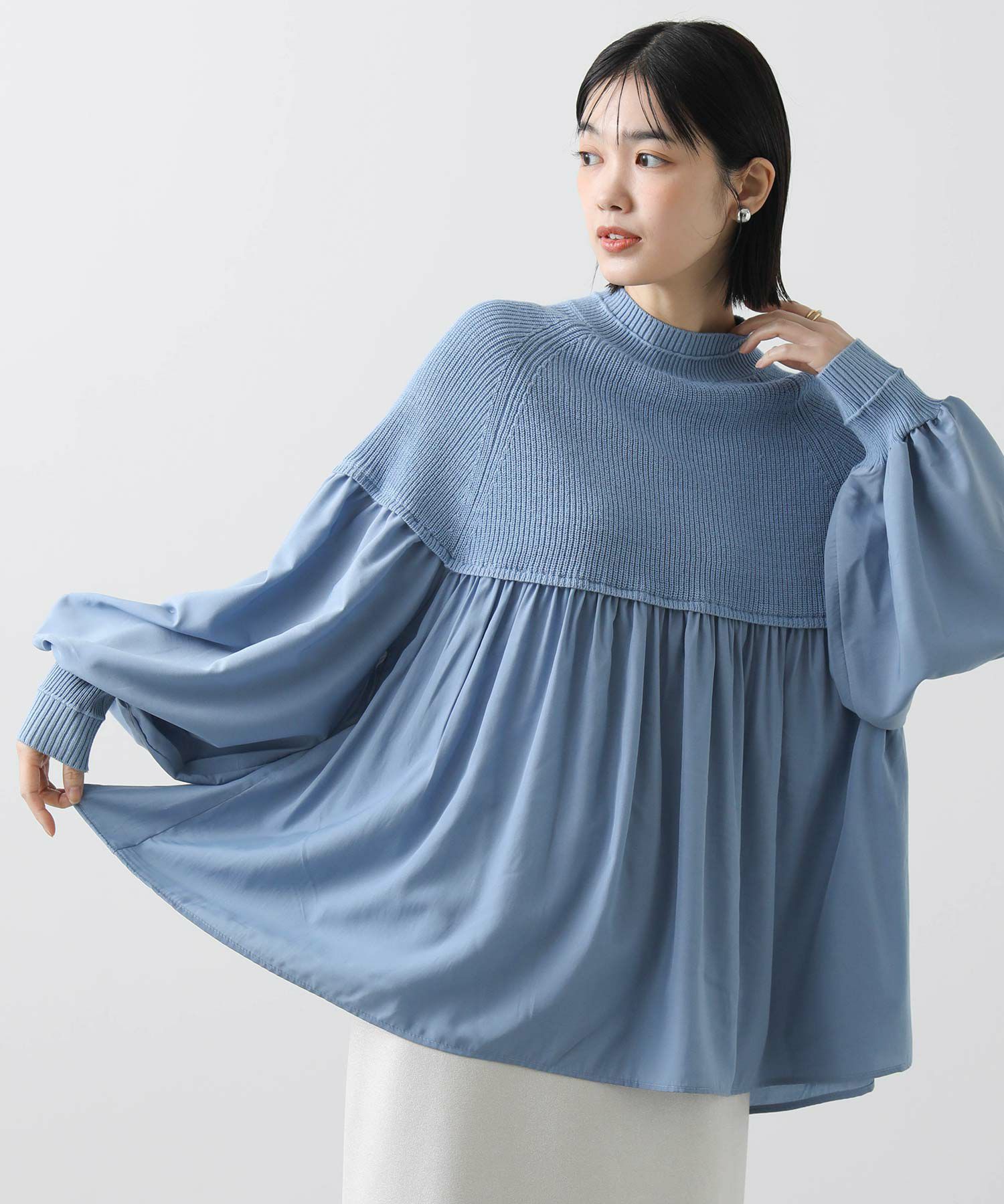 柔らかいニットとブラウス生地のドッキングニットは、どちらも柔らかく肌触りの良い素材で着心地も◎合わせるボトム次第でキレイ目にもカジュアルにも着回せる1枚で、シンプルながら存在感のあるアイテムです。