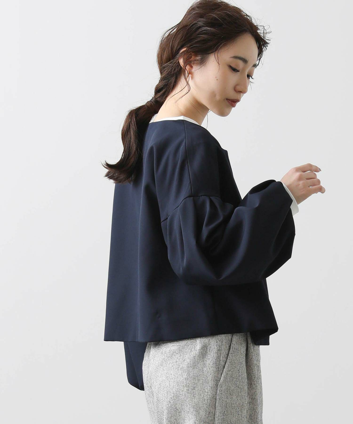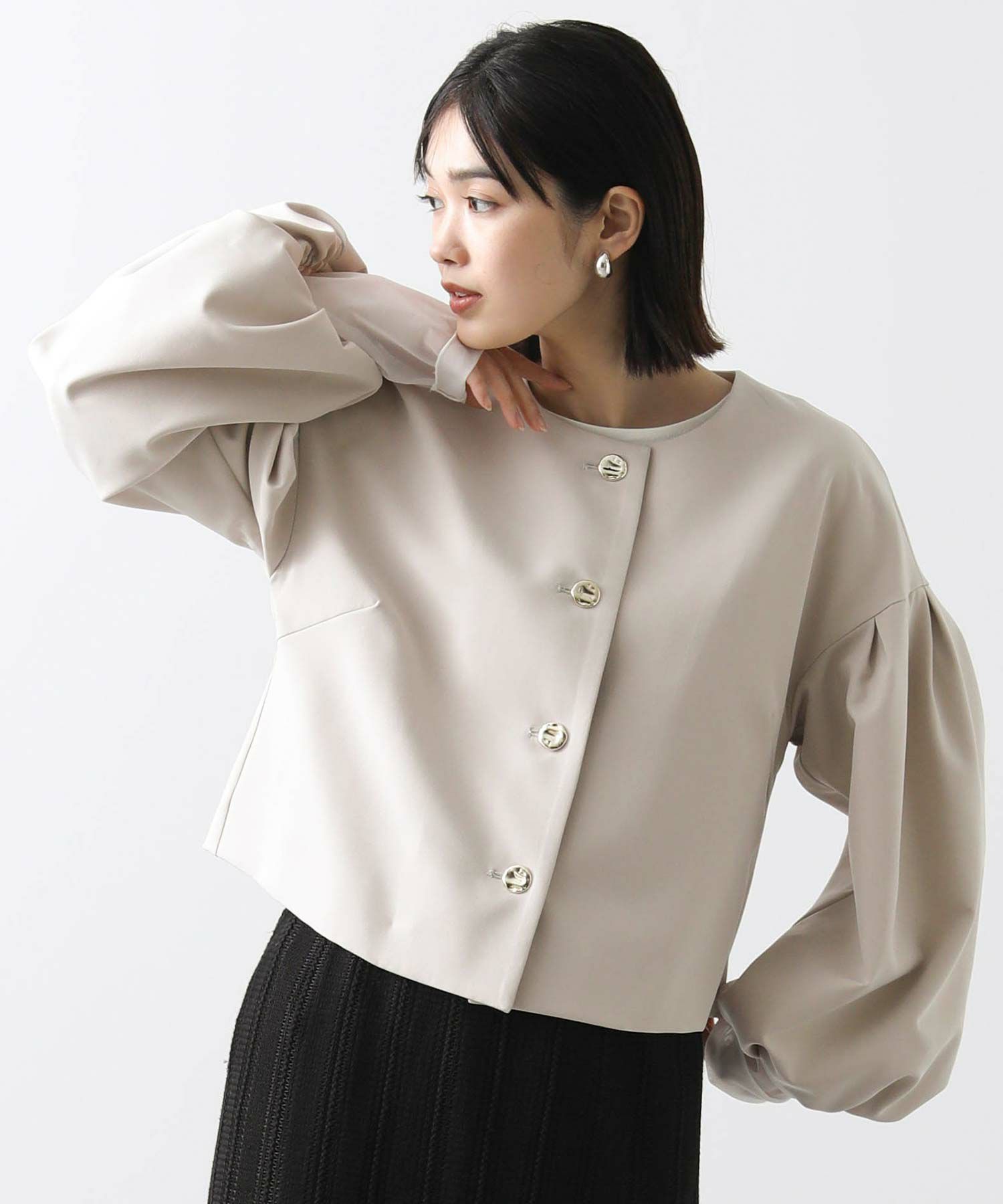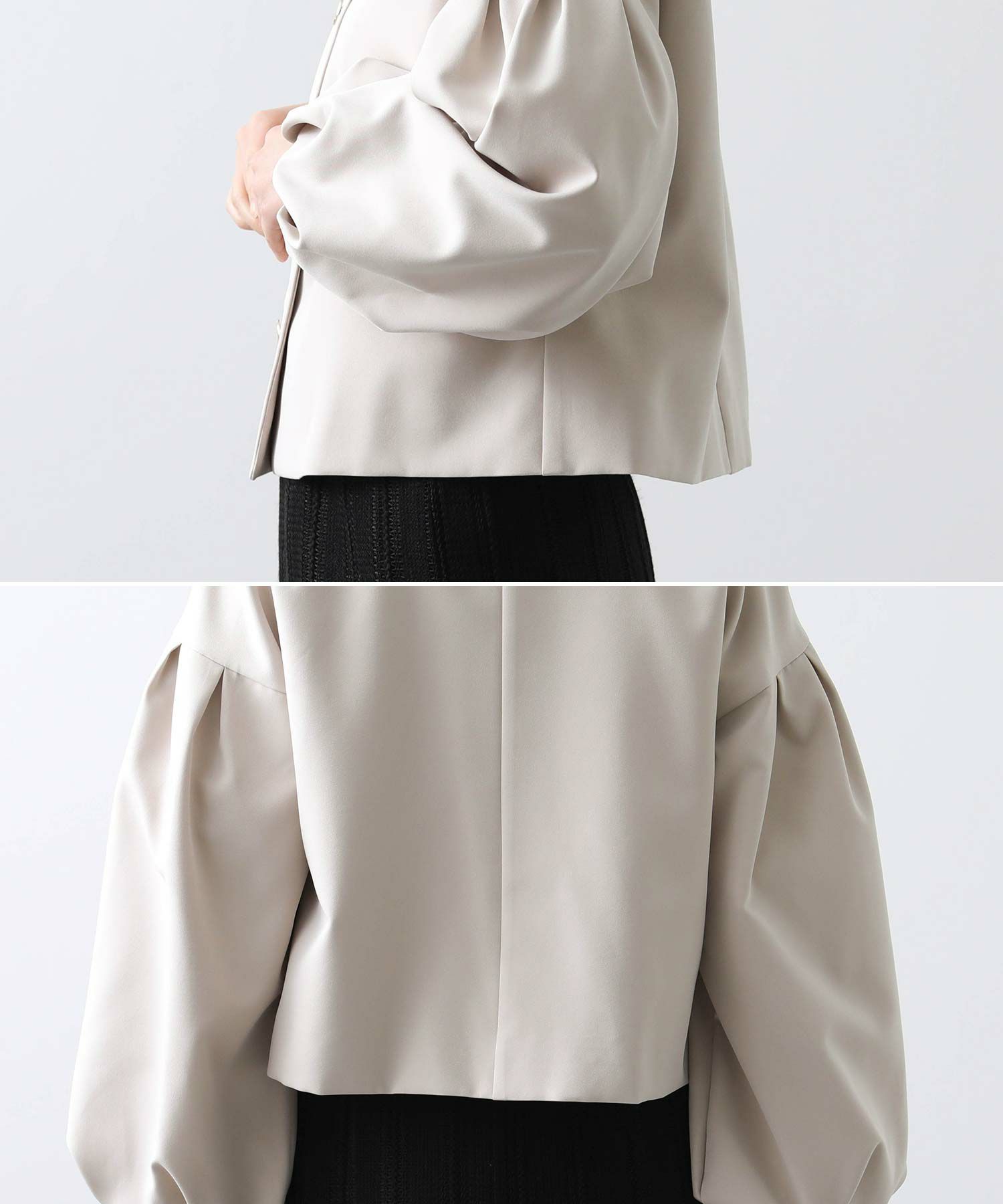 ダブルクロスの程よいハリ感で表現したパフスリーブが今年らしいノーカラージャケットです。パフスリーブでボリュームを出したフェミニンなシルエットがポイント。襟元はシンプルに仕立てることですっきりとした上品さを醸し出しています。