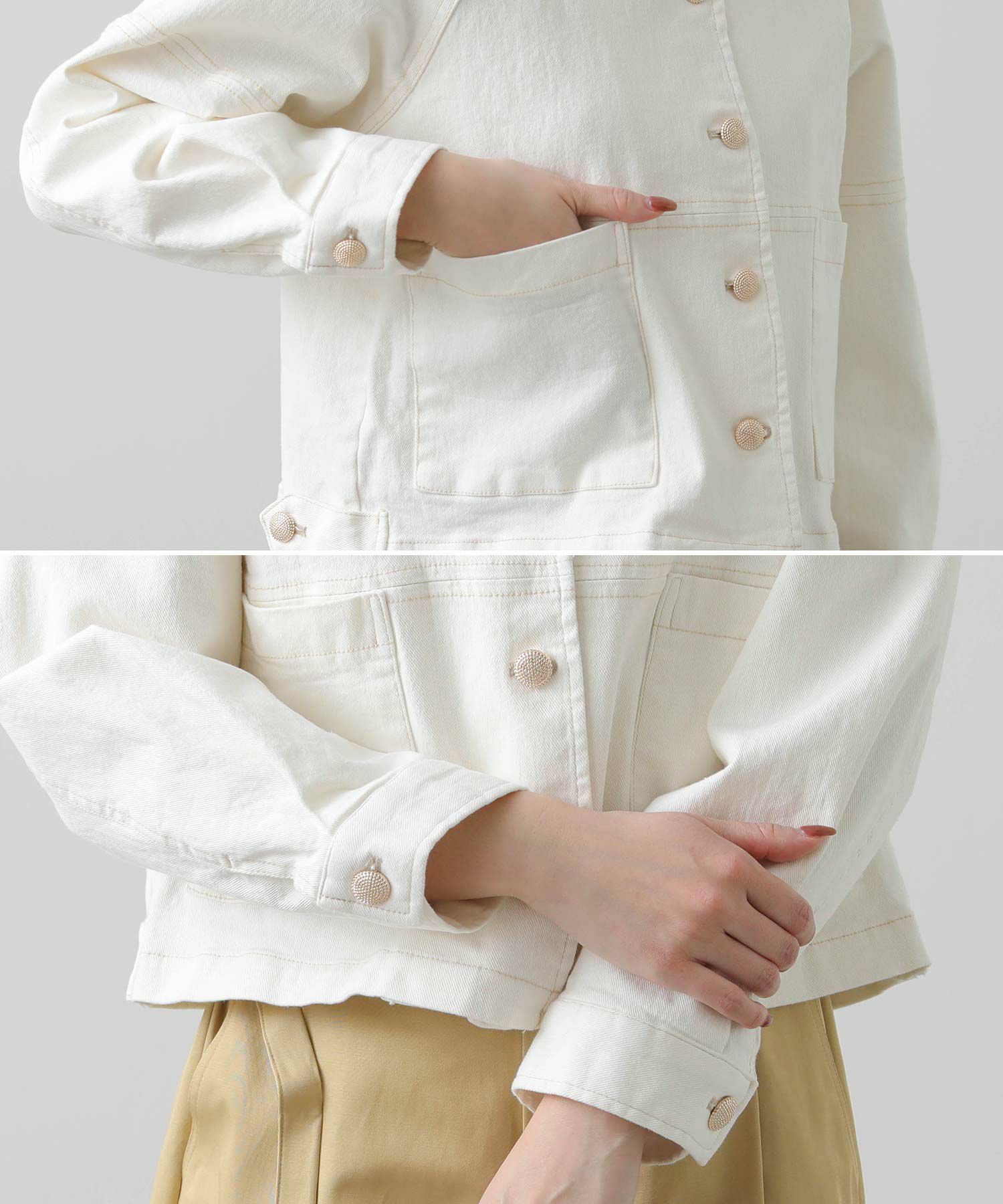 デニムのカジュアル感を楽しみつつ、女性らしい着こなしにもマッチするGジャン。襟付きだと、前を開けて着た時にサマになります。存在感のあるゴールド釦や配色ステッチがポイントでシンプルになり過ぎず、ストレッチが効いているので着心地が良いのも特徴です。