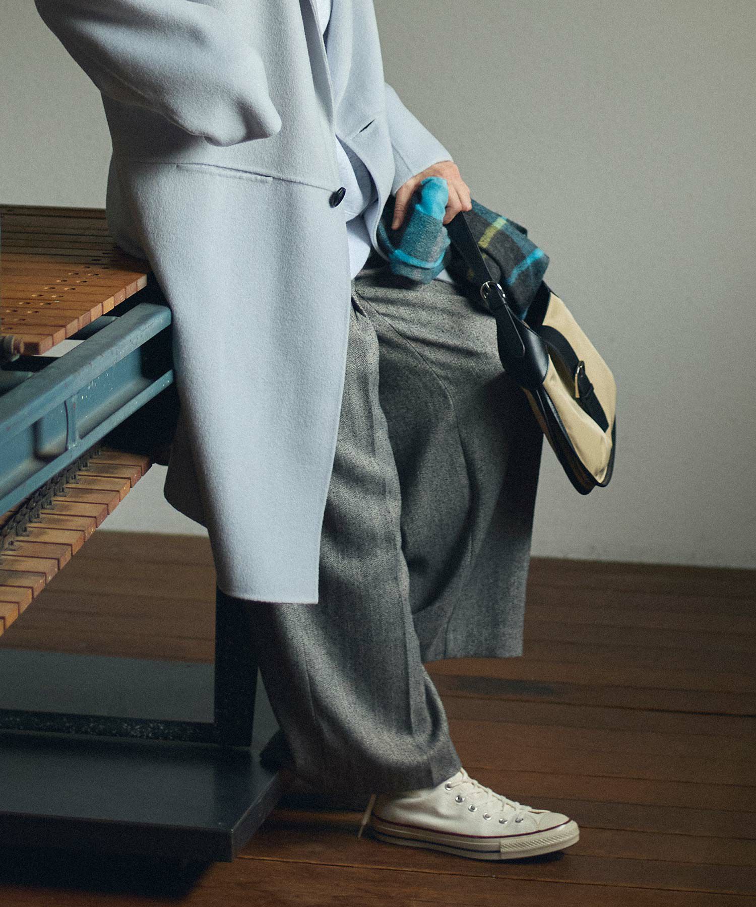 ハイウエストで脚長効果があり、フロントのタックとセンタープレスが美しいシルエットを強調、スッキリとしたラインを演出。